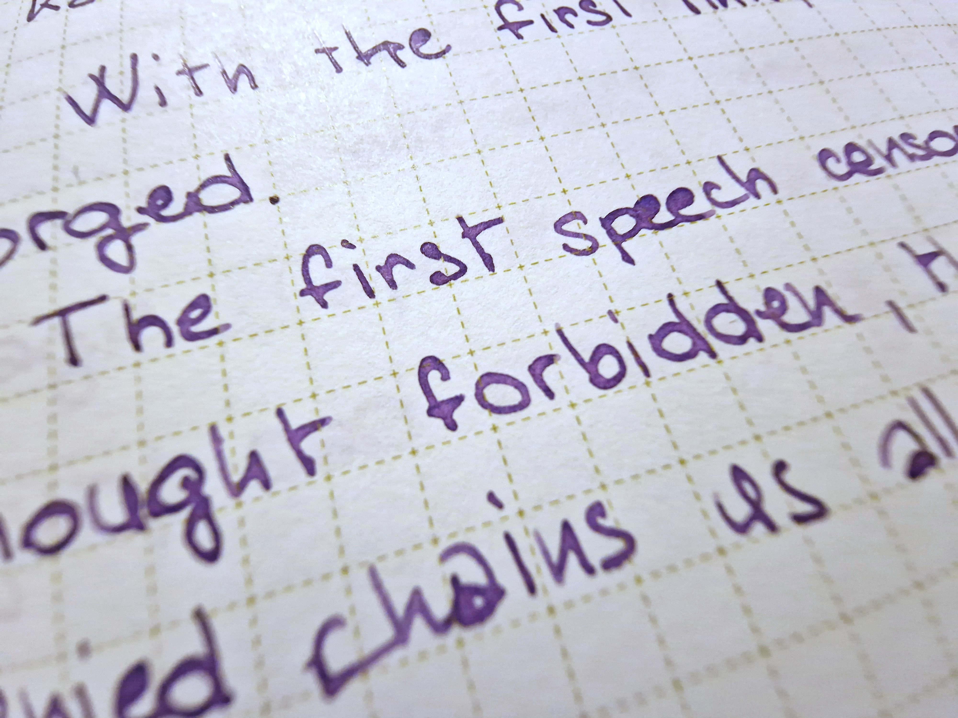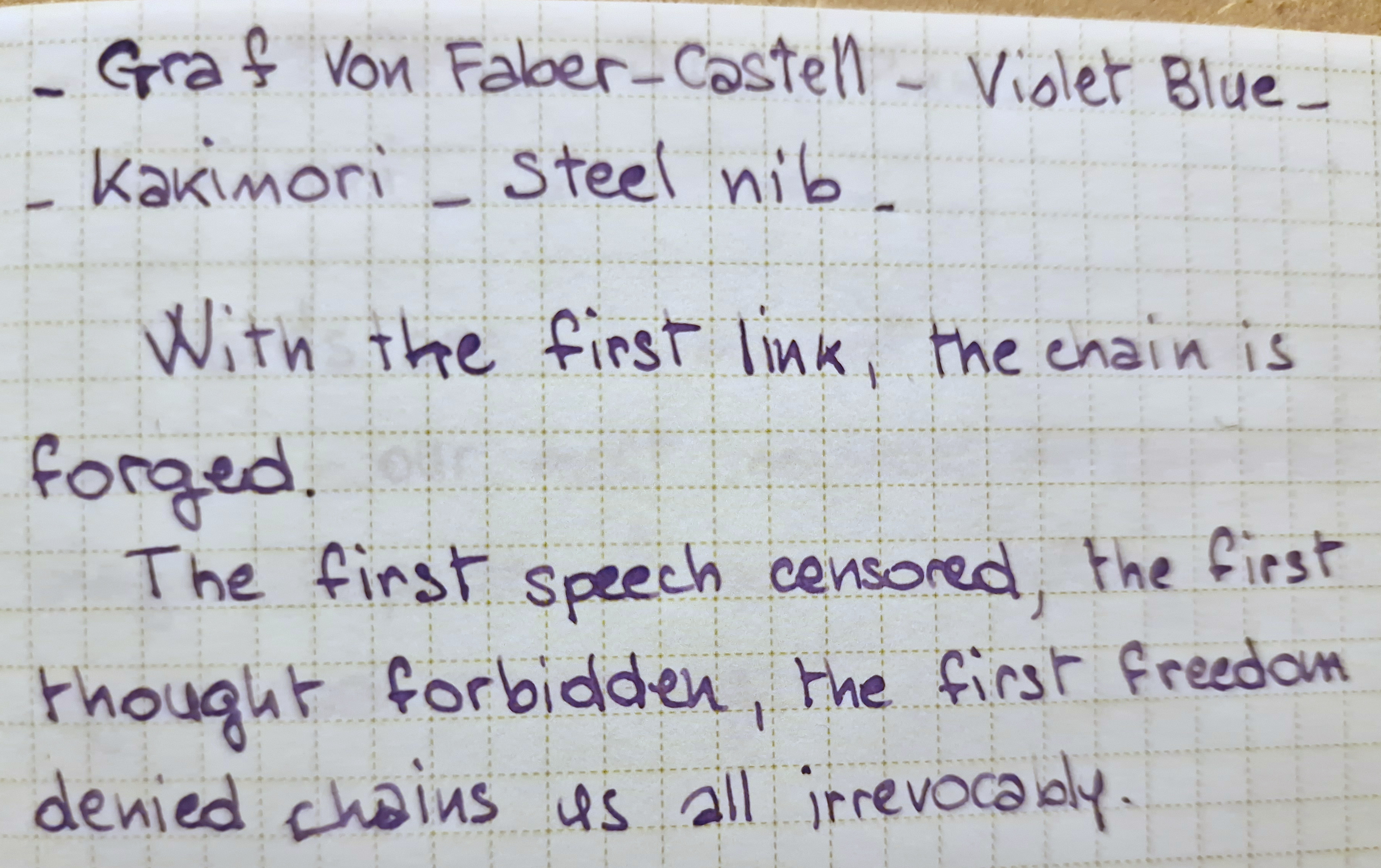 Violet Blue, probabilmente, non è unico nel suo genere ma lo è tra gli inchiostri che sono in mio possesso. Un viola davvero viola su qualunque carta - non troppo scuro, non troppo chiaro - con chromashading, performance buonissima, non è asciutto e anche su carta standard - almeno con pennini fini - non spiuma.