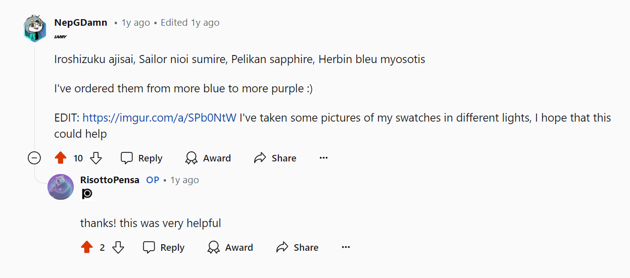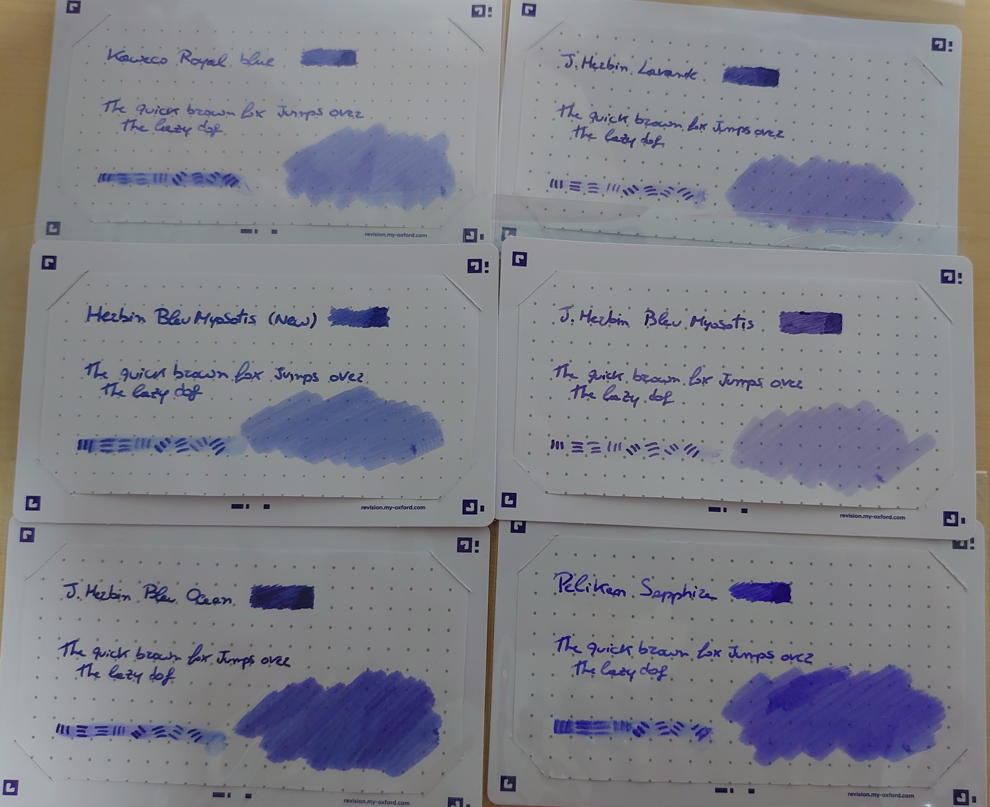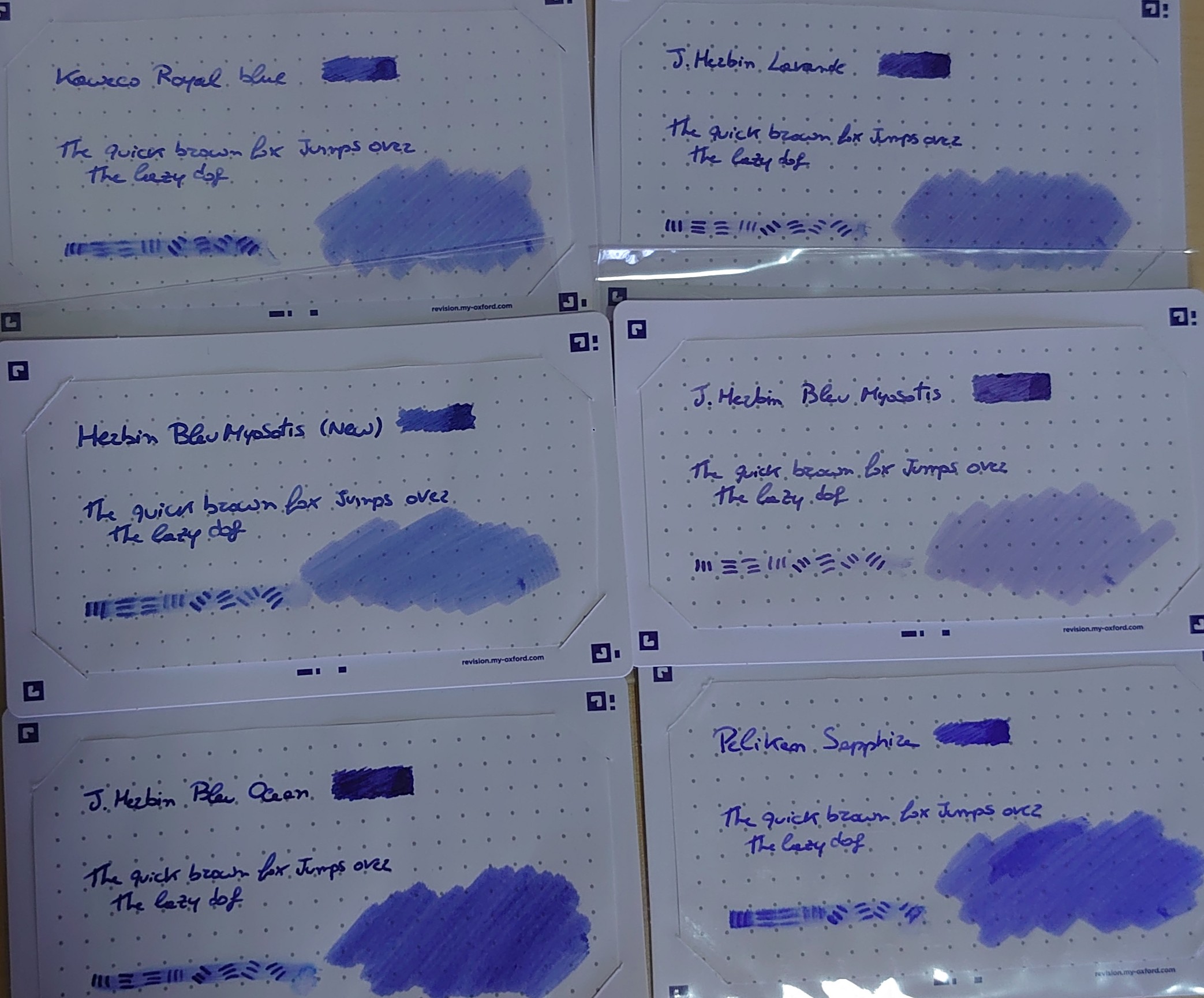 Io ho avuto la mini confezione da 10 ml e poi, per capriccio, presa quella da ( non mi ricordo bene) 500ml; due inchiostri completamente diversi: il primo proprio "slavatello", asciugandosi peggiorava ulteriormente; il secondo un bel blu anche, pennino permettendo, bello intenso. Mi avete fatto venir voglia di caricare una stilo con il myosotis ...