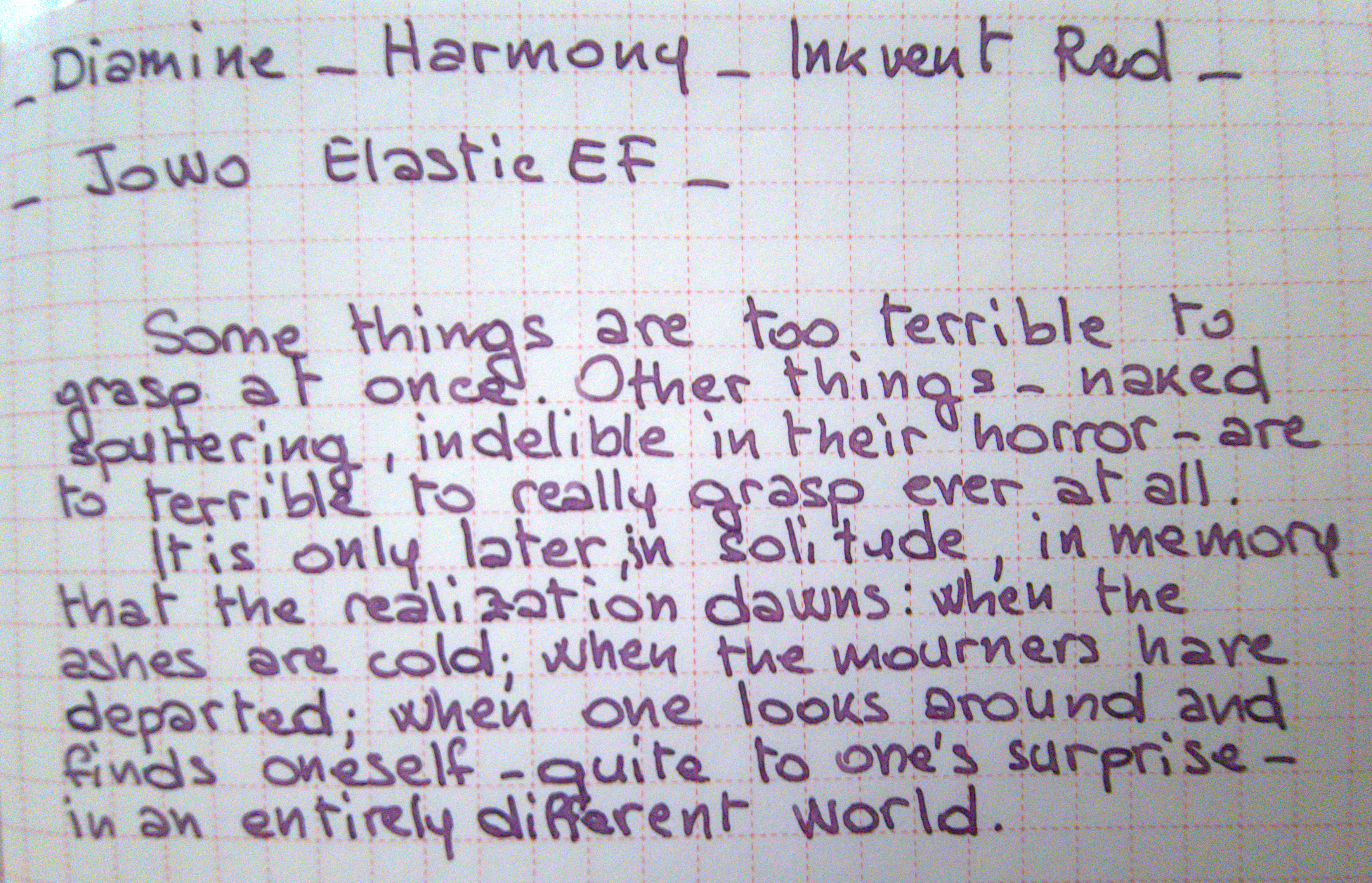 L'inchiostro è un po' sbrodolone. Al momento l'ho caricato in una Jowo Elastic EF (prime due immagini e foto qui sotto) ma il tratto che ne risulta è molto più ampio.