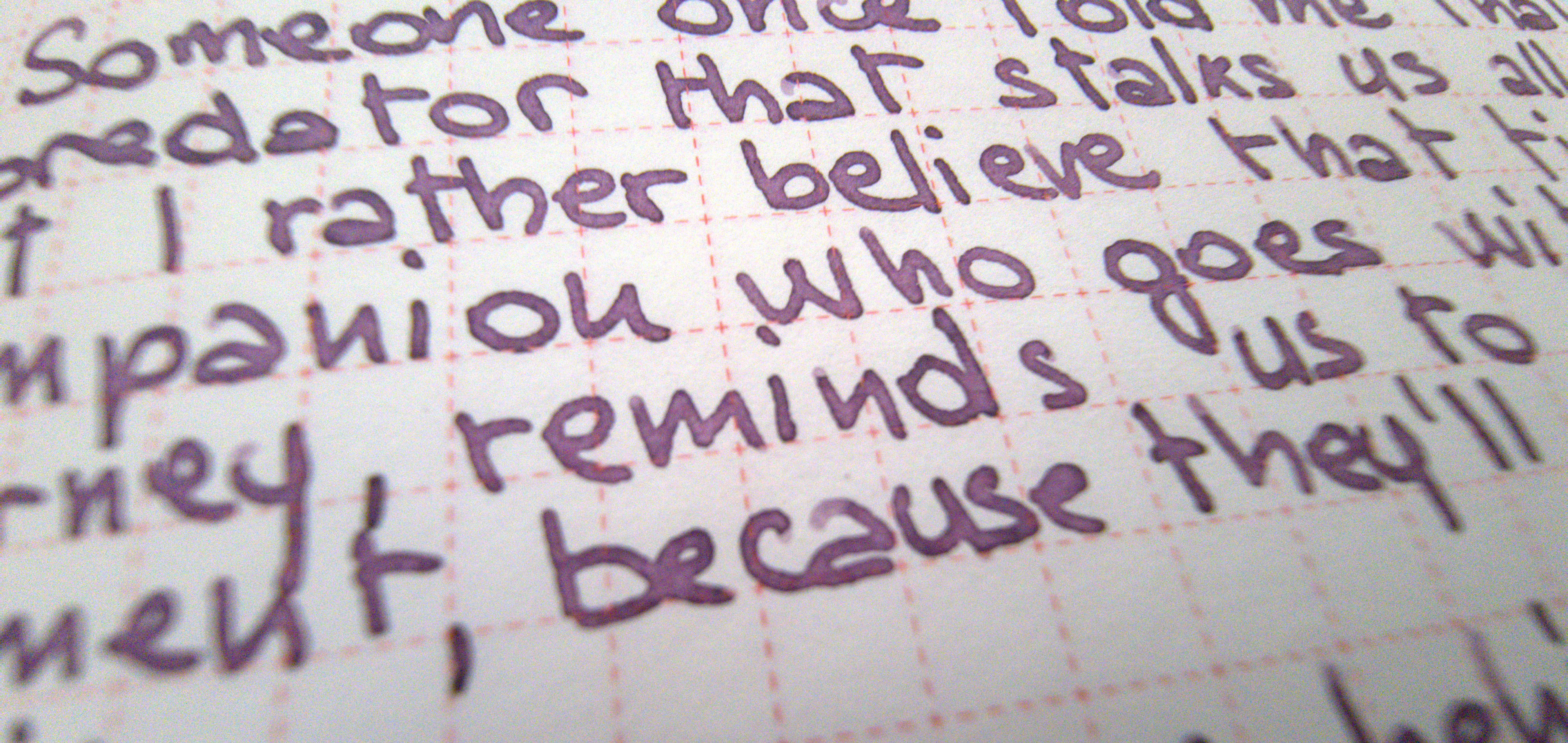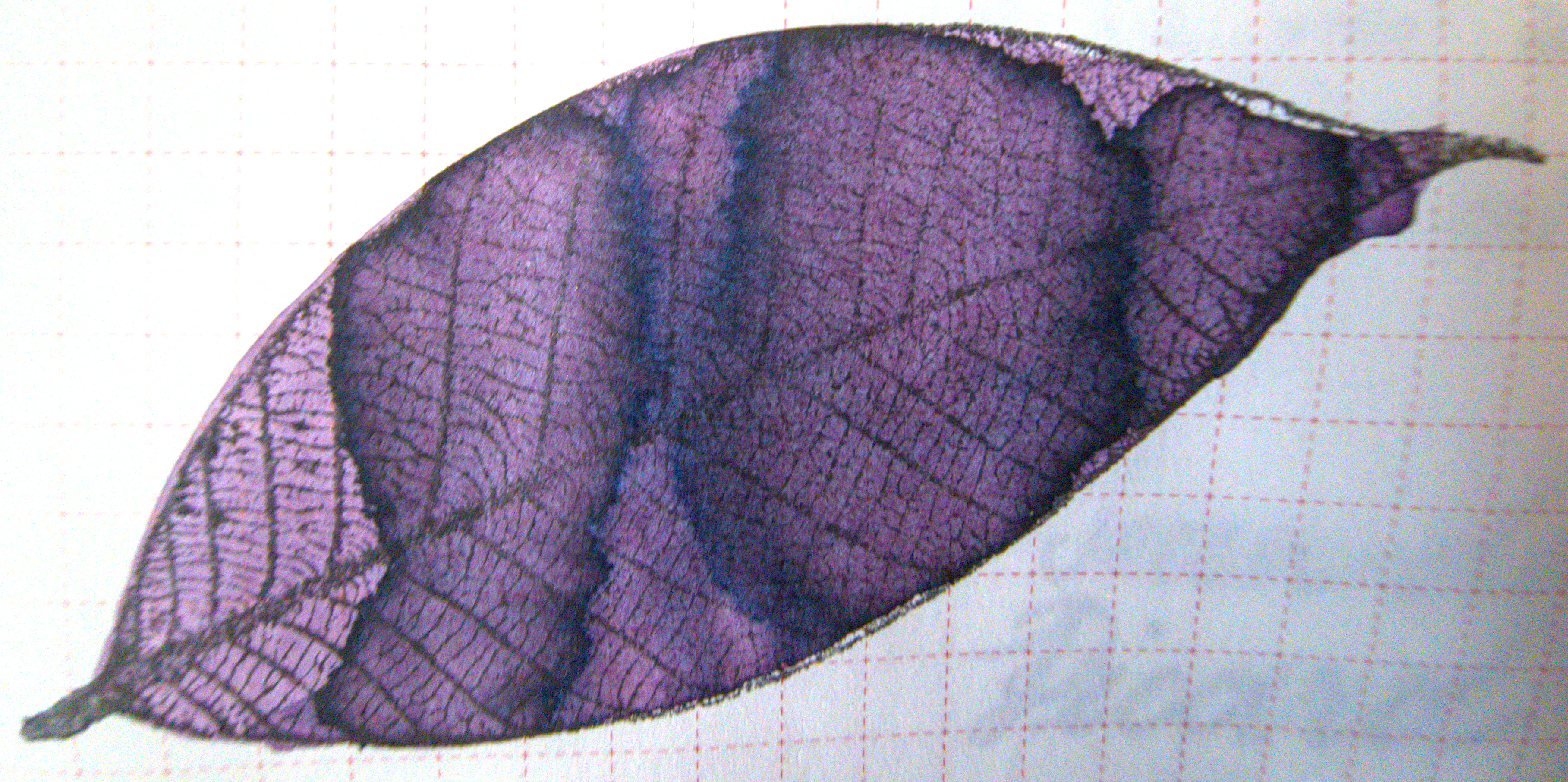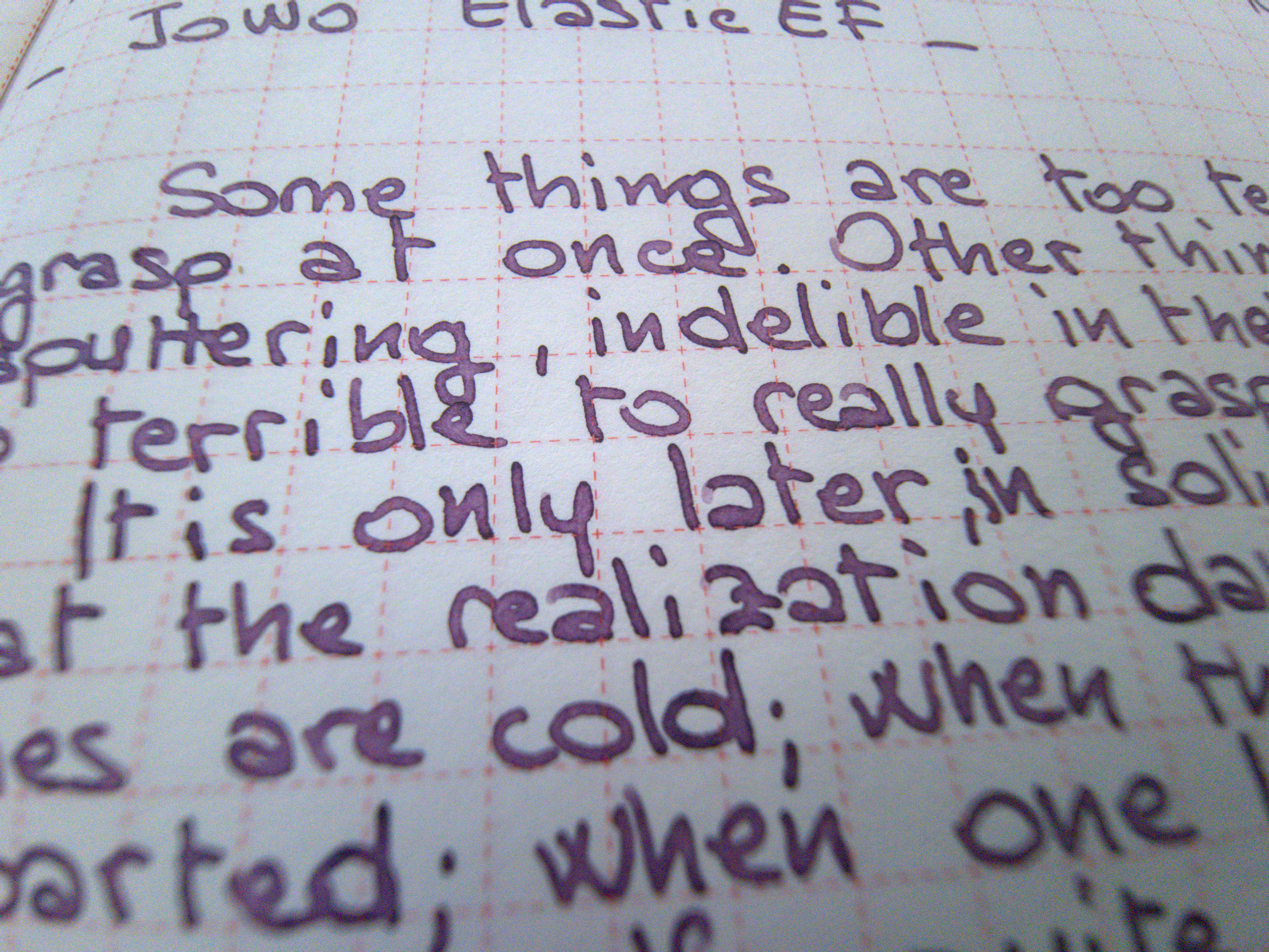 La cosa interessante di questo inchiostro è che più che shading ha un effetto di "haloing", ovvero di alone. Lo scritto, una volta che l'inchiostro si asciuga, si presenta con una bordatura scura, in quello che definirei un blue-black, un blu scuro desaturato, mentre all'interno emerge il viola con tratti di magenta.