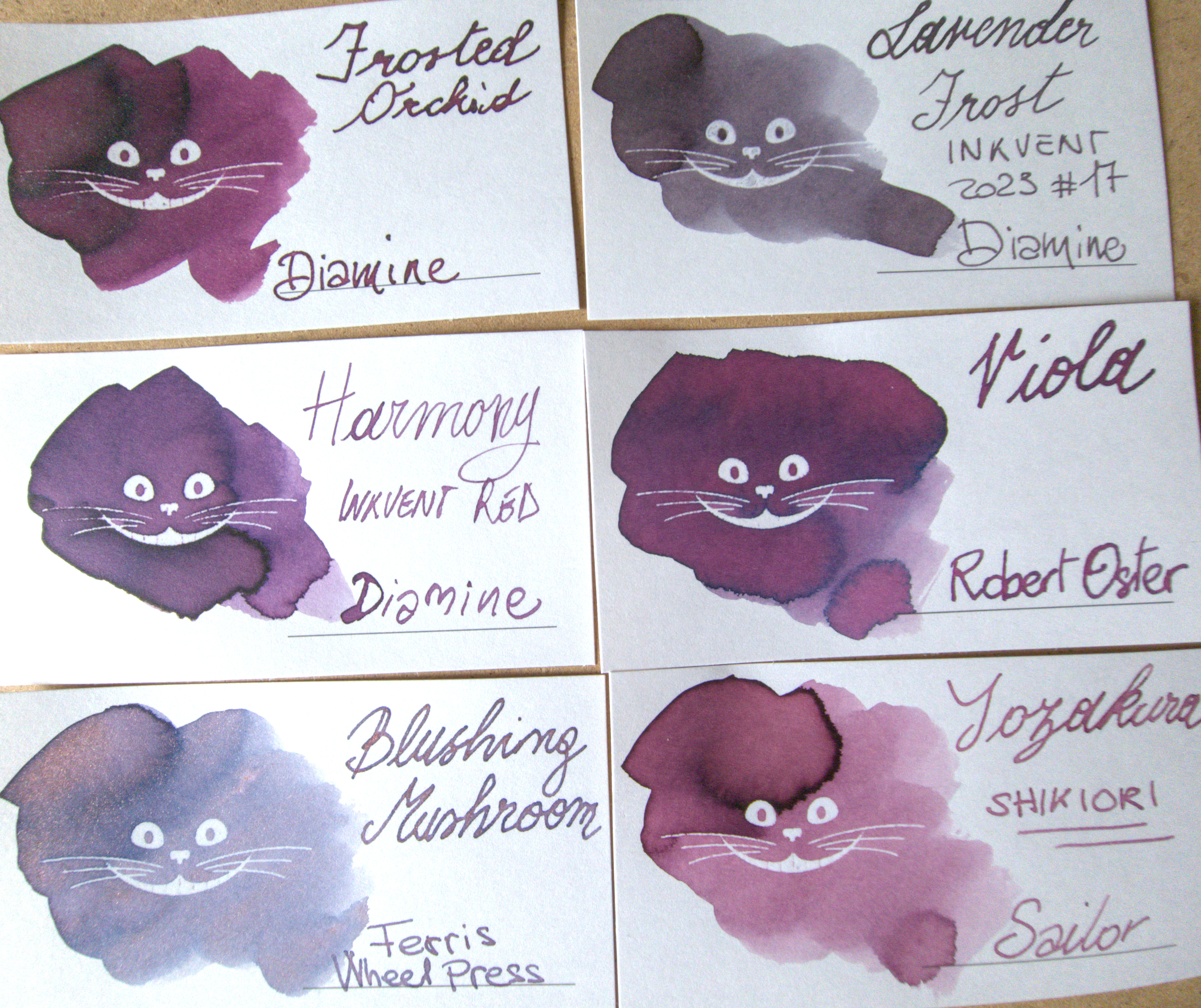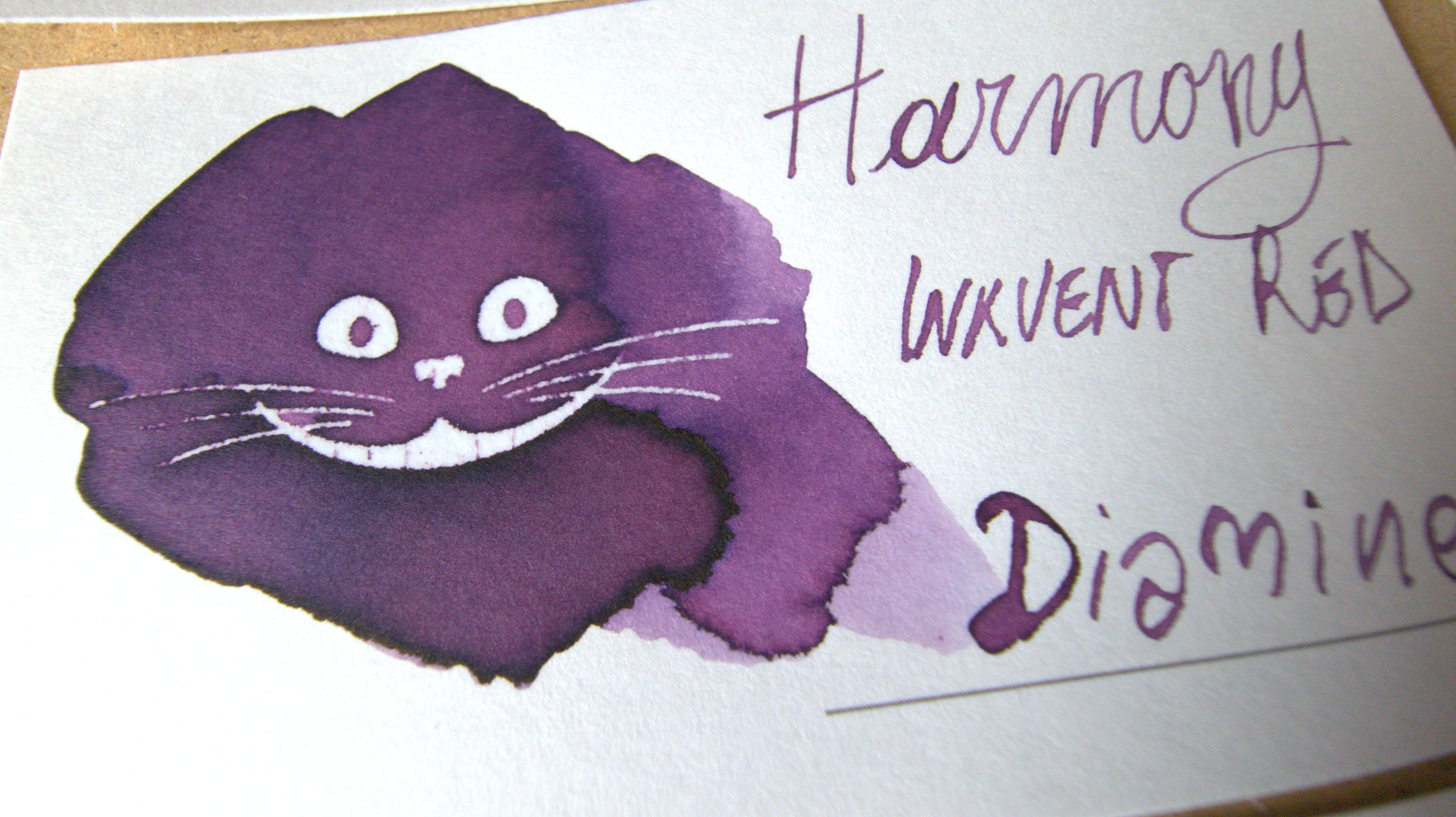 Come intento, mi ricorda inchiostri come Viola di Robert Oster [QUI: viewtopic.php?t=32859], tuttavia non gli somiglia e rientra di più nella famiglia di inchiostri come Aurorealis di Ferris Wheel Press [QUI: viewtopic.php?t=32849] o di Deck The Halls di Diamine, sebbene quest'ultimo sia notevolmente più caldo di Aurorealis e di Harmony.