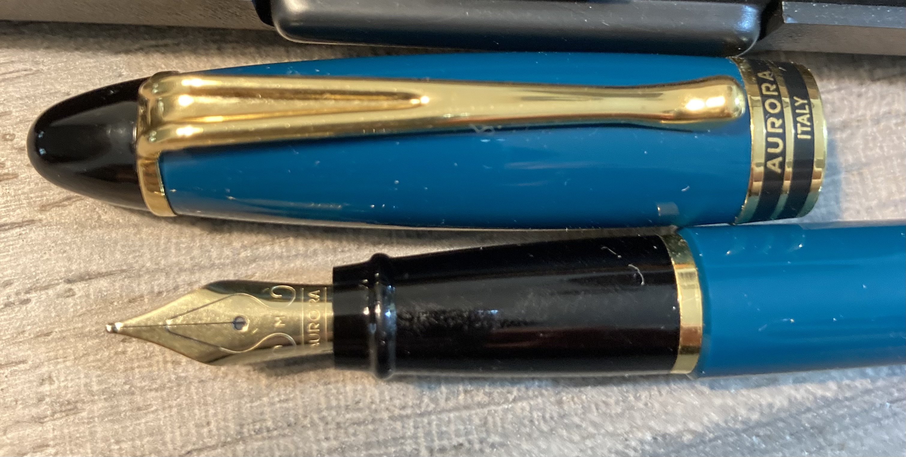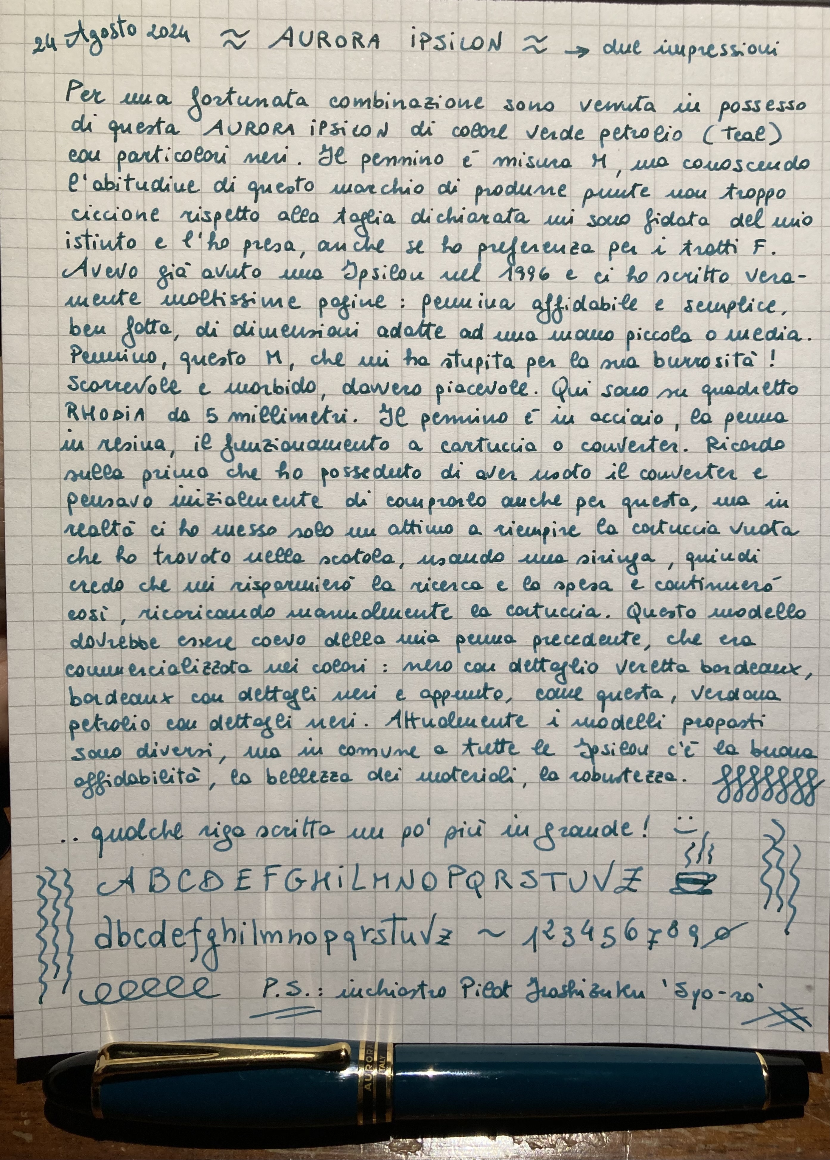 Buongiorno a tutti, grazie ad un ritrovamento fortunato ad un mercatino dell’usato ho potuto tornare in possesso di una Aurora Ipsilon (alcuni siti di vendita ne scrivono l’iniziale con la Y ma verificando sul sito web ufficiale di Aurora i conferma la I normale) degli anni Novanta del secolo scorso; avevo già avuto dal 1996 la stessa penna ma con livrea differente e pennino F, anziché M e ricordo di averla usata allo sfinimento con soddisfazione. Quando dovevo scrivere qualcosa lei era sempre pronta, col suo cappuccio a scatto, apribile col veloce gesto del pollice in una frazione di secondo perché i pensieri da scrivere non possono mai aspettare. Precisa, scorrevole, dall’aspetto direi essenziale e classico, elegante ma senza orpelli. Una penna da tutti i giorni, un mulo da scrittura, forse un po’ sottovalutata. Ho cercato sul web ma ho trovato pochissimo: solo le immagini e le informazioni sui modelli attualmente in catalogo. Oggi Aurora produce alcune versioni con pennino in acciaio ed i modelli Deluxe con punte in oro. Le mie, quella del tempo e questa nuova (perché ho scoperto felicemente che è proprio nuovissima!) sono entrambe con pennino in acciaio. Una nota sul tratto: l’F che avevo era ben più fine del corrispondente F di Pelikan ed anche questo M che equipaggia il nuovo arrivo è di grandezza non esagerata, un poco meno del tratto M della Pilot misura #15, ultimo che ho potuto provare in questa taglia. Il colore verde petrolio in foto viene sempre o quasi più chiaro del reale: solo nella foto con lo scritto lo vedete come appare dal vero, scuro ma non troppo, ben abbinato secondo me alle altre parti della penna, punta del cappuccio, fondello e banda ornamentale, tutti in nero. Le finiture sono dorate.