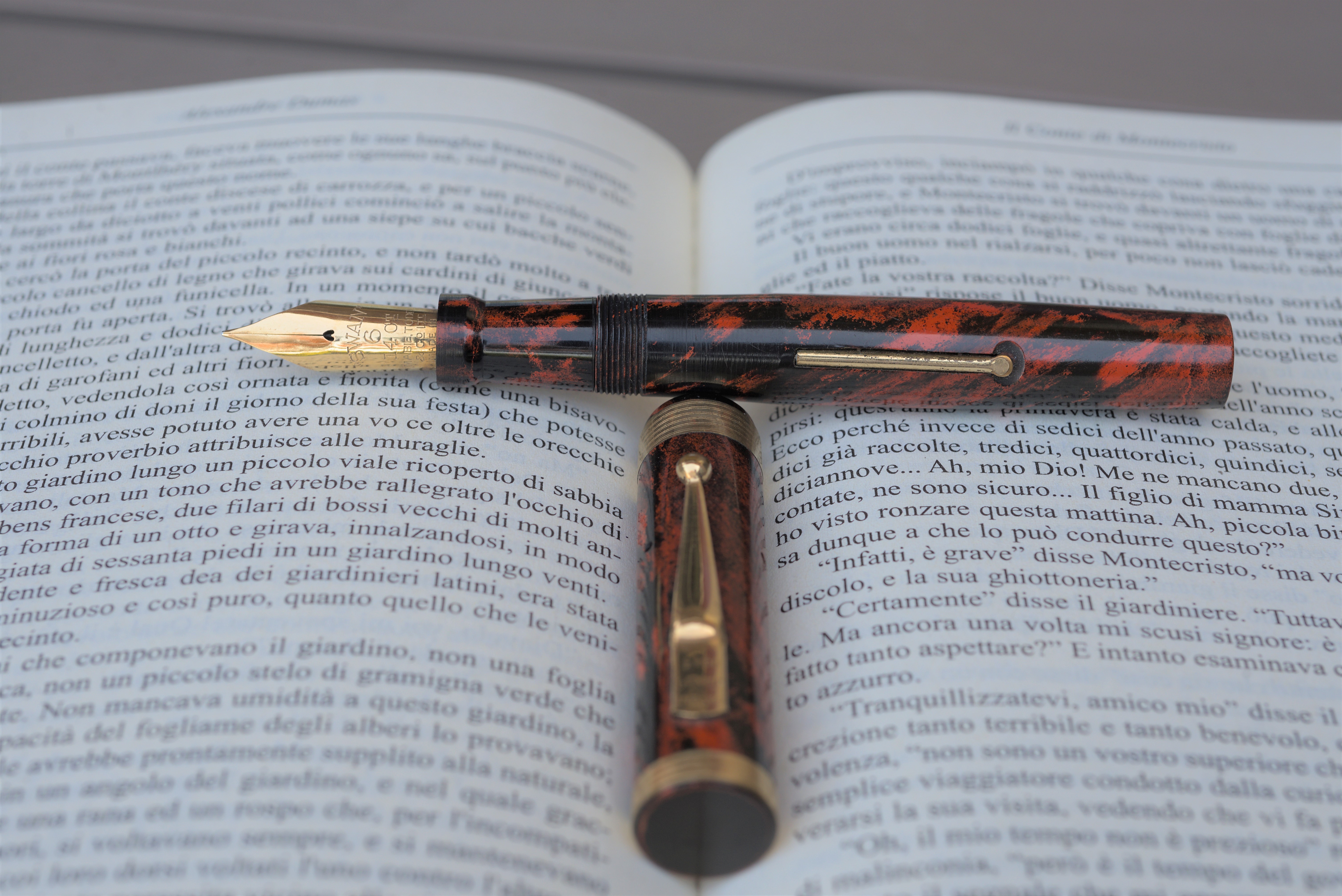Qualcuno ha avuto modo di provarla o la possiede !? Sono curioso di conoscere le impressioni. Ho letto che il pennino è un 24k placcato, l’alimentatore in ebanite. Sicuramente non ci sarà bisogno di pigiare sul foglio con una bestia simile. Uniche note che mi piacciono un po’ meno sono la resina che da un effetto celluloide pur non essendo tale anche se ho visto che è disponibile una variante nera in ebanite, inoltre il sistema di caricamento cartucce/converter, avrei preferito un caricamento a pistone con tanto di prosciugamento dell’intera boccetta con una carica