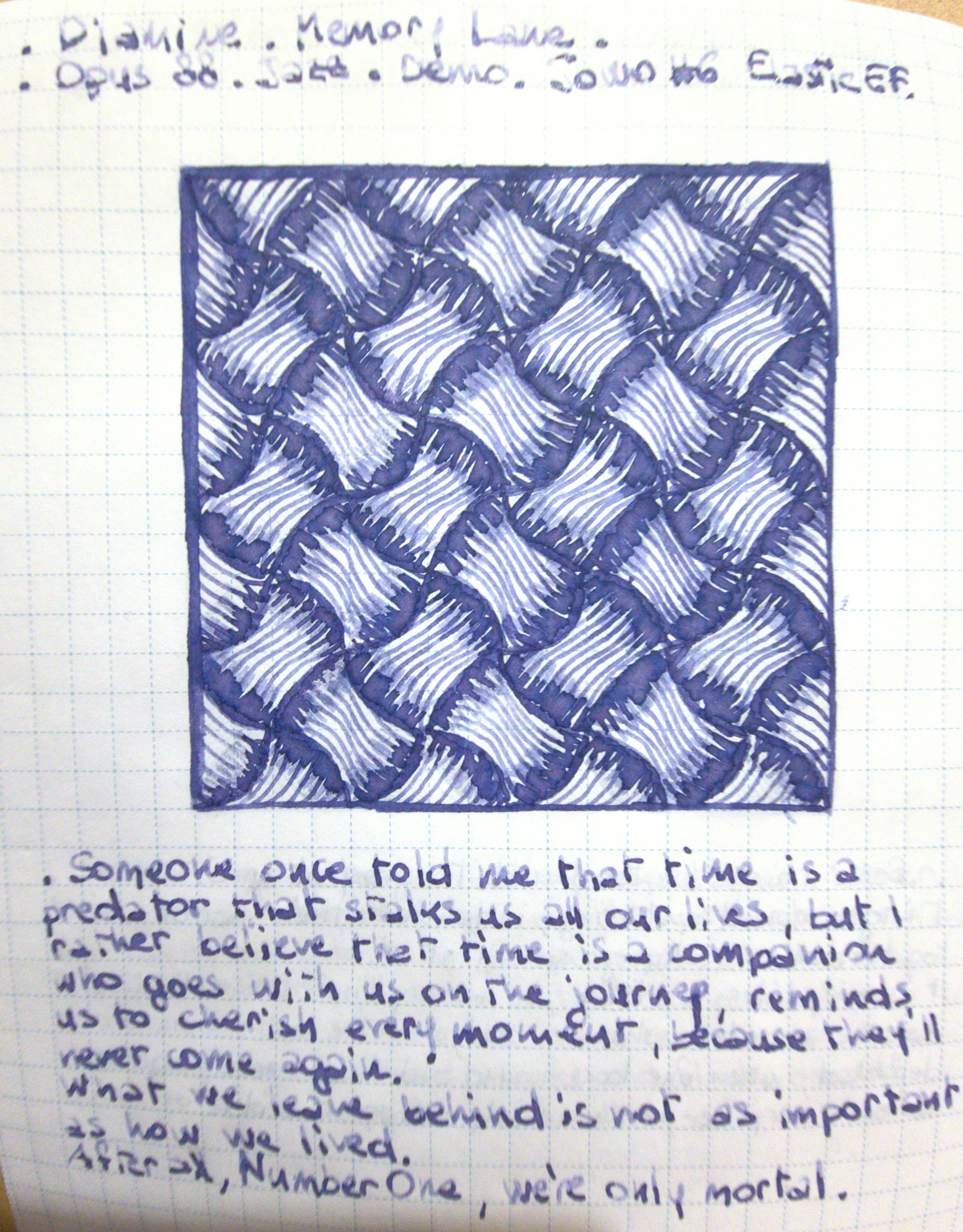 Ho caricato Memory Lane di Diamine [QUI: viewtopic.php?t=33267 ], di cui ho acquistato un flacone intero. Rispetto alla carica di brillantini che mi era arrivata con il sample usato per la recensione, la versione full ne è estremamente più scarsa, tanto che li si vede solo inclinando la pagina ad avere una luce tangenziale.