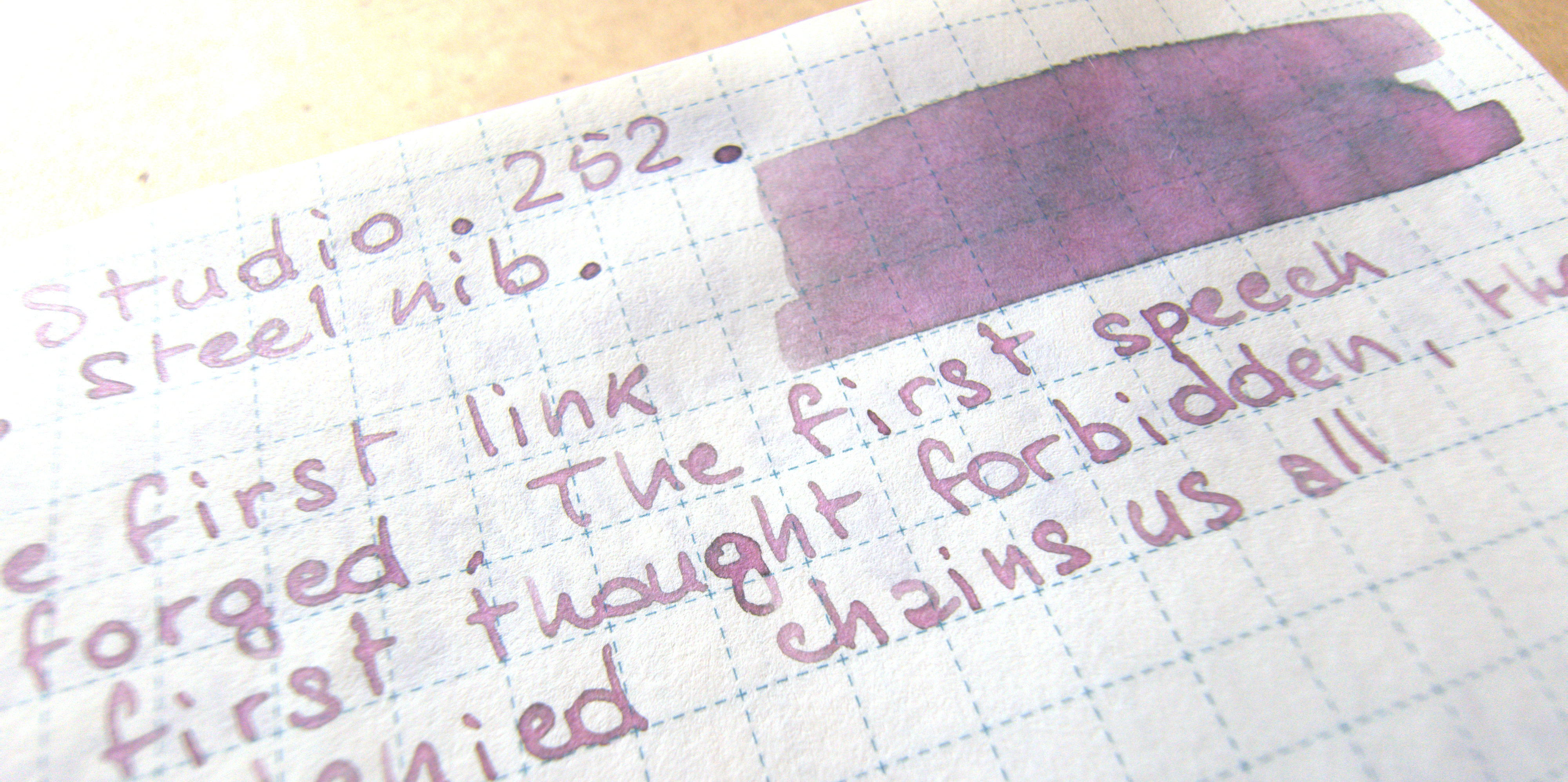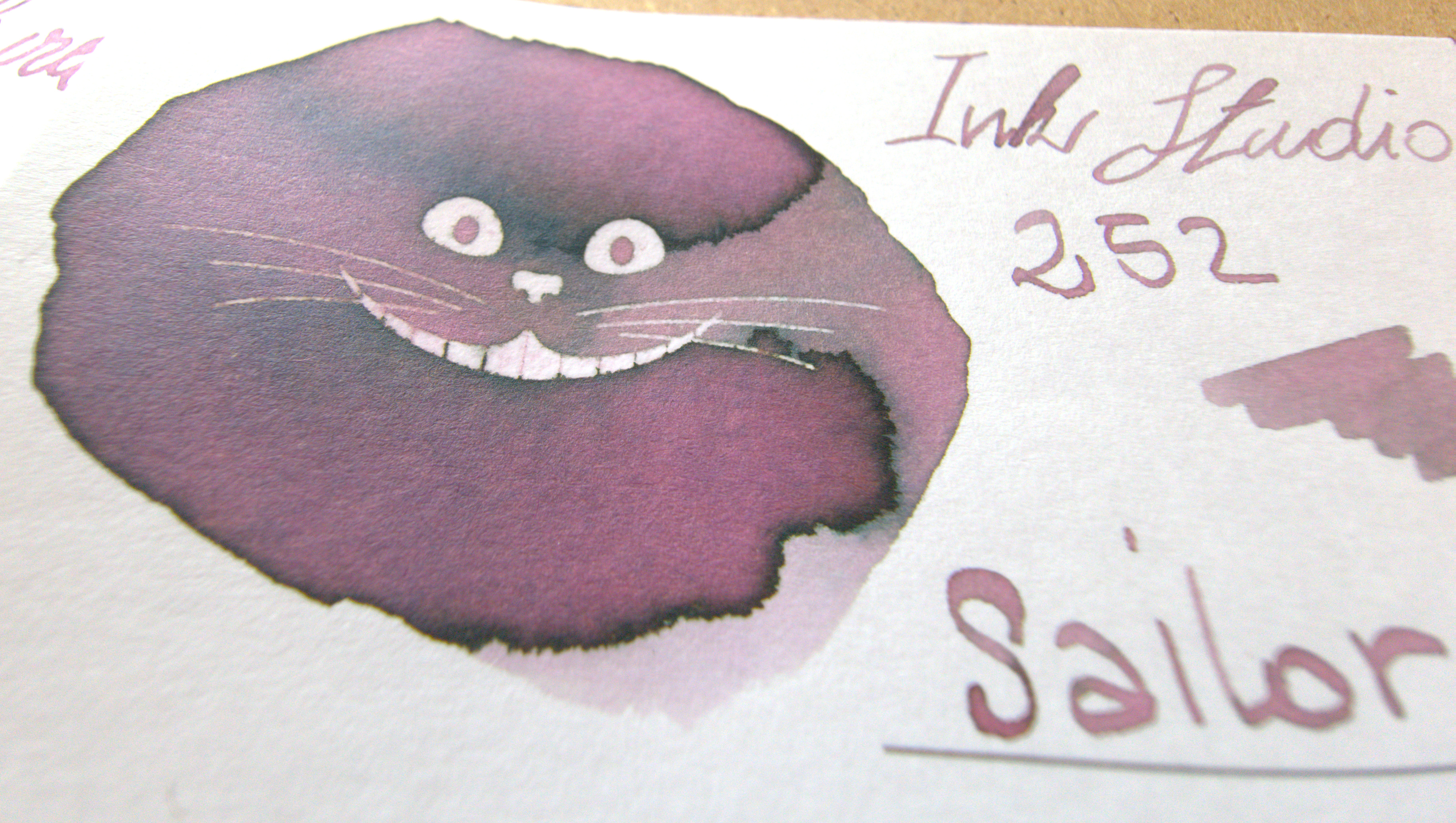 Ink Studio 252 è un rosa medio-chiaro neutro, ha medio-bassa capacità di shading, ha chromashading rosa/verde nelle aree di pooling, nello scritto l'effetto si presenta come alone verde-nero, non ha sheen. Non ha glitter.
