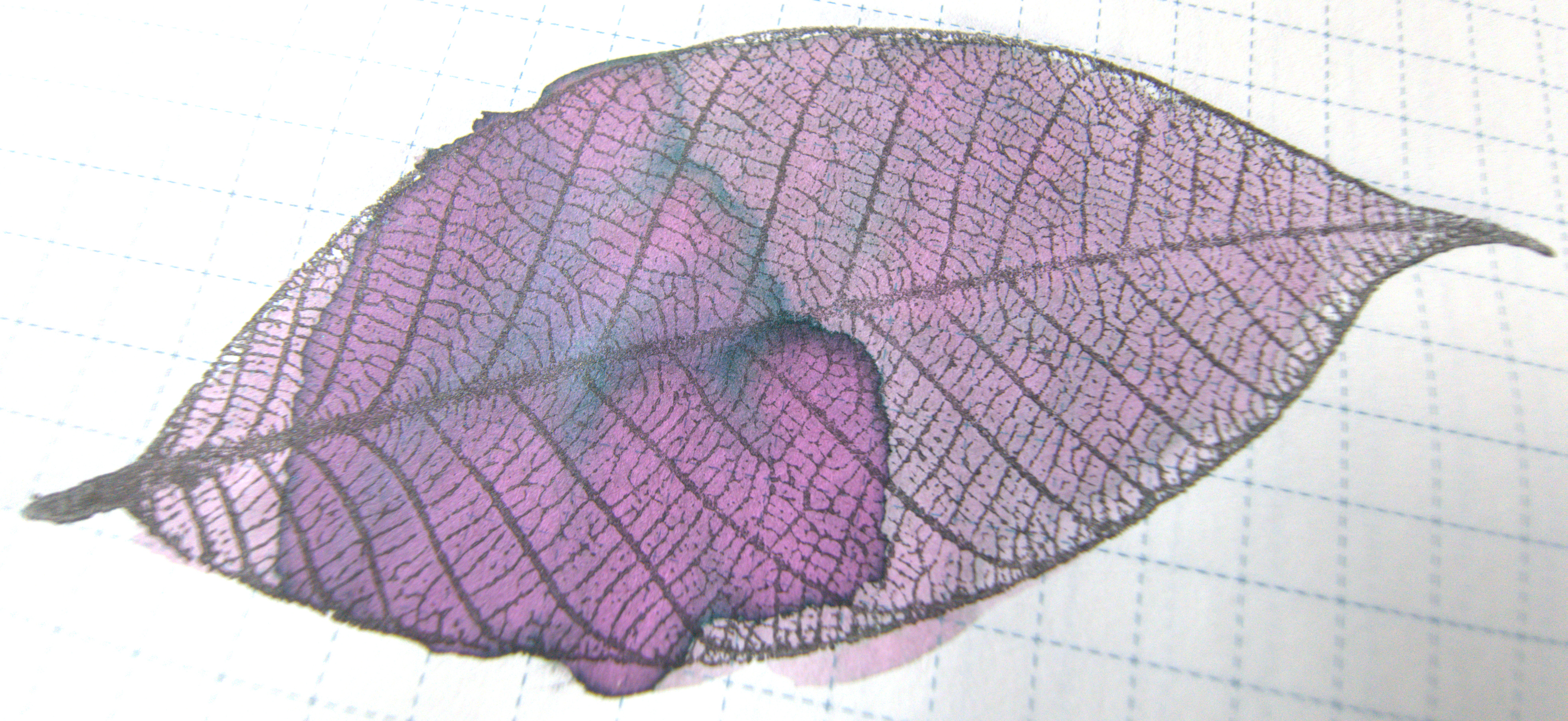 Il 252, quando viene steso, non è affatto promettente. Il colore che scende dal pennino è melmoso, un grigiastro fogna un poco inquietante :shock: Poi comincia ad asciugare ed emerge uno splendido rosa con aloni di verde foresta e nero nelle aree di maggiore accumulo.