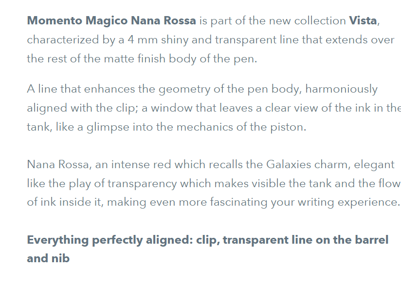 Quello che non capisco, e forse anche mi urta un poco, è quella linea lucida larga 4mm che percorre tutta la penna in lunghezza, cappuccio, sezione, fusto trasparente, in mezzo a tutta la penna opaca.