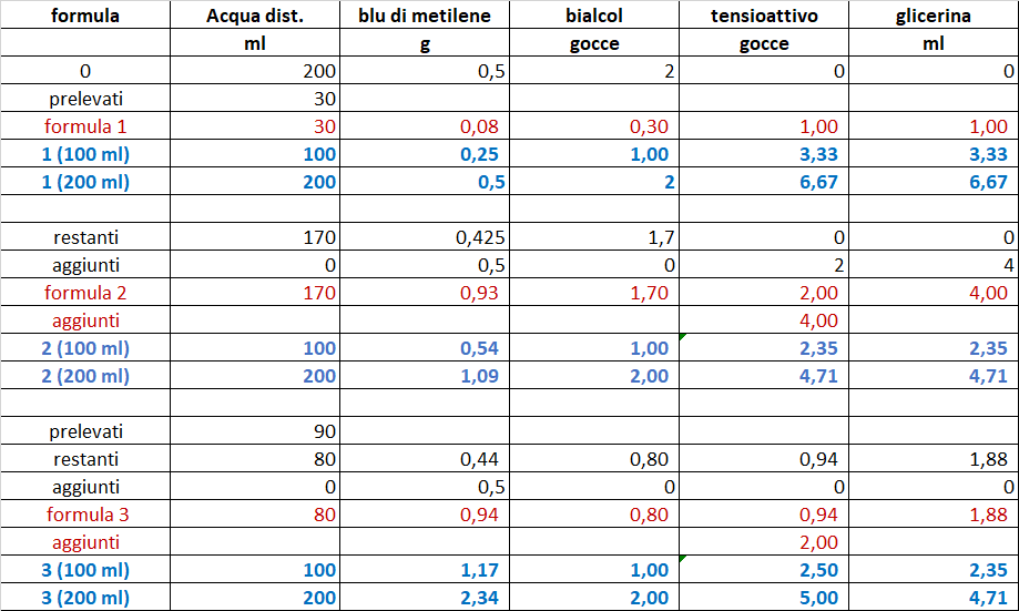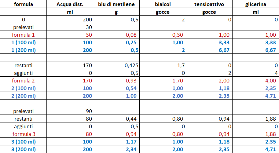 In via approssimata, se dovessi riprodurre la formula, le aggiungerei all'inizio, e le formula diventerebbero queste. Nella pratica per 100 ml di ciascuna delle tre formule risultano adeguati a mio parere, 1 goccia di Bialcol, 3 gocce di tensioattivo Patterson, 3 ml di glicerina.