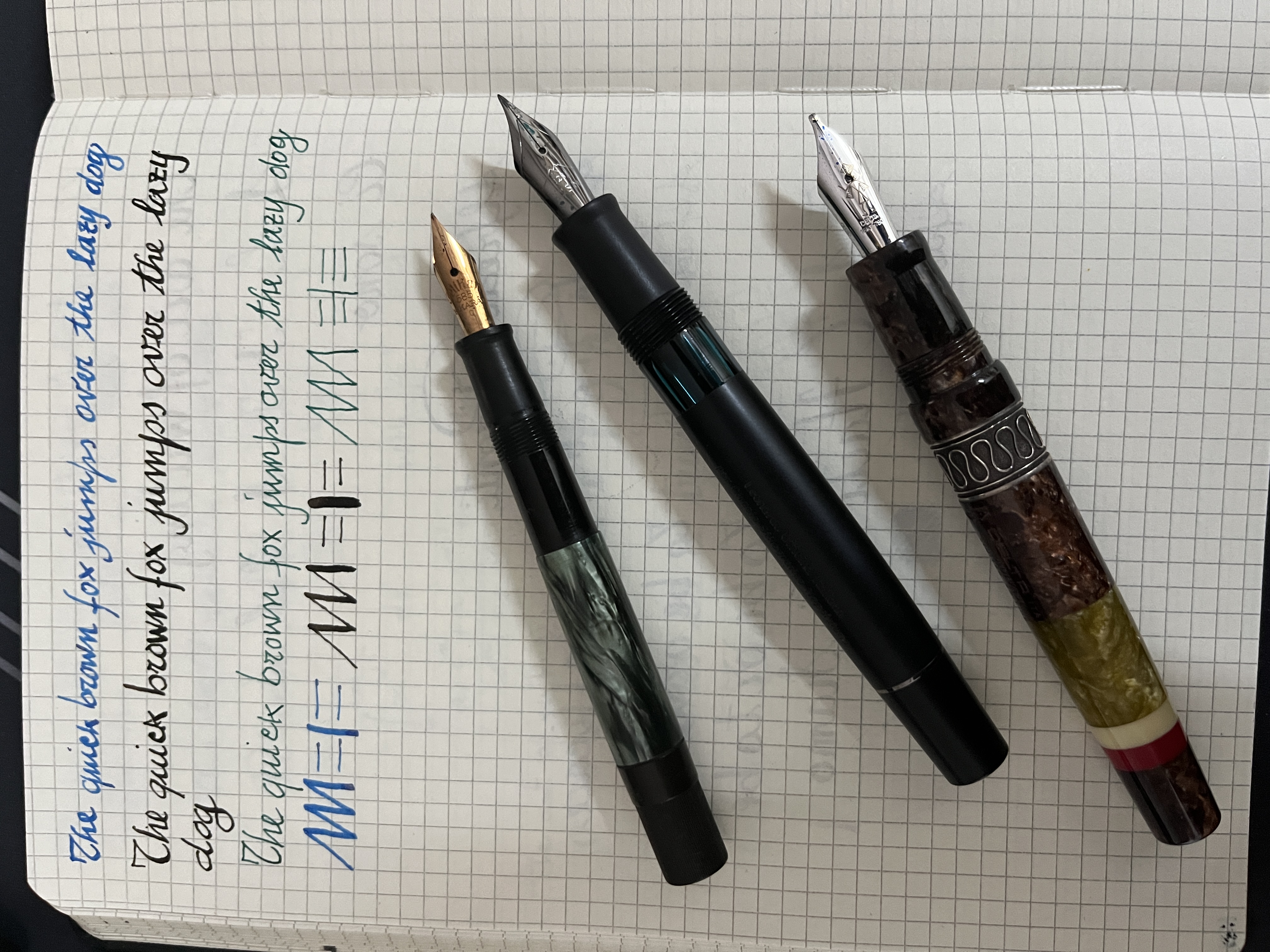 In realtà non c’è molto da dire, la Pelikan risale agli ‘30, e spesso su queste penne si trovano dei pennini flessibili (in questo caso si tratta di un flessibile e non di un wet noodle). La Avedasi è una Delta della serie Indigeneous People, il pennino in origine era un BB, l’ho modificato io stesso in stub. Infine la Leonardo Momento Magico CSN con pennino EF, ritoccato in XXF.