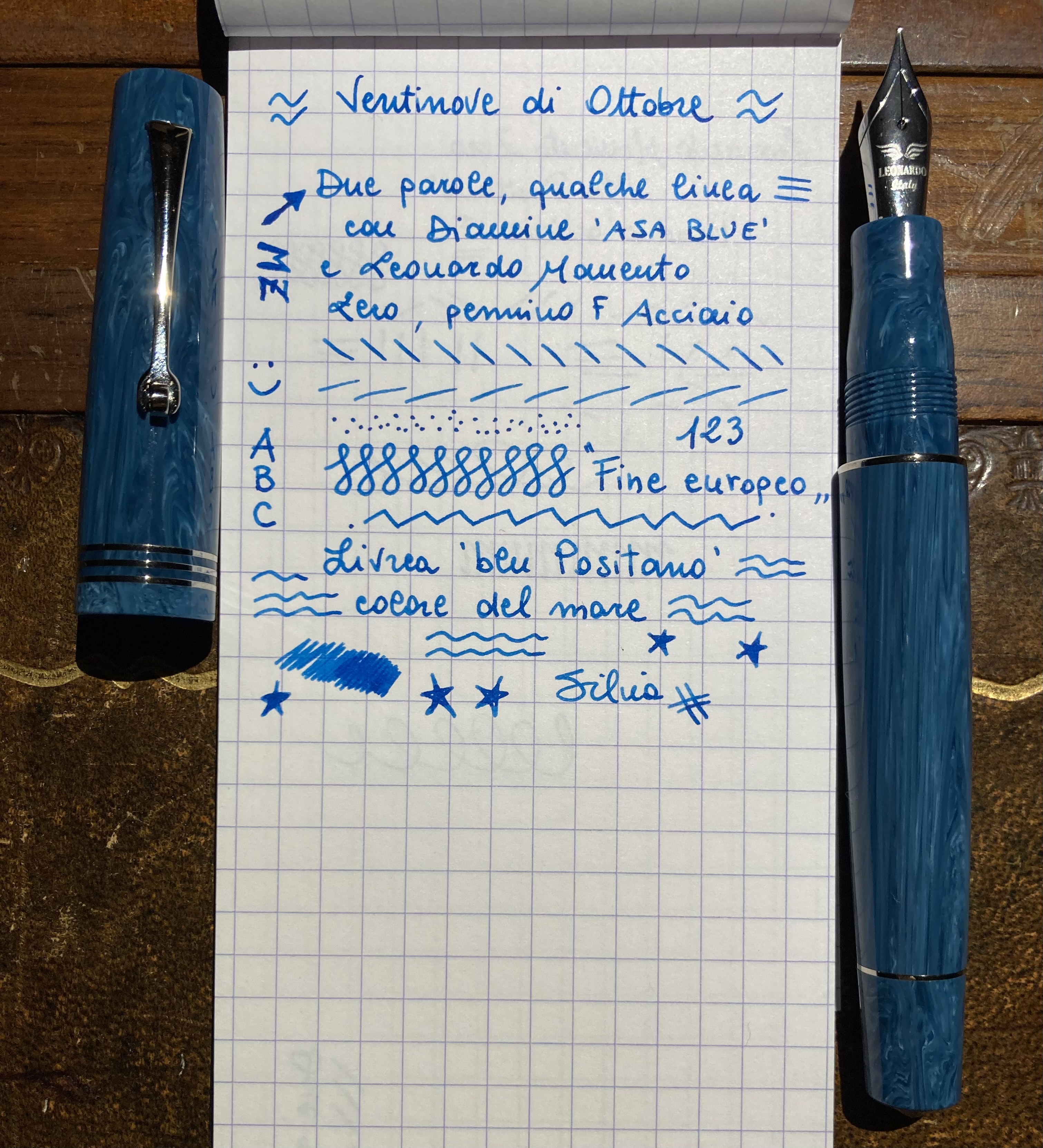 Riguardo l'inchiostro... Sto giusto considerando di comprare il Diamine Asa Blue, e approfitto per chiederti cortesemente qualche informazione...