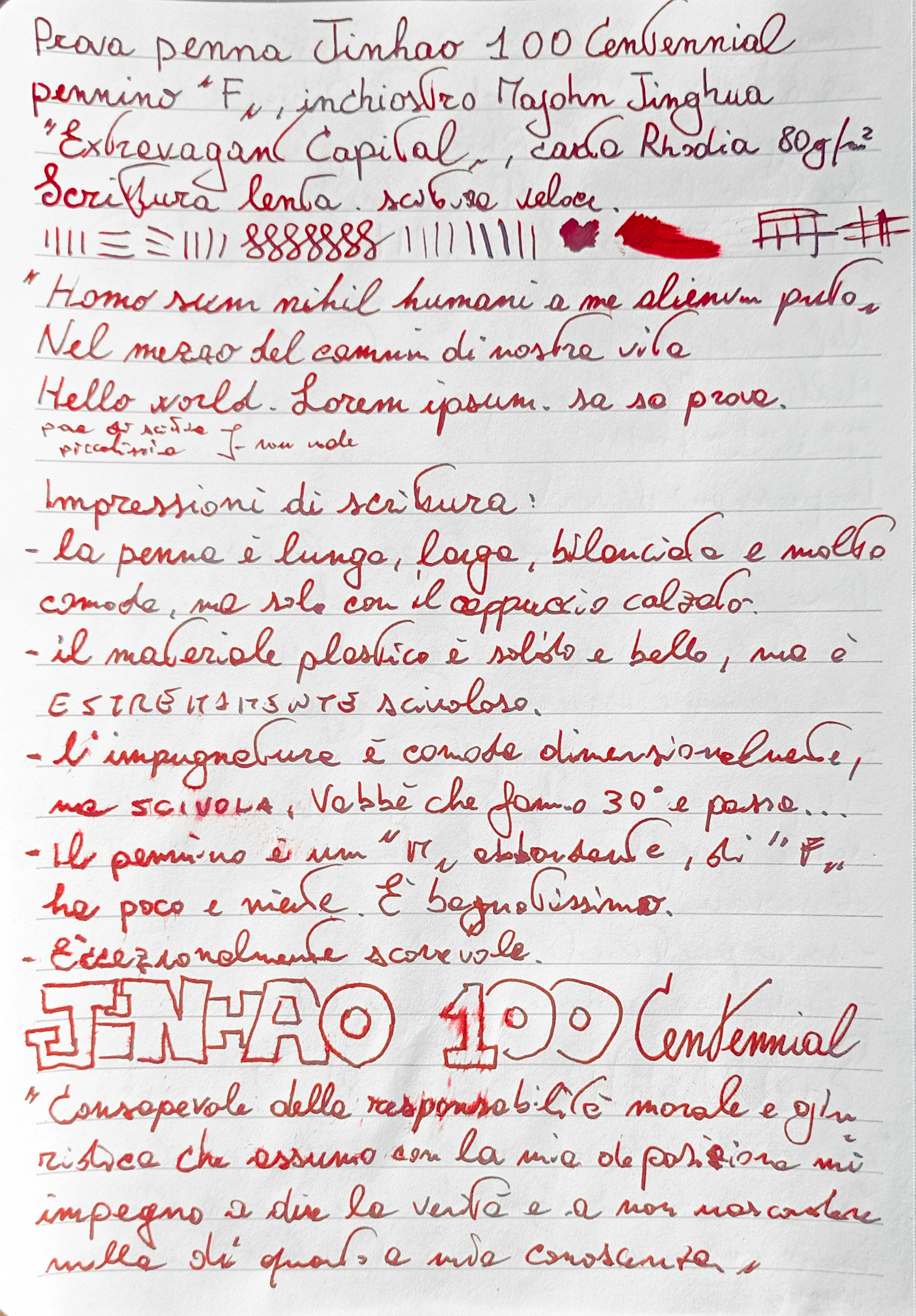 Rosso è rosso, senza dubbio, meno scuro dell'Oxblood ma comunque scuro, scorrevole, discretamente lubrificato, flusso medio, non allarga il tratto e si comporta bene.