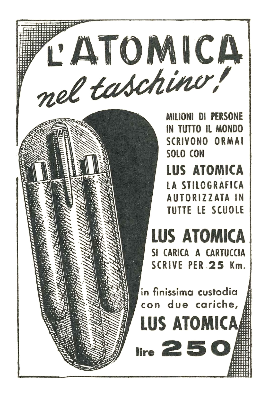 In un’altra pubblicità, il cui slogan era “L’Atomica nel taschino!”, veniva sottolineato come la penna fosse autorizzata per l’uso in tutte le scuole e si proponeva una custodia appositamente studiata, con spazio anche per due cartucce di riserva.