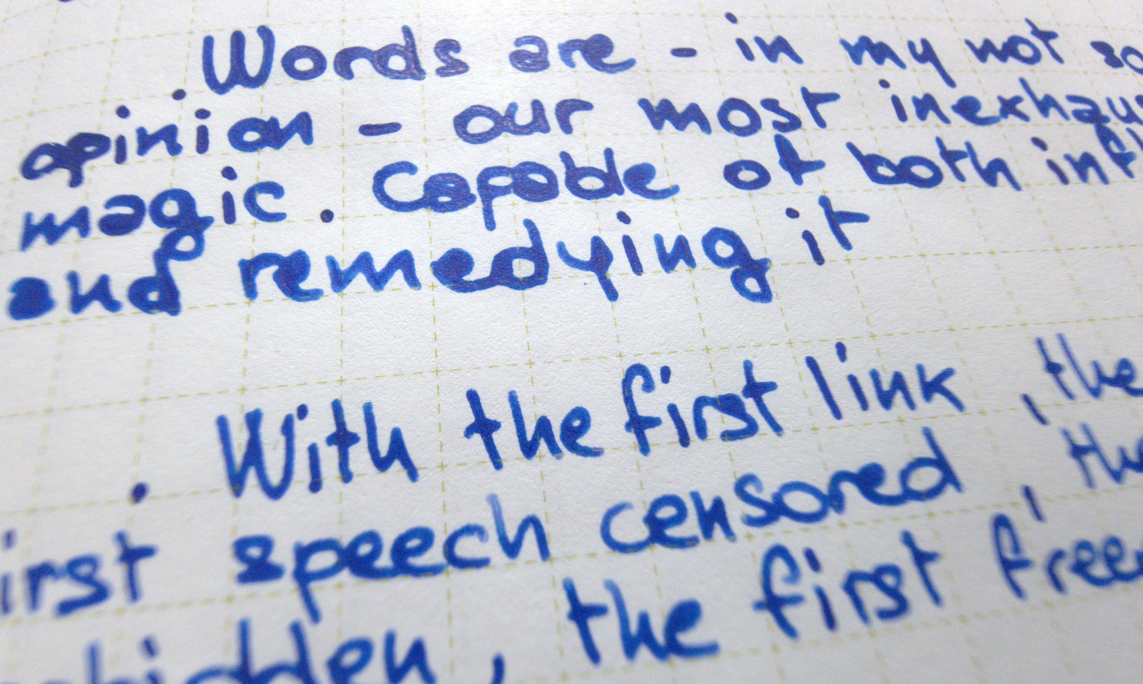Con una TWSBI Eco EF il comportamento è più moderato, non avendo un eccessivo allargarsi del tratto. La quantità generosa di surfattante, tuttavia, ruba un poco la possibilità di ottenere un poco di shading, che si presenta raramente: le potenzialità ci sono e le aree più azzurre a me piacciono molto, sono più vicine al genere di "blu" (sempre azzurri molto chiari) che uso io.