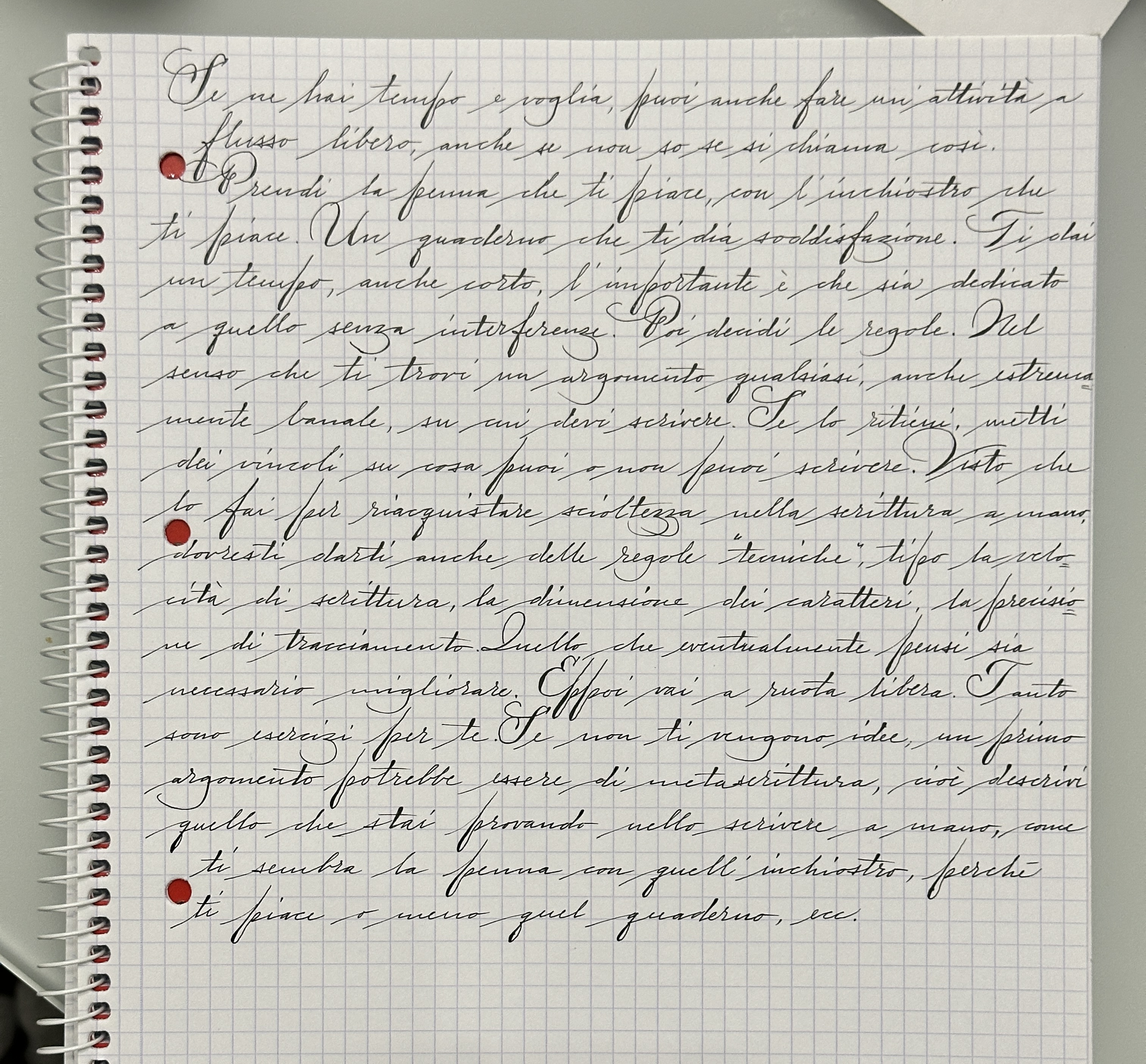 Visto che lo fai per riacquistare scioltezza nella scrittura a mano, dovresti darti delle regole "tecniche", tipo la velocità di scrittura, la dimensione dei caratteri, la precisione di tracciamento. Quello che eventualmente pensi sia necessario per migliorare.