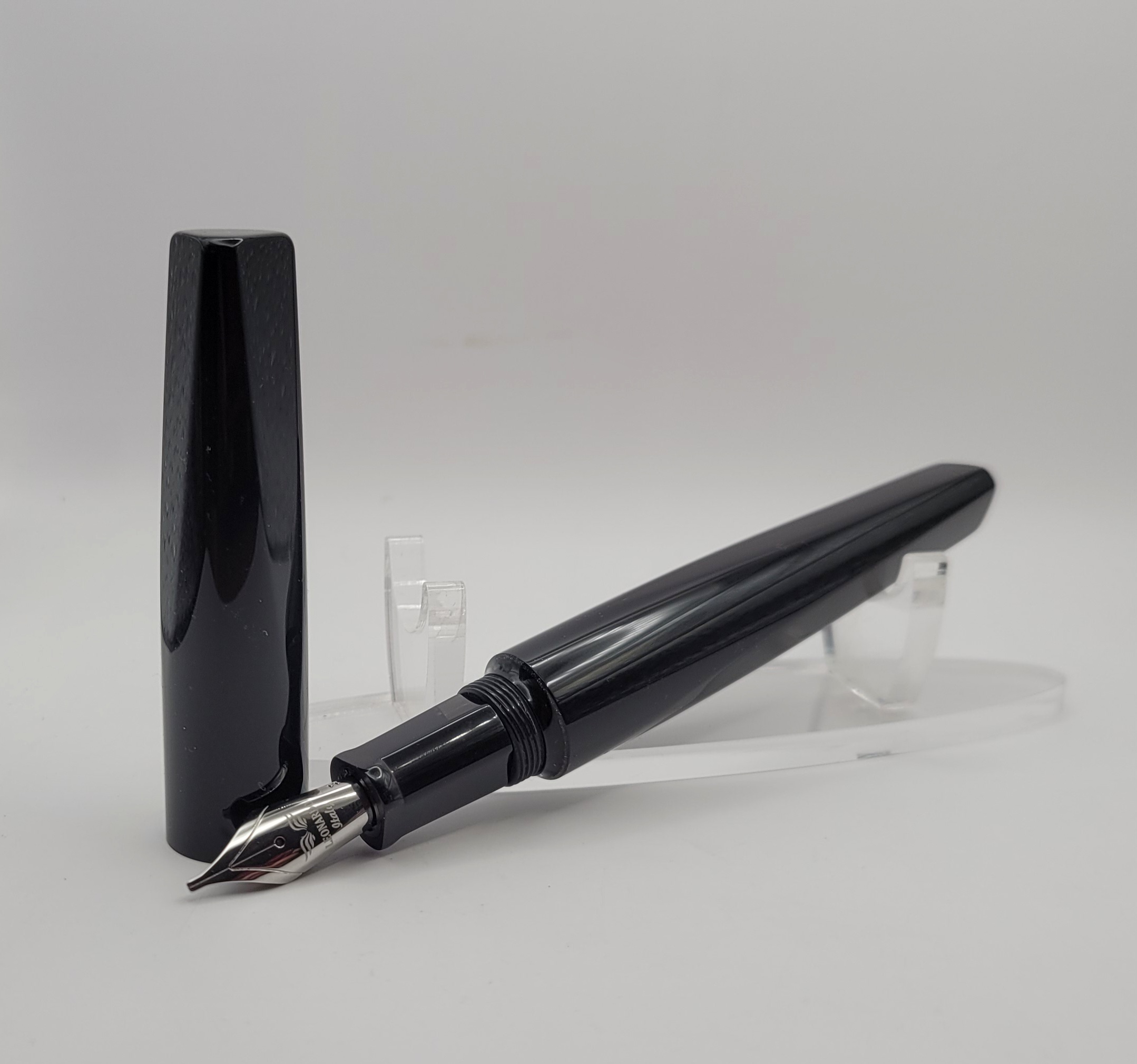 Finalmente ho inchiostrato la Fuliwen 017 in livrea nero-oro. A guardarla sembra la foto di una galassia. La resina è bella spessa, ma la penna scivola leggera sul foglio senza bisogno di calzarla. Il pennino M è un po' troppo bagnato, ed io prediligo gli M. Il pennino reca incisa la scritta: Iridium point Germany su tre righe.