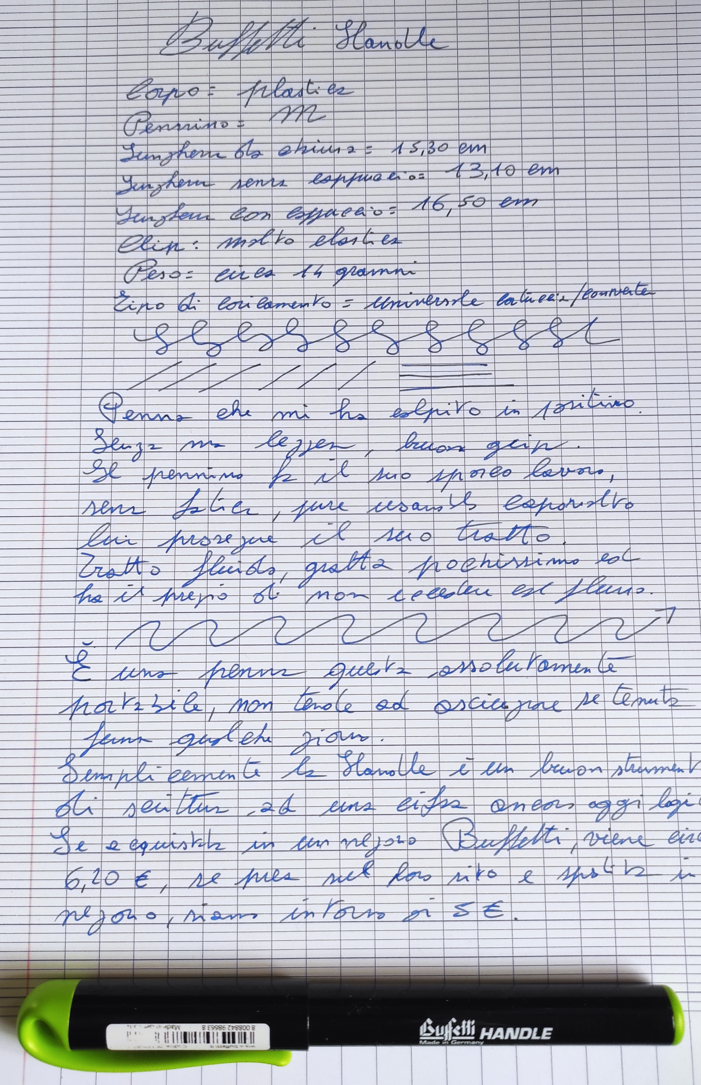 Ricapitolando, la Buffetti Handle si presenta e si comporta per quello che è: una modestissima penna scolastica e da ufficio senza pretese o vanità, ma affidabile, funzionale e dinamica.