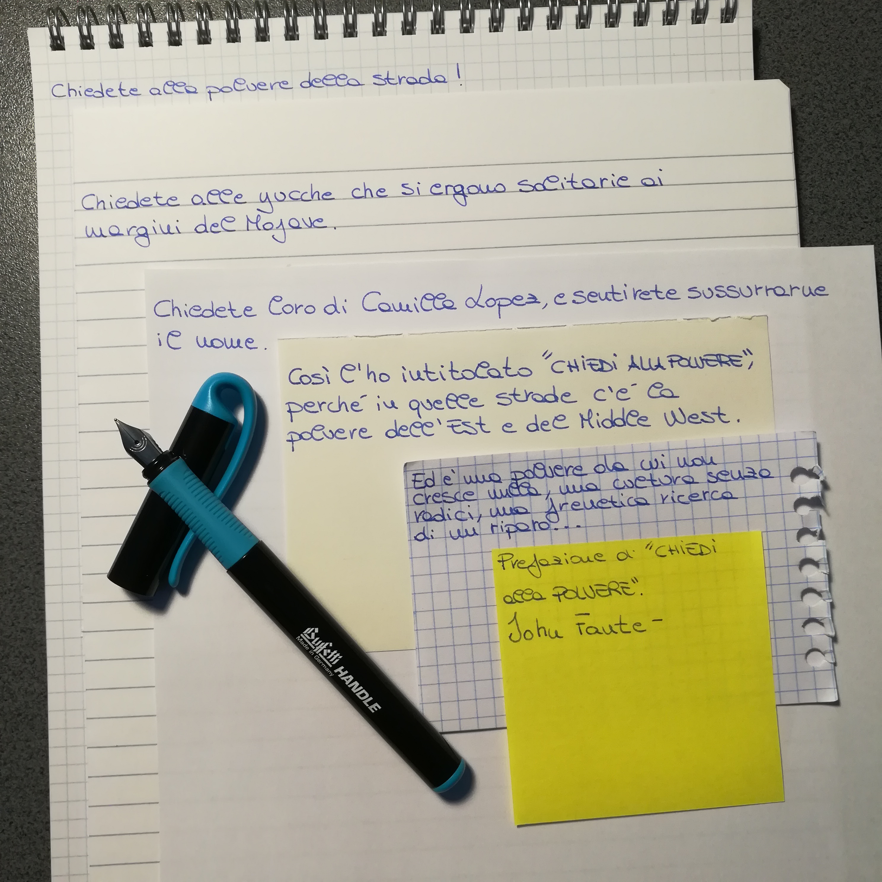 Sono sempre stato legato alla scrittura, prima in modo catastrofico - anni fa scrivevo male, controvoglia, affondando la biro con violenza nella carta, quasi a volerla ferire per vendicarmi di un torto. Disordinato e pasticcione, impugnavo male qualsiasi strumento di scrittura, e la mia mano sudaticcia e impacciata finiva con il cancellare l'inchiostro subito dopo averlo steso. Traumi a non finire, insomma. Poi, pian piano, mi sono adattato, mi ci sono abituato, e la necessità di scrivere moli sempre crescenti di appunti, da studentello diligente, mi ha portato a correggere e perfezionare il tutto, fino a far nascere in me una vera passione-ossessione. Anni trascorsi. Bic divorate, perse, lanciate in testa a compagni e professori - già, sono più bravo a scrivere che a calcolare le traiettorie di lancio, il che è tutto un dire. Pagine e pagine. Appunti. Note sui libri. Appunti. Promemoria. Cartoline. Lettere. Palinodie. Lettere al Padre. Studio. Appunti, appunti, appunti. Le mie mani sono anche diventate meno sudaticce e impacciate, a forza di scrivere.