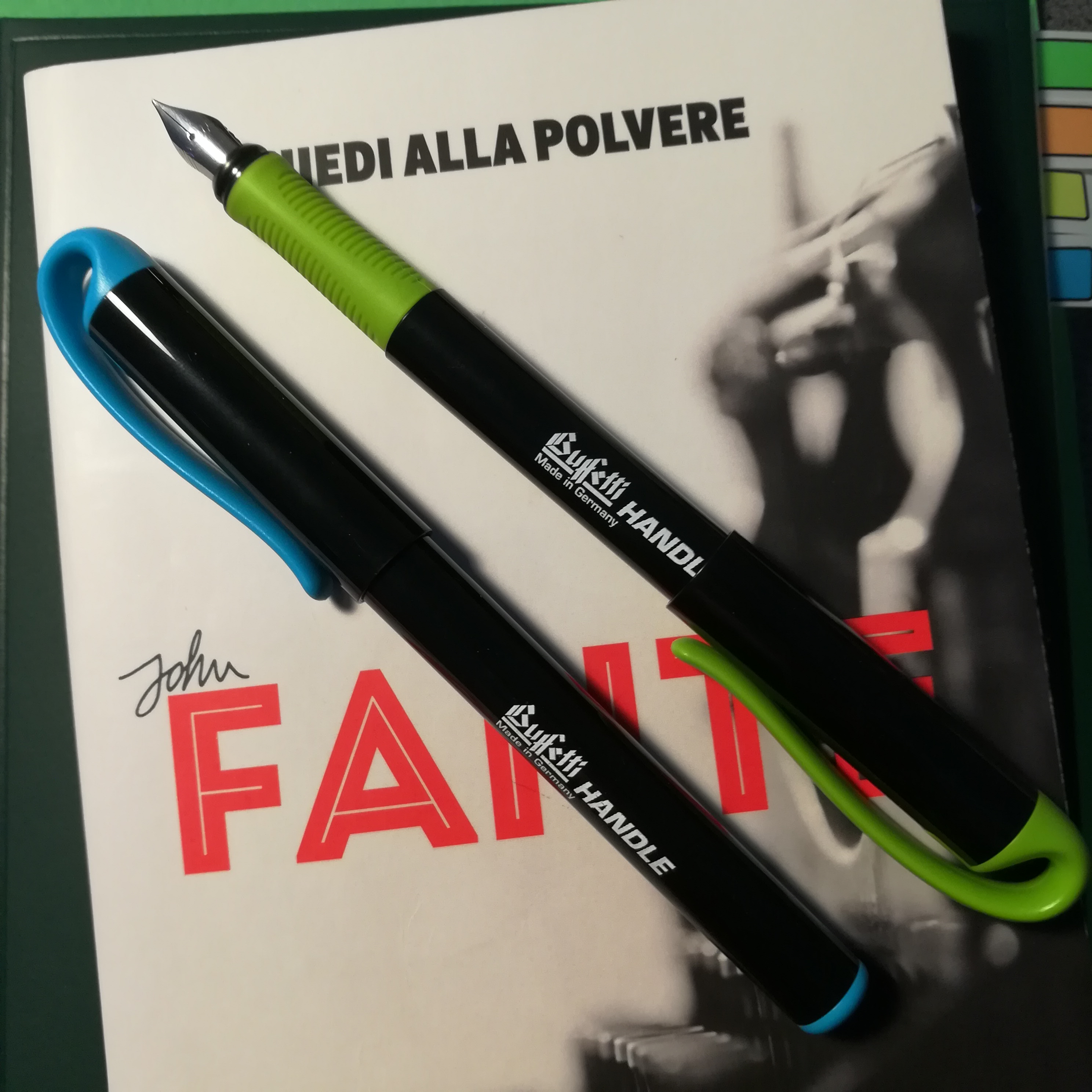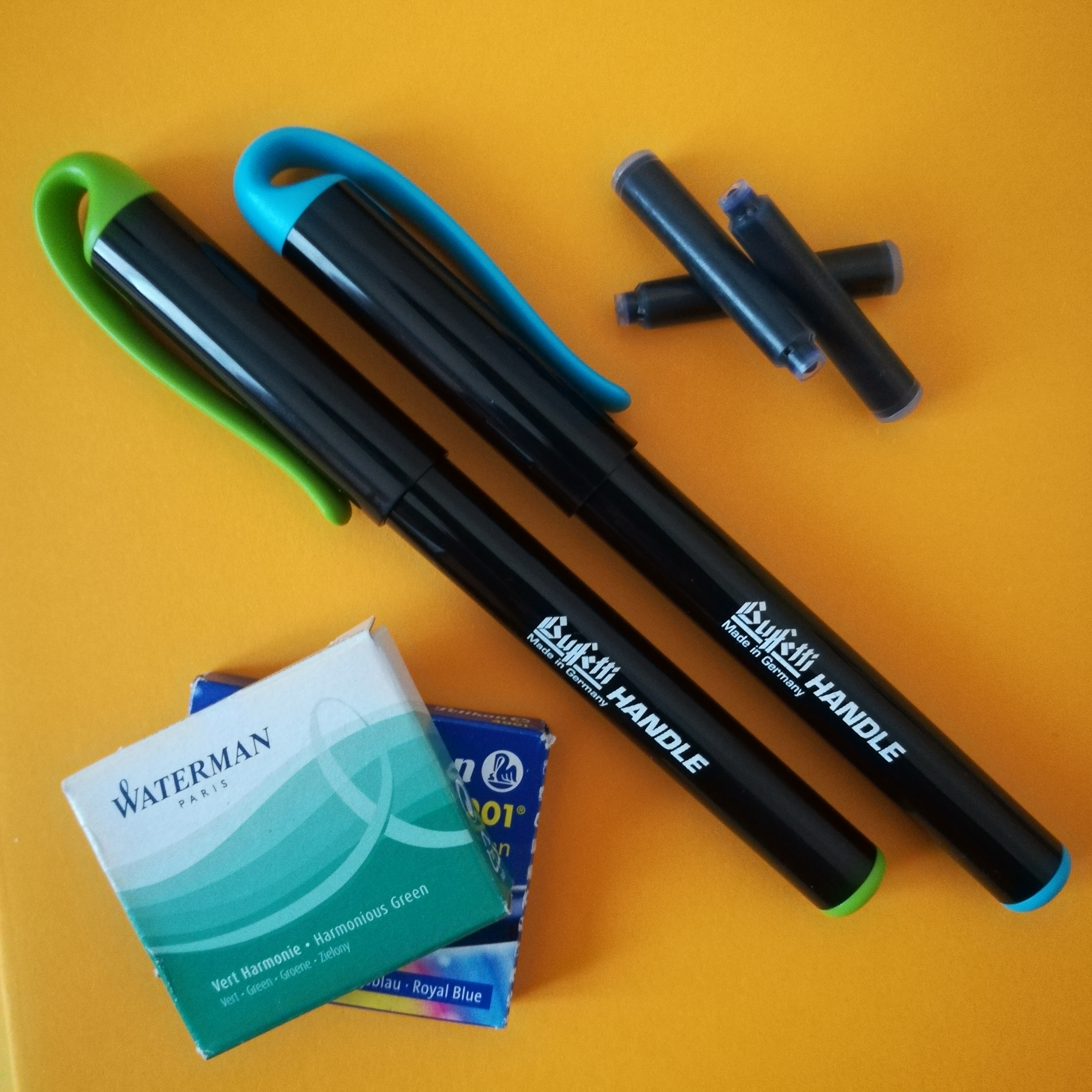 L'azzurra è sempre stata caricata con inchiostro Schneider Blu (non il più scorrevole degli inchiostri, a mio parere, ma economico e funzionale - tra l'altro, ci vuole un po', all'inizio, per avviare il flusso: non demordete, una volta partita non la ferma più nulla), mentre la verde ha visto passare per l'alimentatore numerosi inchiostri, per lo più Waterman (e, lasciatevelo dire, con gli inchiostri Waterman - ma anche con il Pelikan 4001 Royal Blue - il pennino vola sulla carta).