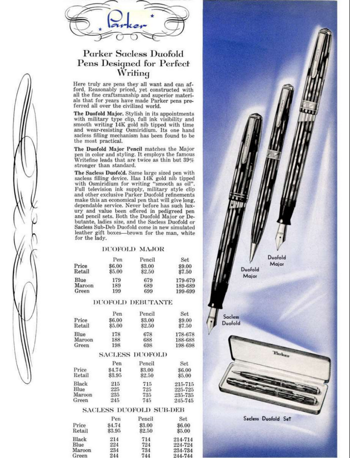 Ma Parker non si arrese, il nome Duofod è stato sinonimo di stile e qualità per anni, così nel 1940, la nuova Duofold riguadagna la sua posizione nell’olimpo dei più esclusivi modelli. Venne prodotta non solo con il sistema di ricarica a pulsante di fondo ma anche con il rivoluzionario sistema di ricarica Vacumatic. Sfoggiavano nuove celluloidi con motivi a righe verticali descritte da Parker come “smart iridescent Laidtone Permanite”. Nelle versioni Vacumatic, erano semi-trasparenti consentendo di tenere sotto controllo la quantità di inchiostro presente nella penna. Il sistema Visiometric rimase solo sulle versioni con pulsante di fondo data la presenza del sacchetto. Parker distingueva le due versioni come “Sacless” per la Duofold con ricarica Vacumatic e Sac Type quella con pulsante di fondo.