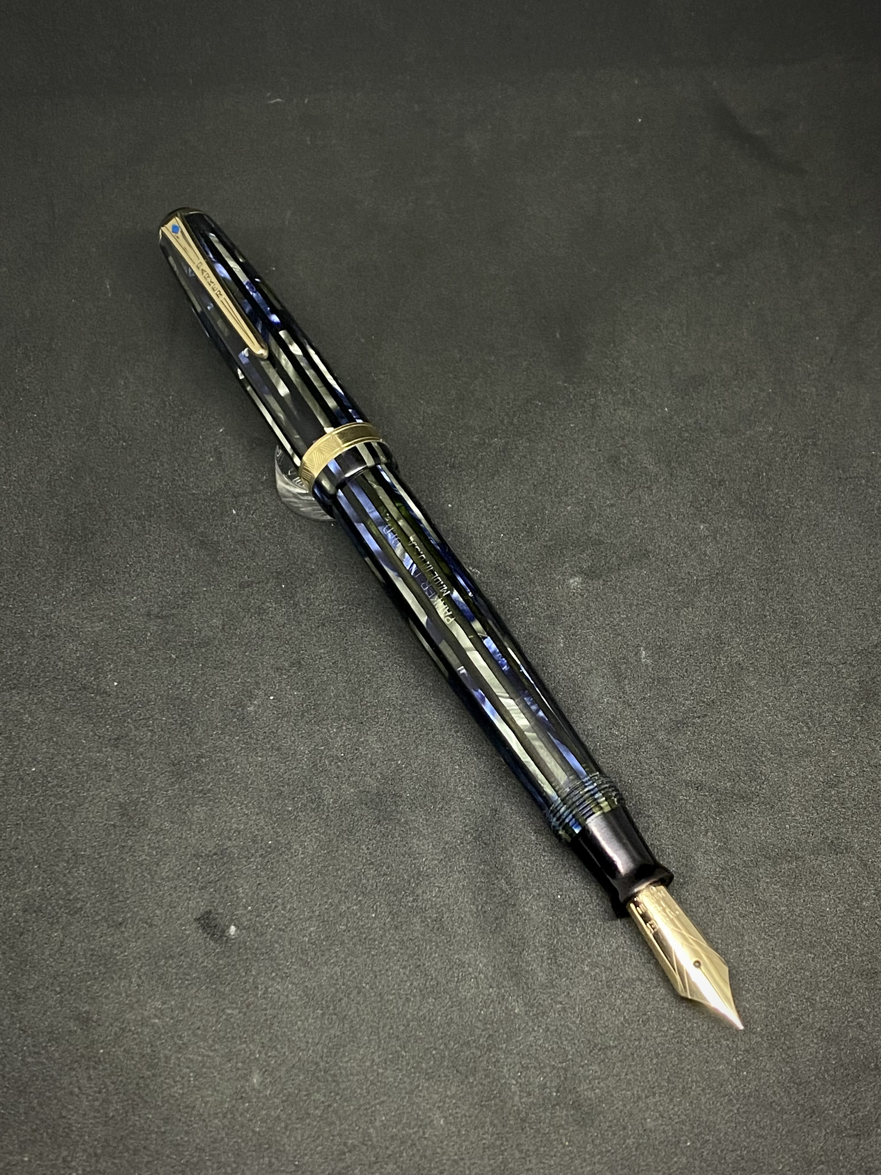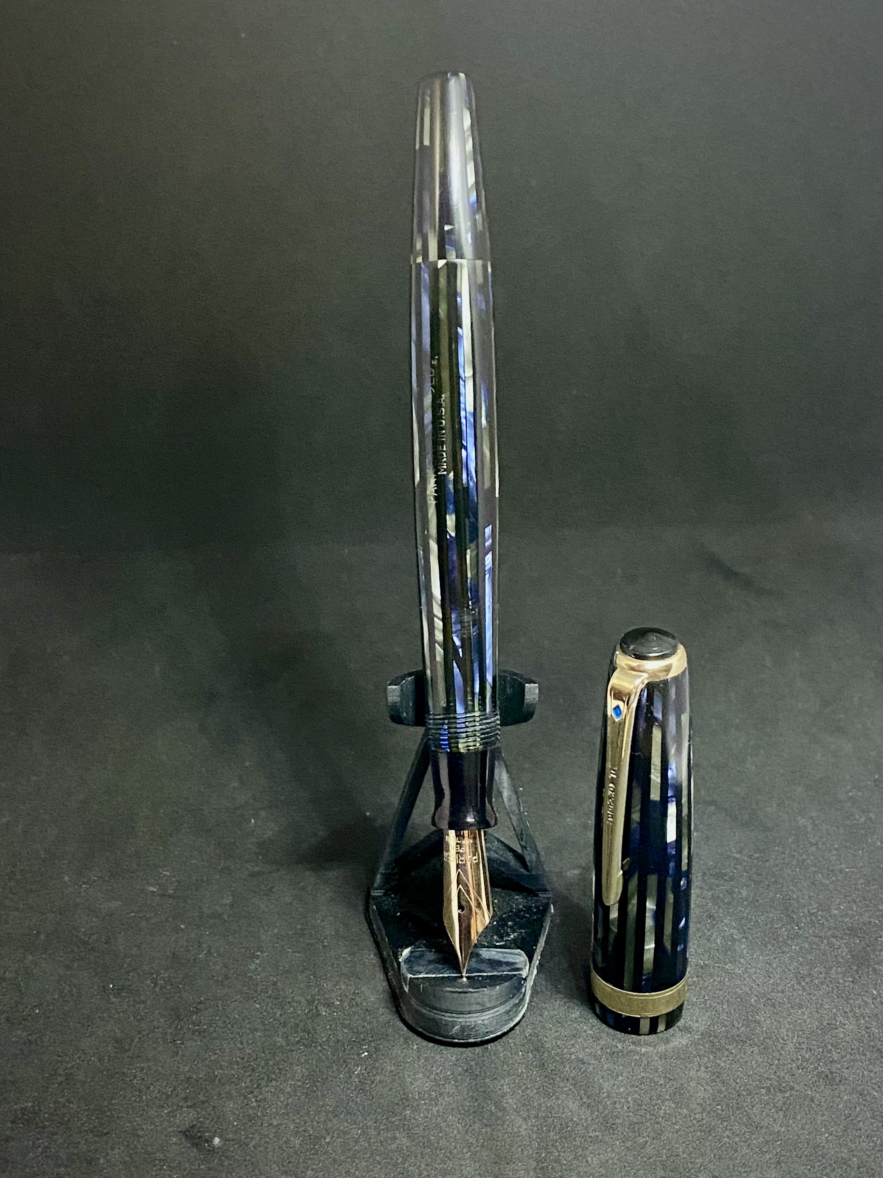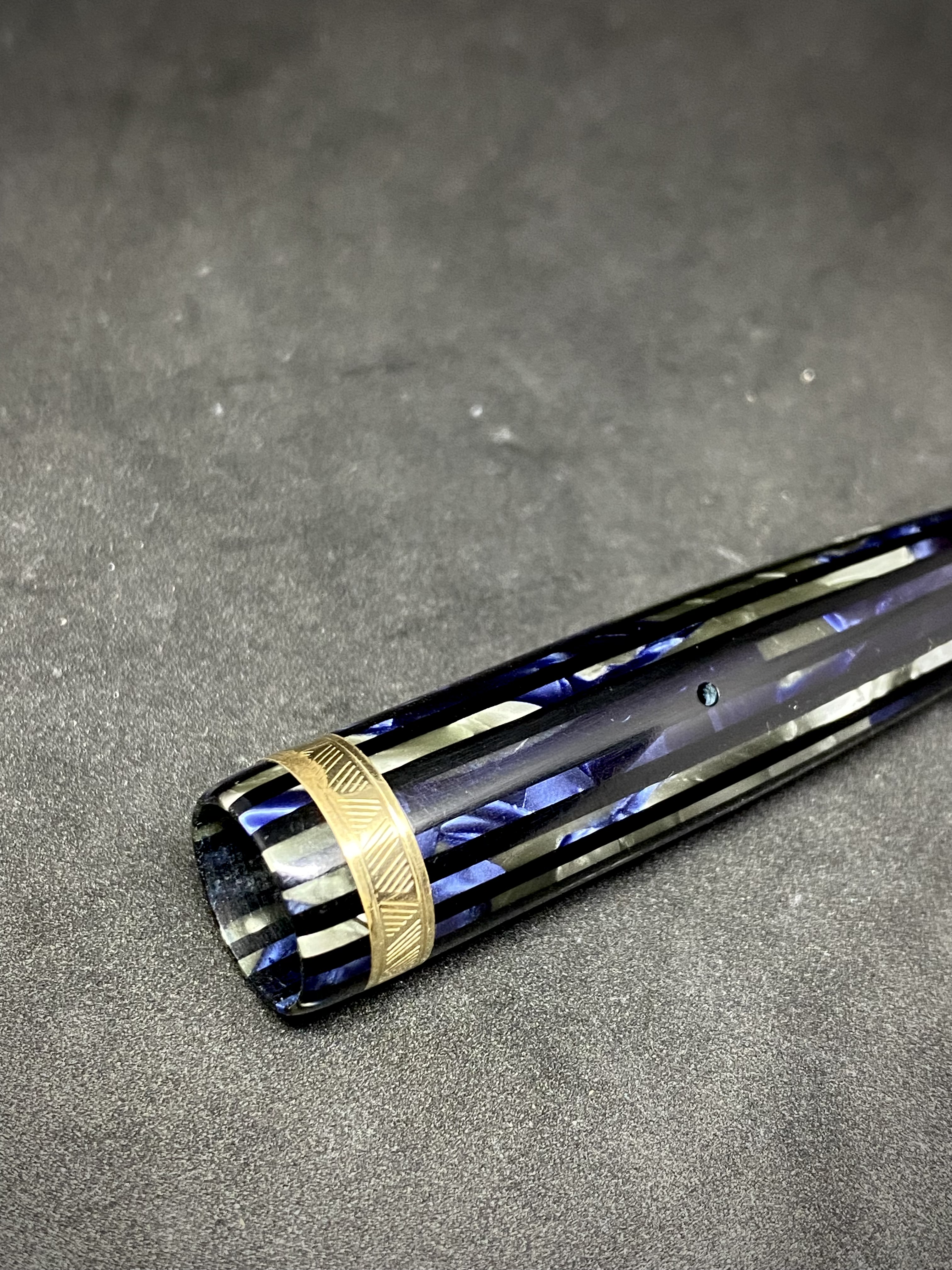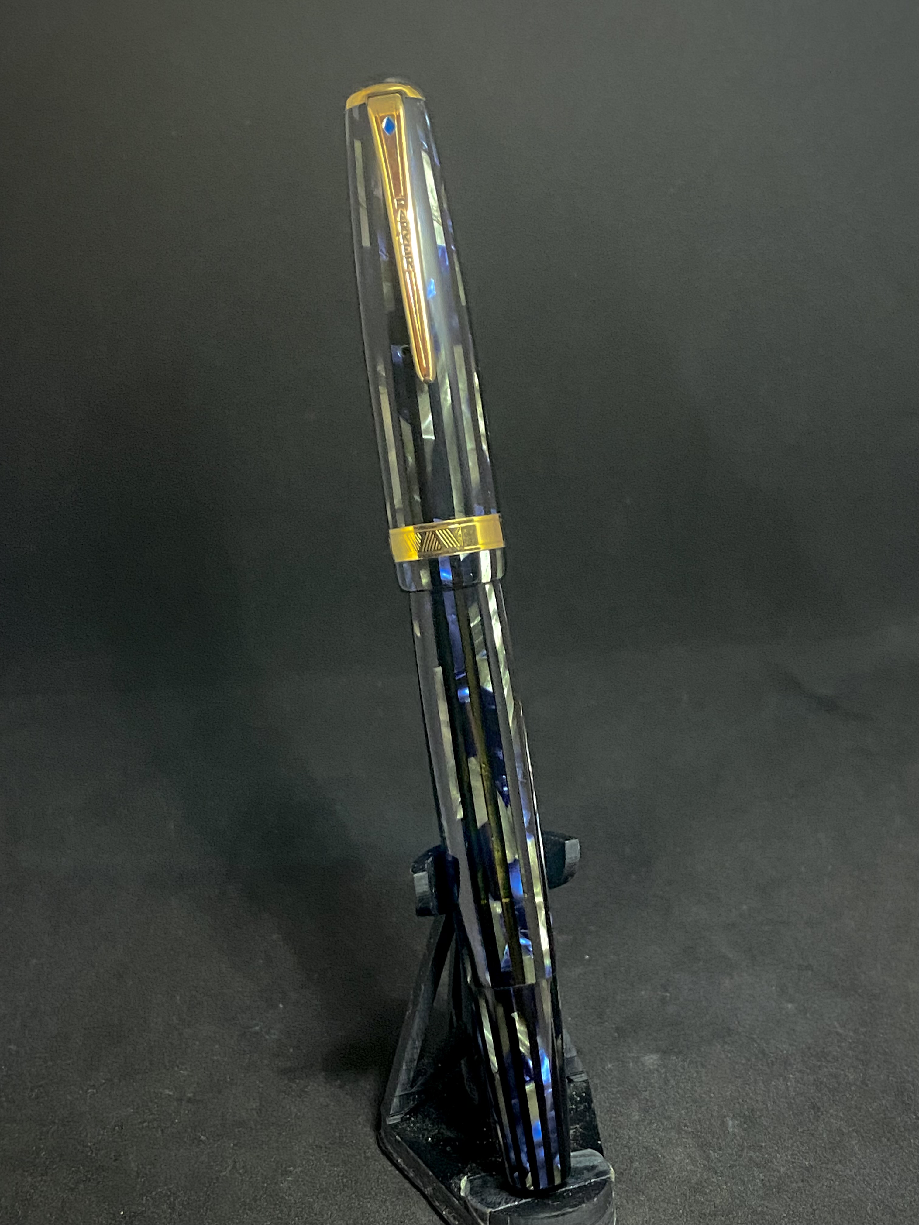 E’ sul fusto che possiamo ammirare la bellezza di questo materiale. Si tratta di una celluloide realizzata con strisce alternate di celluloide semi-trasparente e celluloide blue/grigia con una tonalità violacea. L’esemplare che mi è giunto ha conservato i colori senza evidenti viraggi di tonalità, e da una buona idea della incredibile qualità e bellezza dei prodotti di Parker dell’epoca, realizzati comunque con processi altamente industrializzati.