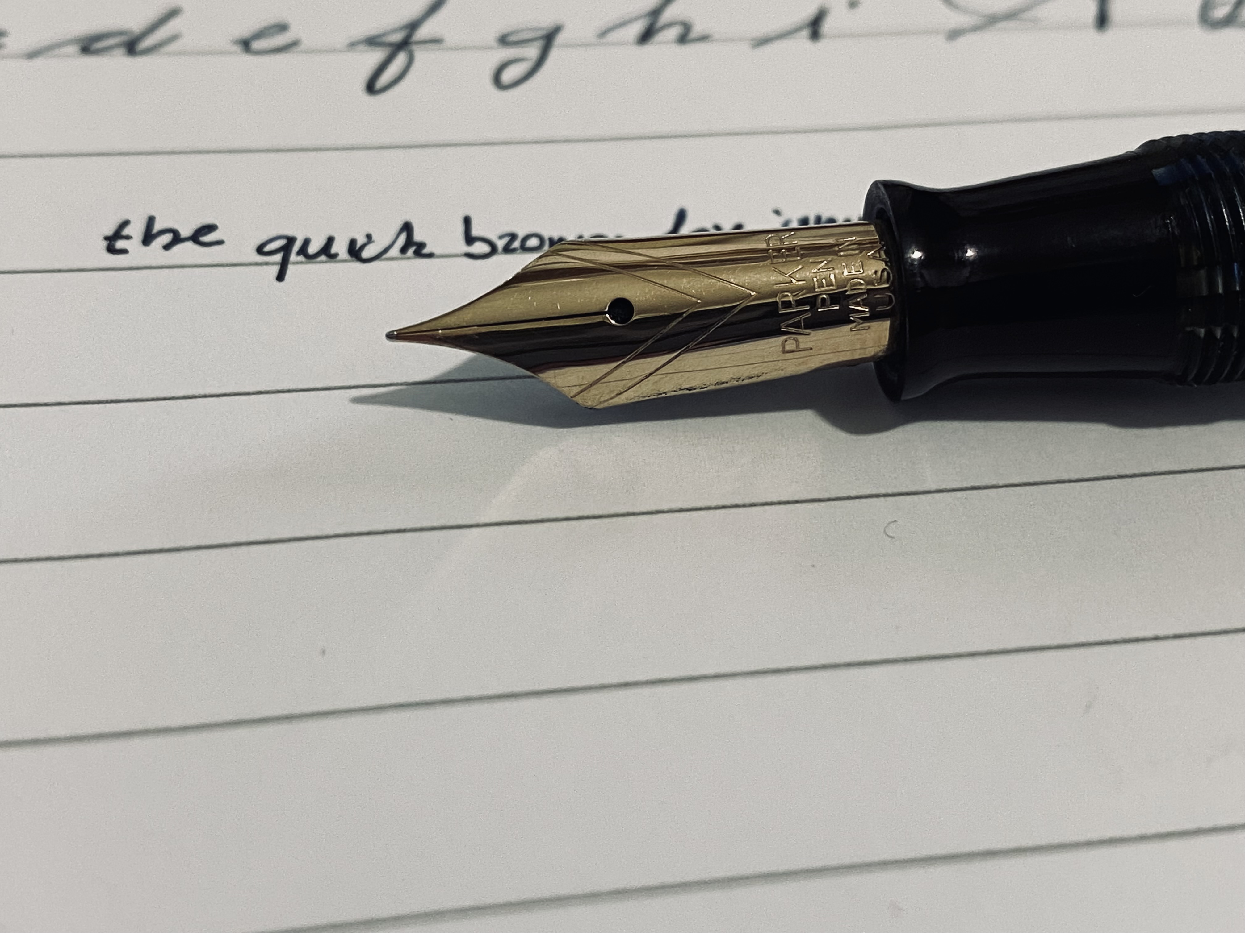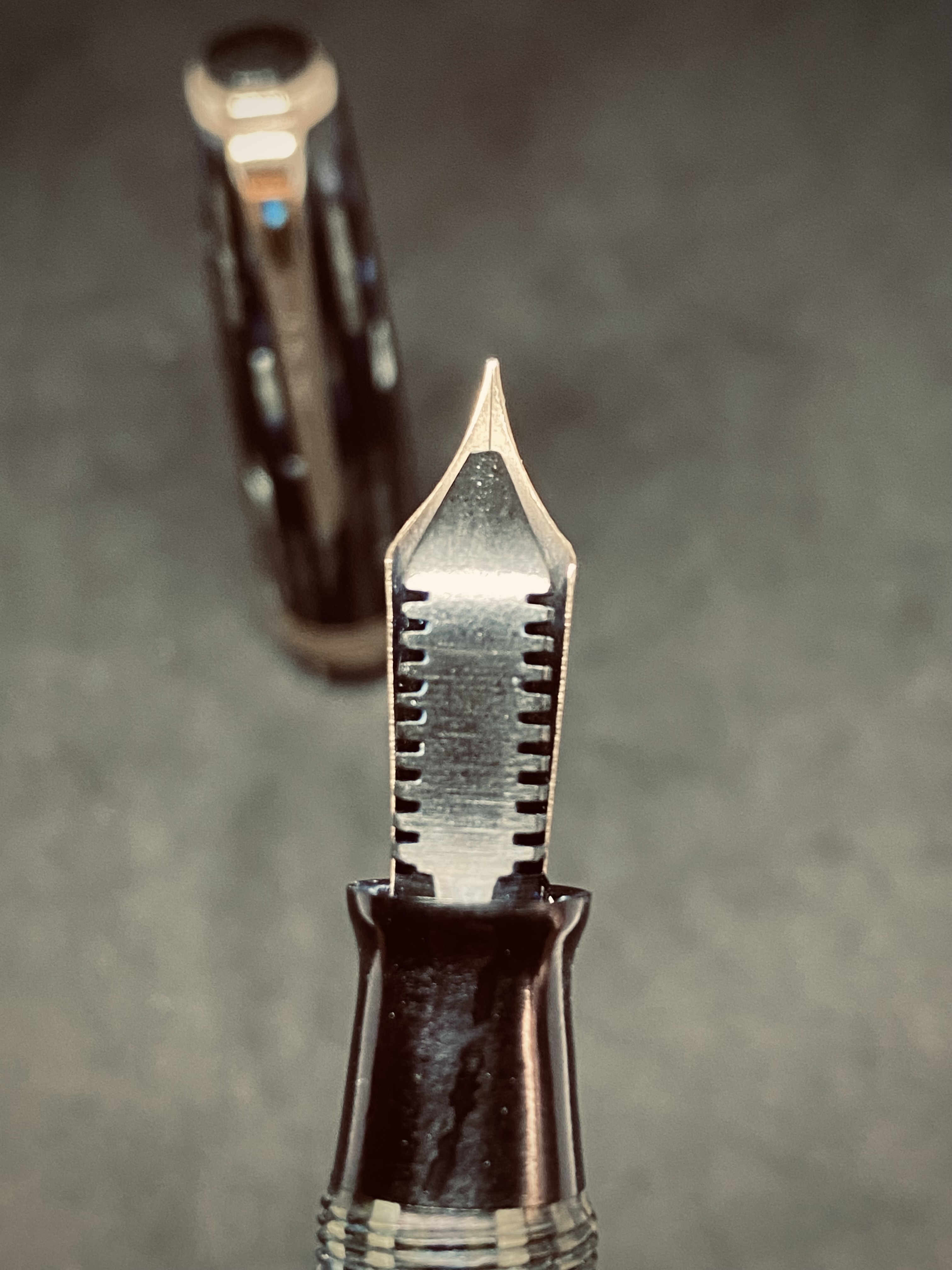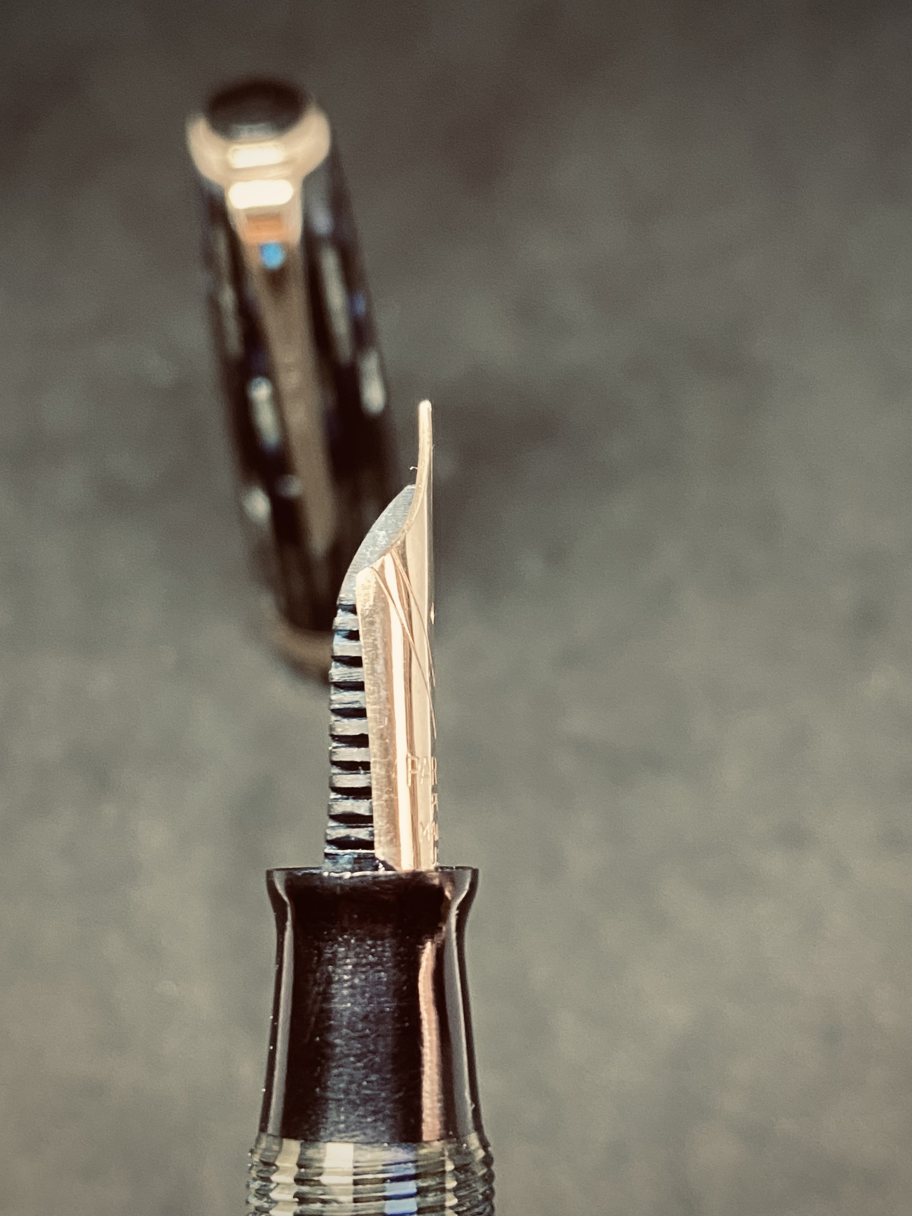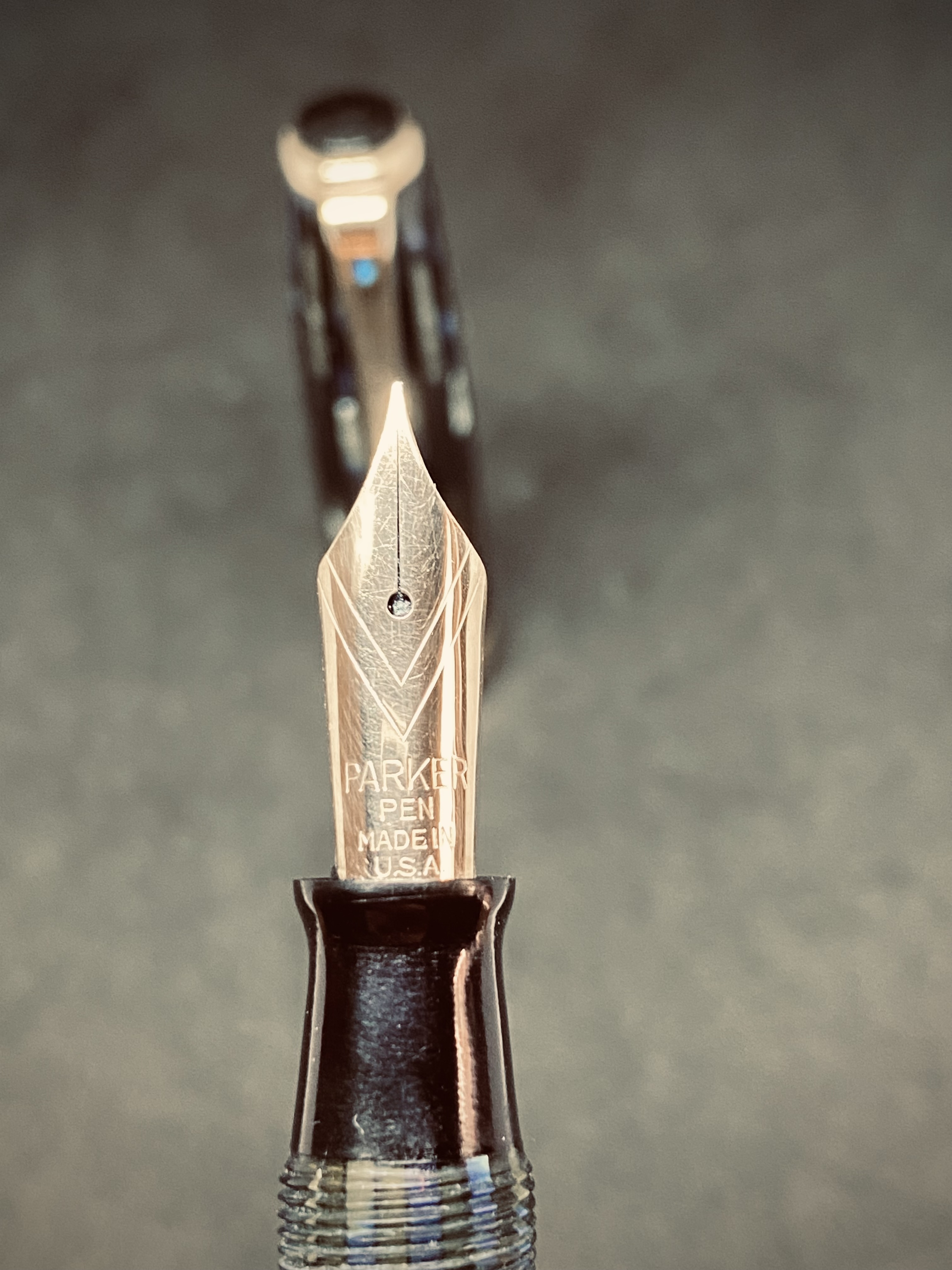Qualità ancor più evidente quando, una volta caricata la penna, si poggia il pennino sulla carta. Questo esemplare ha un pennino extra fine accoppiato con lo stesso alimentatore in ebanite che equipaggia anche le Vacumatic e che riesce a gestire in maniera perfetta il flusso di inchiostro fino all’ultima goccia. Sul pennino troviamo l’incisione a forma di "V" che Parker utilizzò esclusivamente sulla seconda versione delle Duovac.