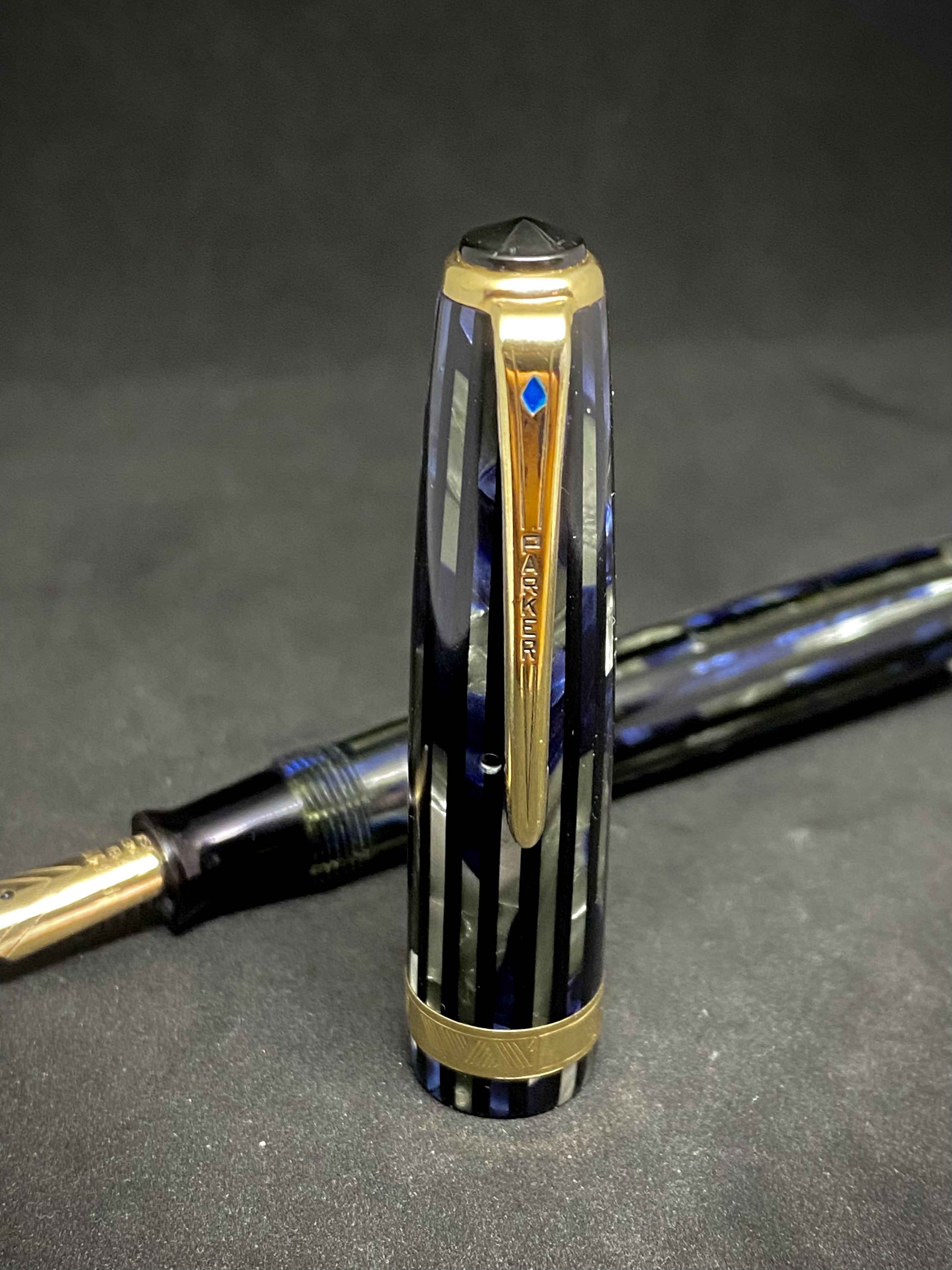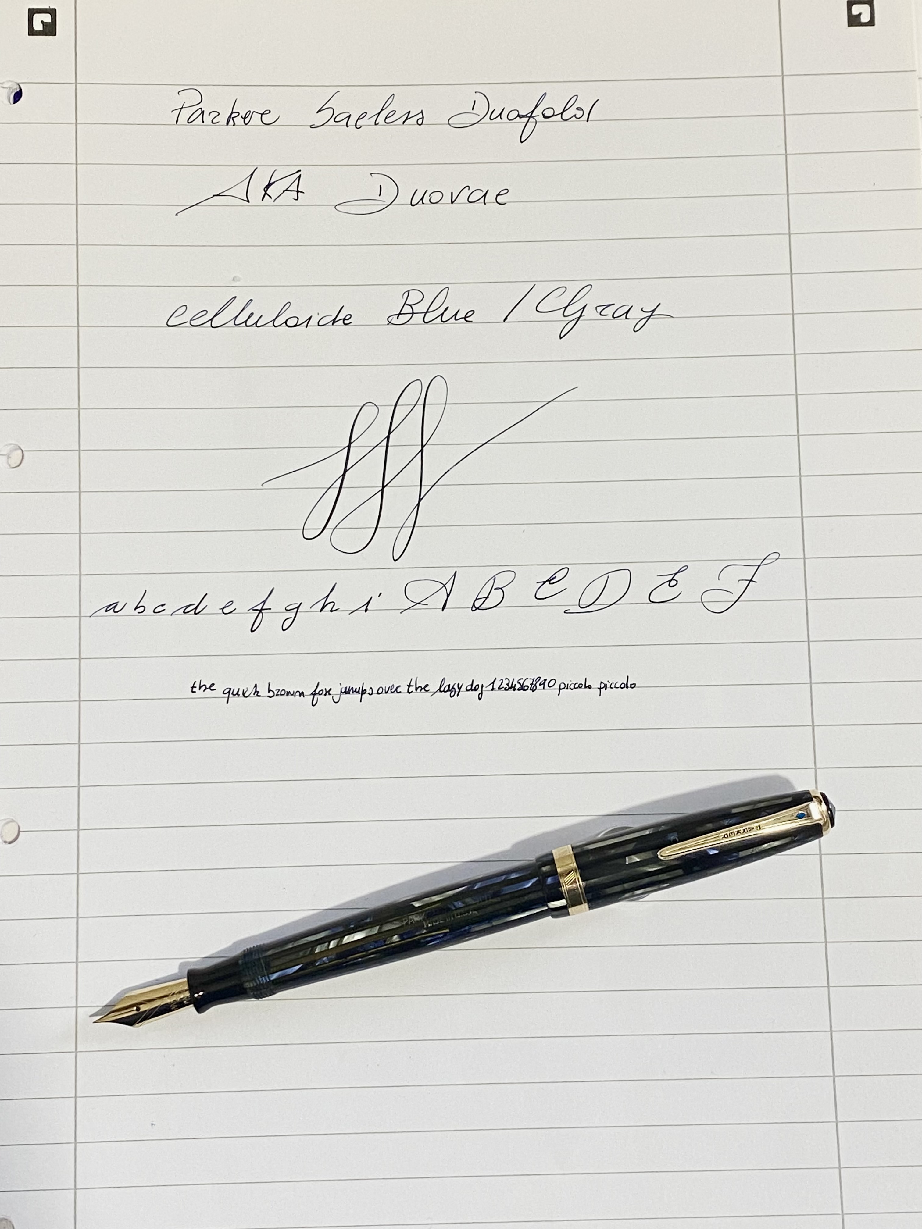 La penna in oggetto è una Parker Duofold Sacless Blue Diamond Senior in celluloide striata Blue/Gray con sistema Vacumatic speedline in plastica prodotta nel 3° trimestre del 1945. Oltre al Blue/Gray, la Duovac venne prodotta anche in celluloidi striate Dusty Rose e Green/Gold.