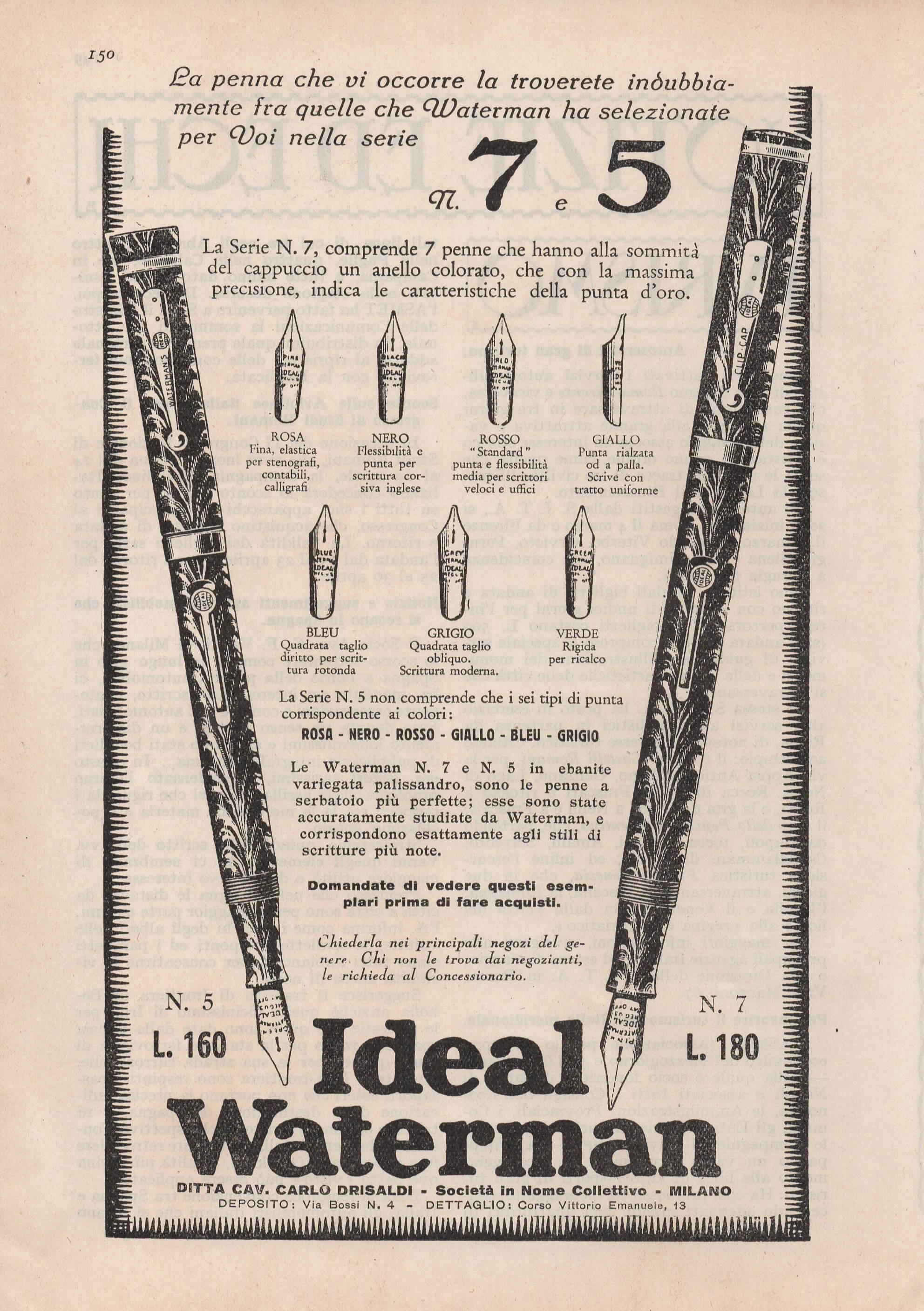 La Waterman 7 oltre ad essere una delle più riuscite realizzazioni in ebanite prodotte da Waterman, in virtù delle sue dimensioni, è una penna che risulta particolarmente pericolosa per noi collezionisti a causa del nuovo sistema di colori utilizzato. Tramite un codice di colori che veniva stampato sul pennino e indicato sul cappuccio con una banda colorata, Waterman identificava dei pennini che a loro parere erano sufficienti a soddisfare le esigenze di tutti gli utenti.