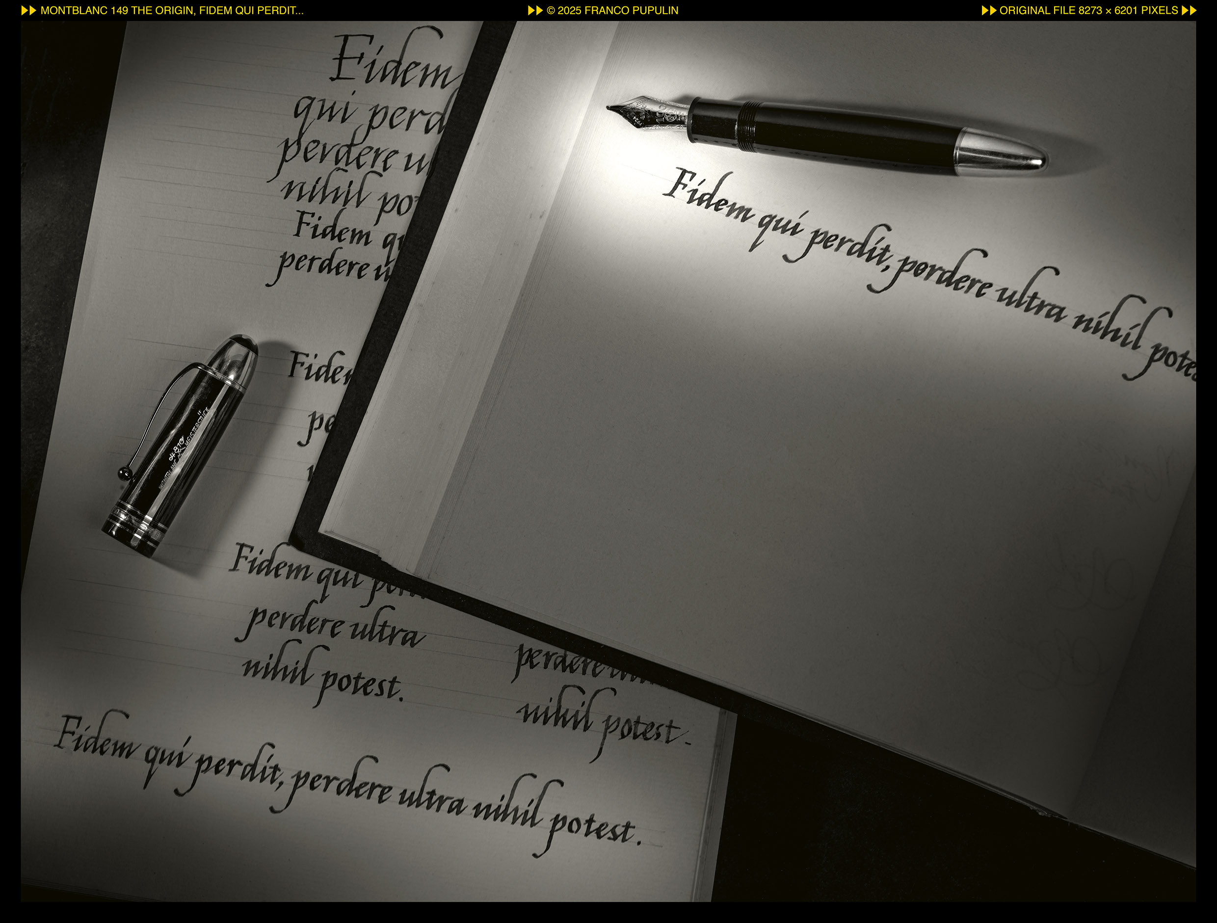Allora oggi ho fatto una fotografia. Dentro la foto ci sono scrittura, carta, una penna, luce. Ma il centro é l’espressione, libera, della fotografia. Luci e ombre, bianchi e neri e grigi che definiscono forme, sopra e sotto, volumi, e lo spazio vuoto. Non é la fotografia di un appassionato di penne, né di un calligrafo, non é per un forum di appassionati di stilografiche. É una fotografia per tutti: la fotografia é il soggetto.