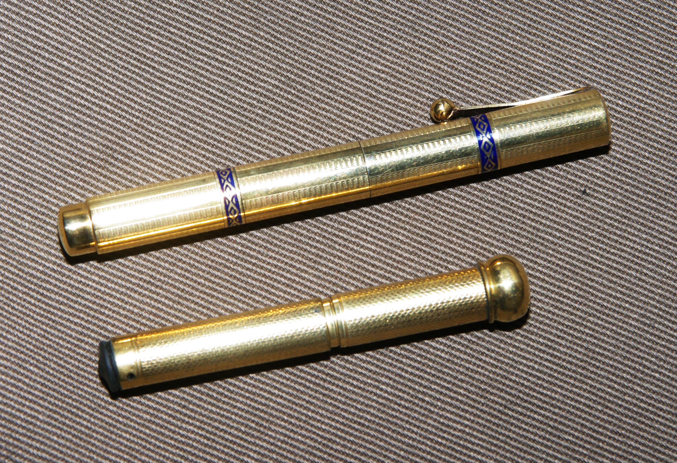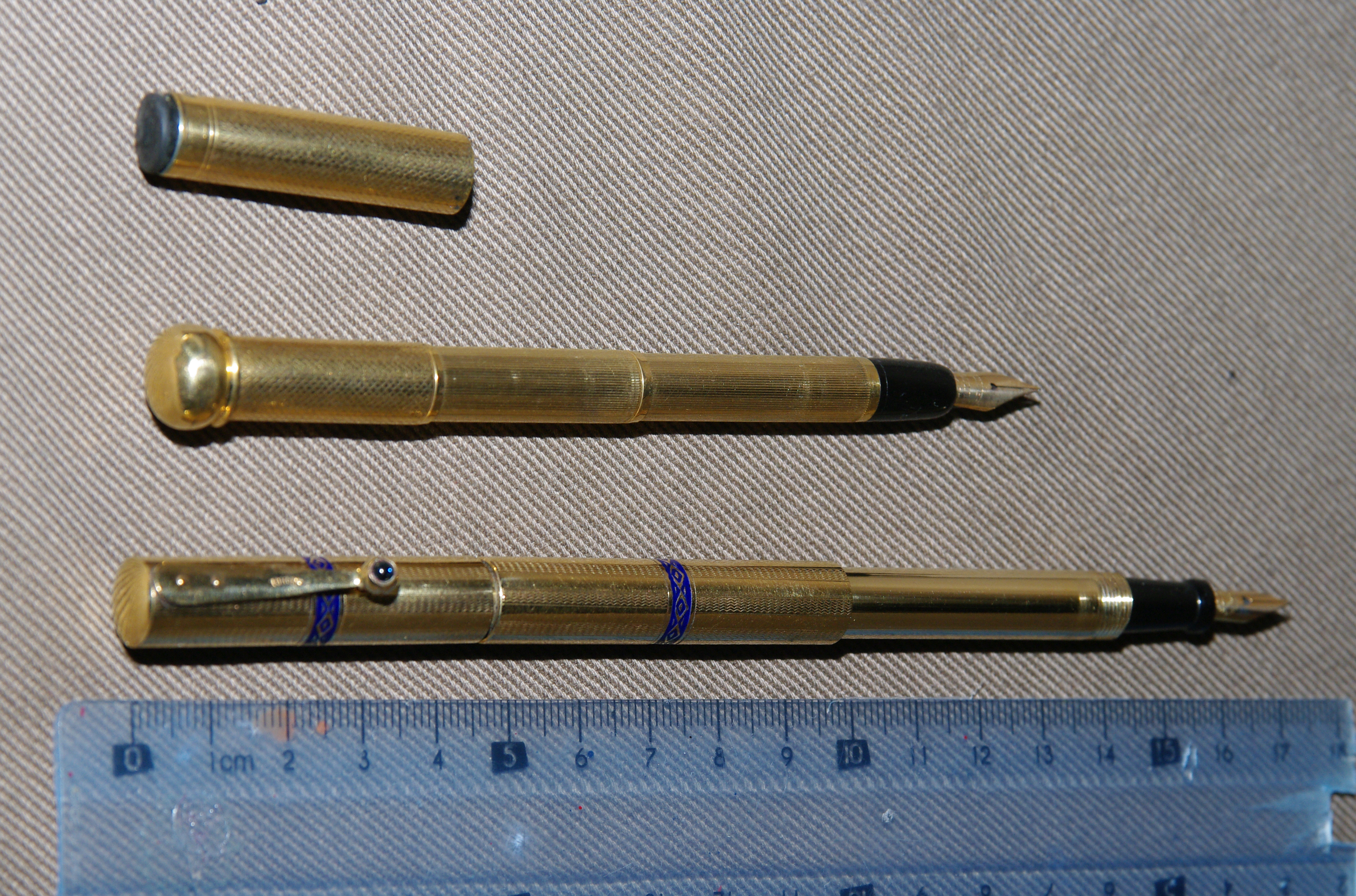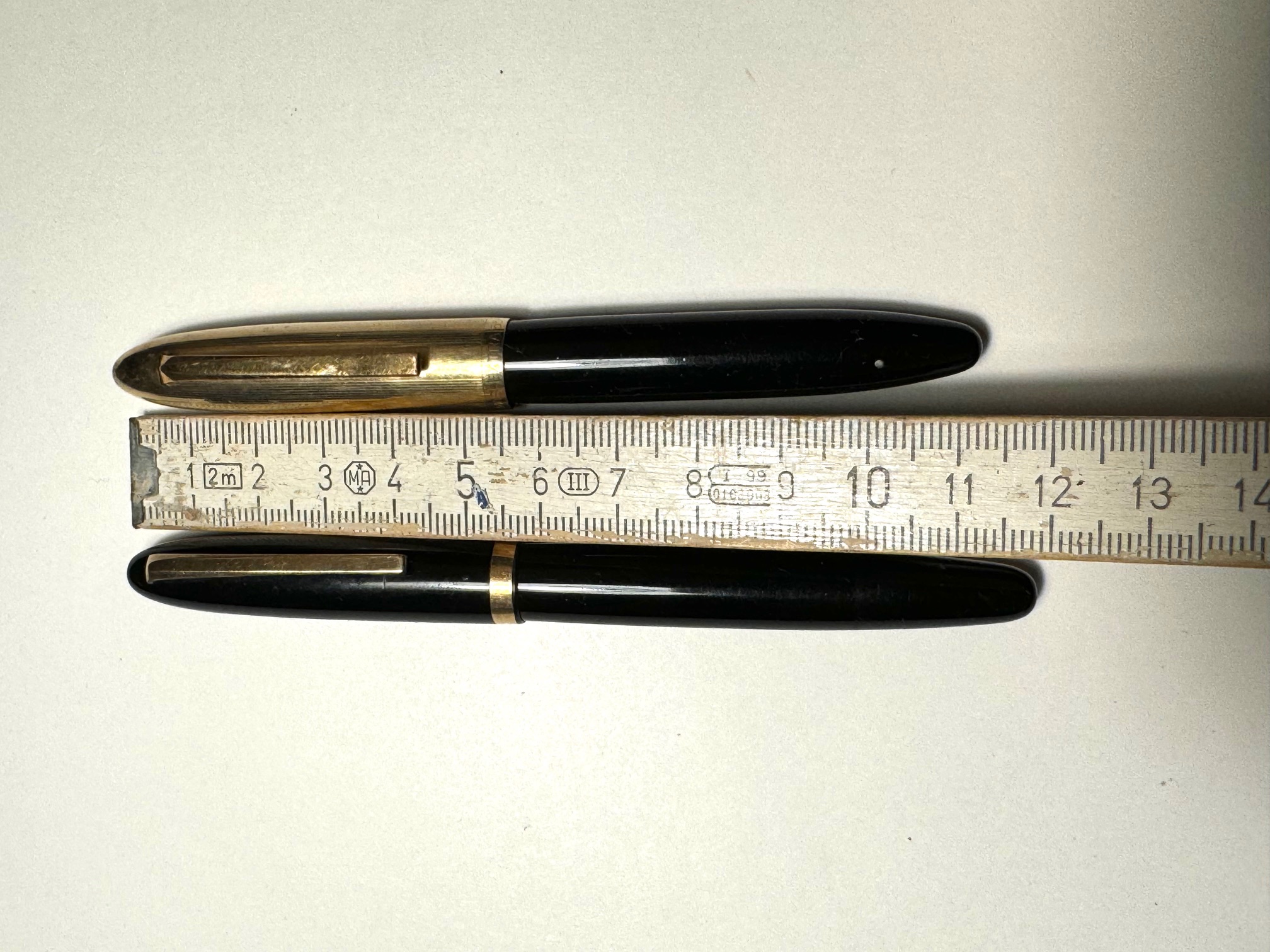 La più piccola stilografica che possiedo è questa olandesina/tedesca con caricamento a pulsante di fondo , 11.7 cm da chiusa, 10,7 cm aperta.