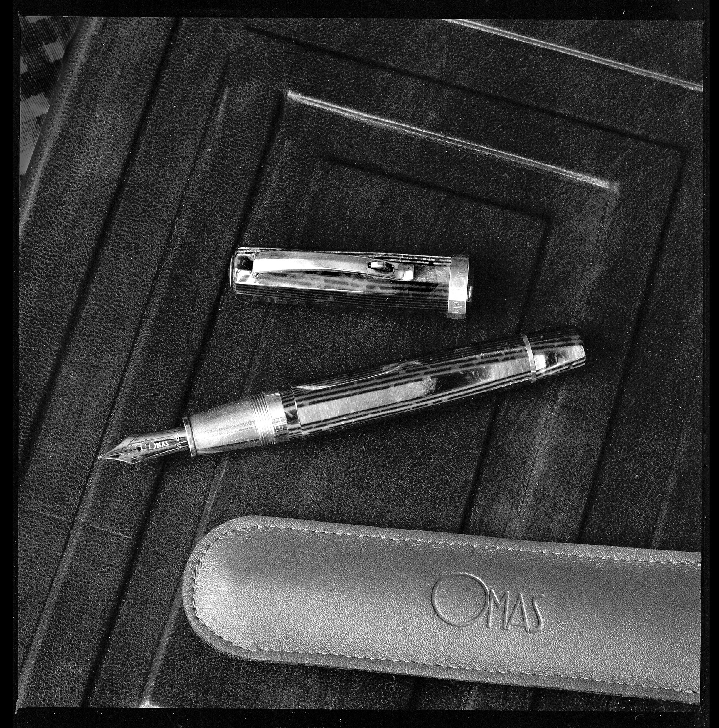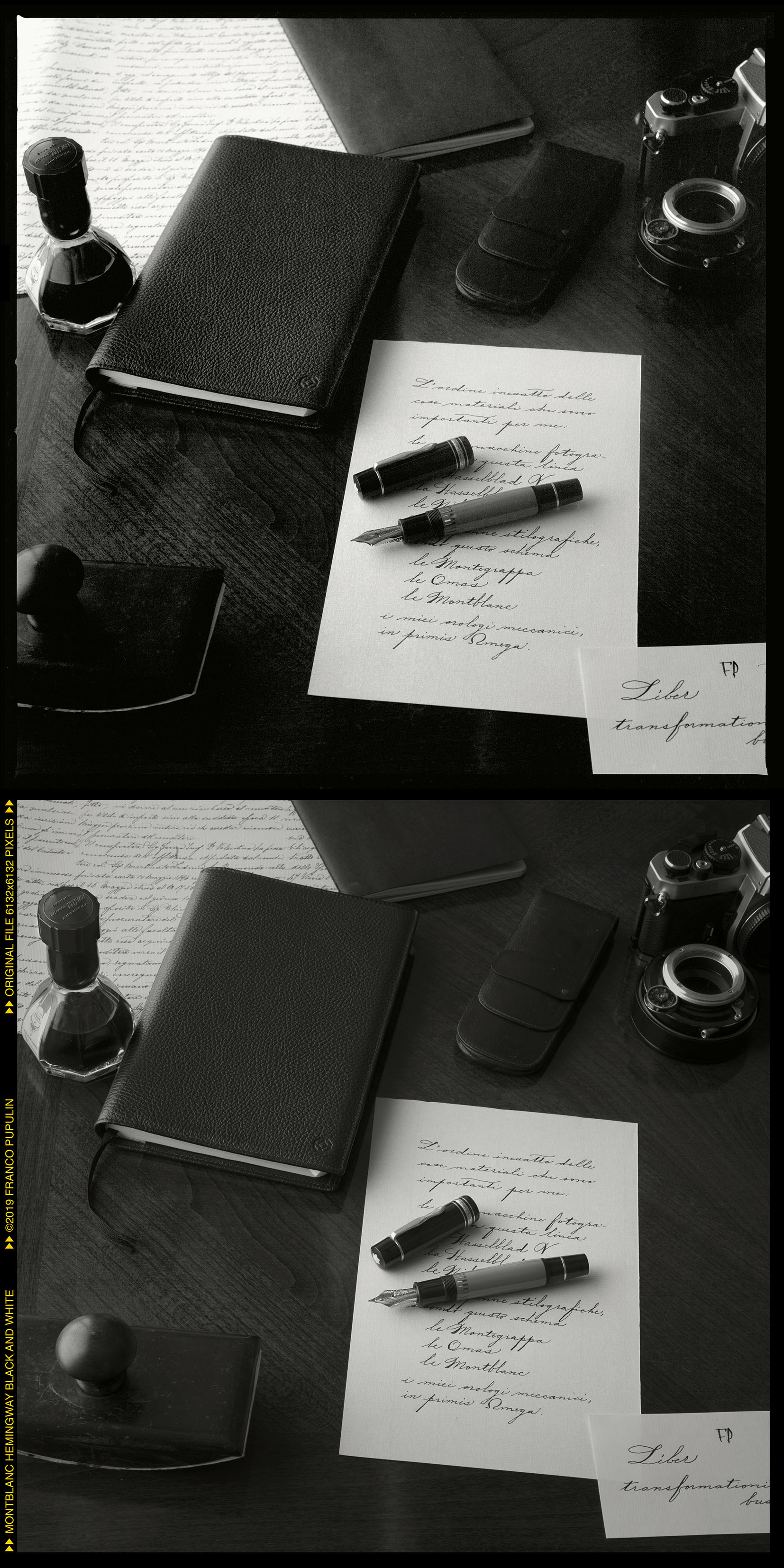 Anche in questo caso, il sensore (sotto) é più bravo nella cattura dei dettagli fini, ed eccelle nella sua capacità di registrare informazione nelle alte luci e nelle ombre profonde. Però, nell'immagine ottenuta sulla pellicola, la penna Hemingway, il quaderno di pelle martellata, i fogli scritti, la boccetta d'inchiostro, tutto é più vivo e reale.