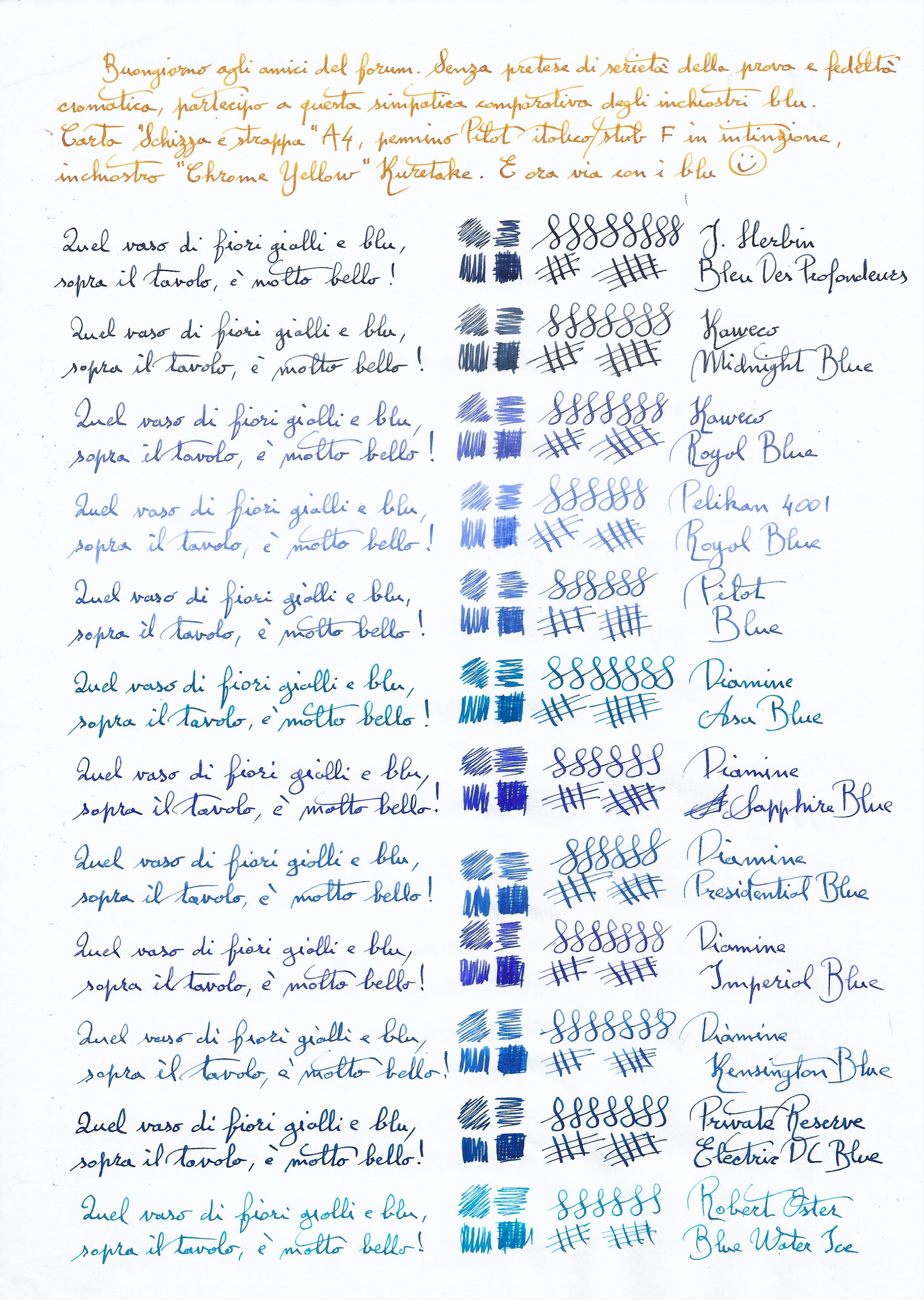 Ad ogni modo, le prove di scrittura che si condividono qui, o che si trovano nei siti, rimangono molto utili: si capiscono tante cose circa il comportamento dei pennini e degli inchiostri usati, e delle diverse combinazioni pennino-inchiostro. Inoltre, un confronto come questo proposto da Silvia permette comunque di avere un ottimo riscontro delle differenze tra diversi inchiostri perché, al netto della maggiore o minore fedeltà nella resa dei colori, le differenze di comportamento (di saturazione, ombreggiatura ecc.) sono chiaramente apprezzabili.