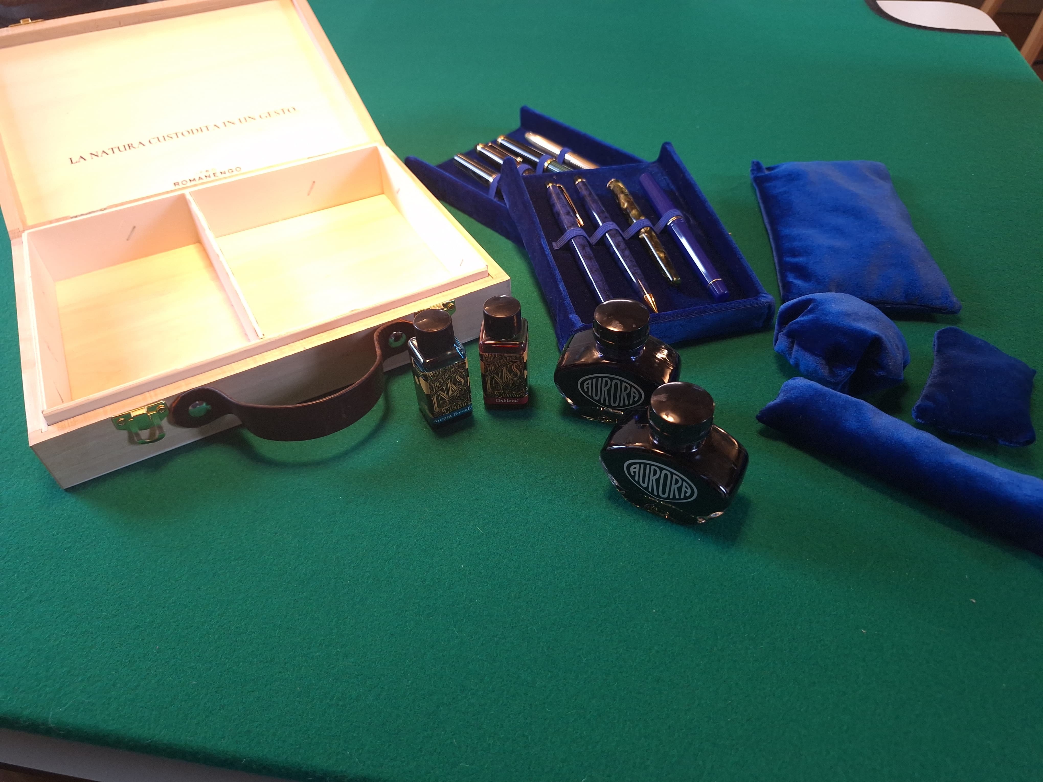 Idea molto carina! Io sarei molto preoccupato per la fuoriuscita di inchiostro dai calamai...e proprio gli inchiostri aurora nero che vedo che ho anche io, pur tenendo su il tappino aggiuntivo di plastica oltre al tappo a vite a me trafilano un pochino pur essendo tenuti a tappo in su. Ed anche gli inchiostri da 30 ml della Diamine non mi danno tutta questa sicurezza...il tappo mi sembra un po' fragilino. Ma magari è una fissazione tutta mia.