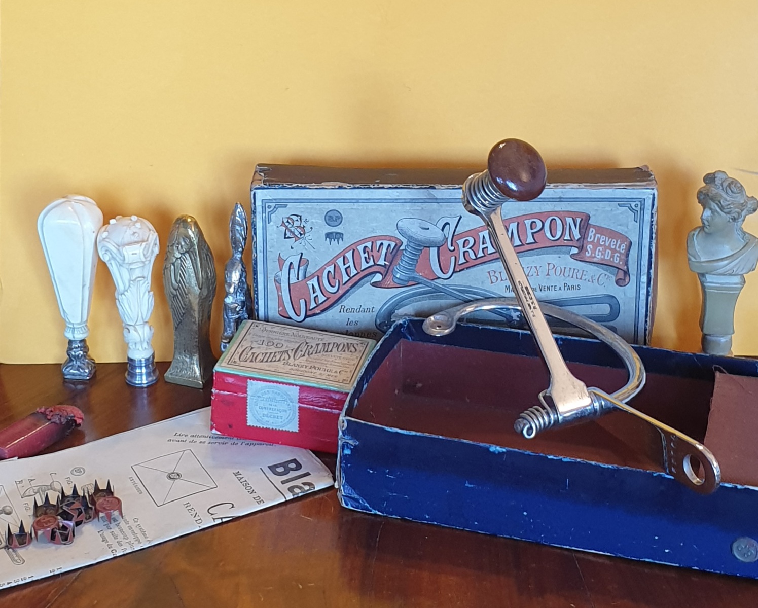 Cachet crampon per l’applicazione di graffette di forma circolare, decorate con monogrammi o simboli grafici, progettata per sigillare le buste della corrispondenza. Realizzata dalla ditta francese Blanzy Poure & C., fondata nel 1898 e famosa soprattutto per la produzione di pennini da intinzione.