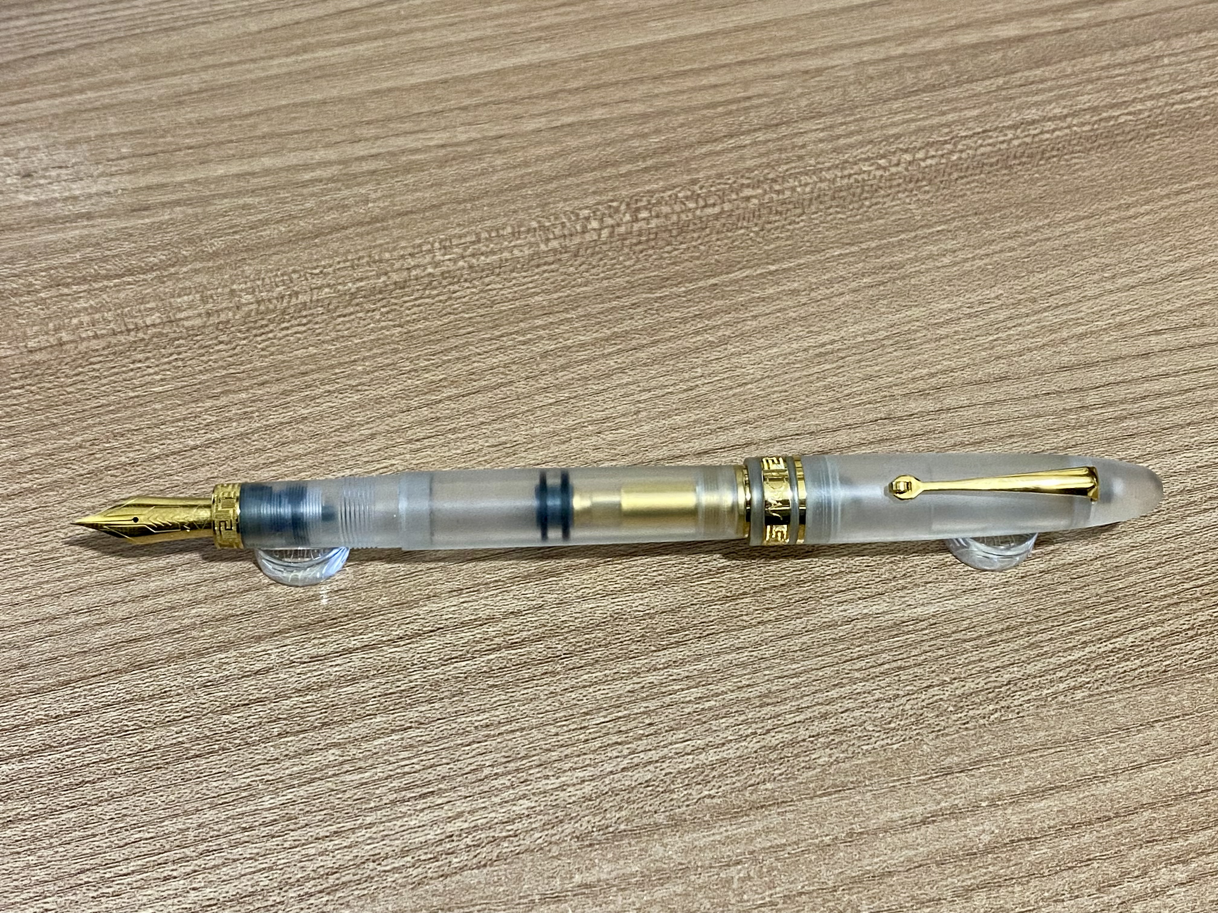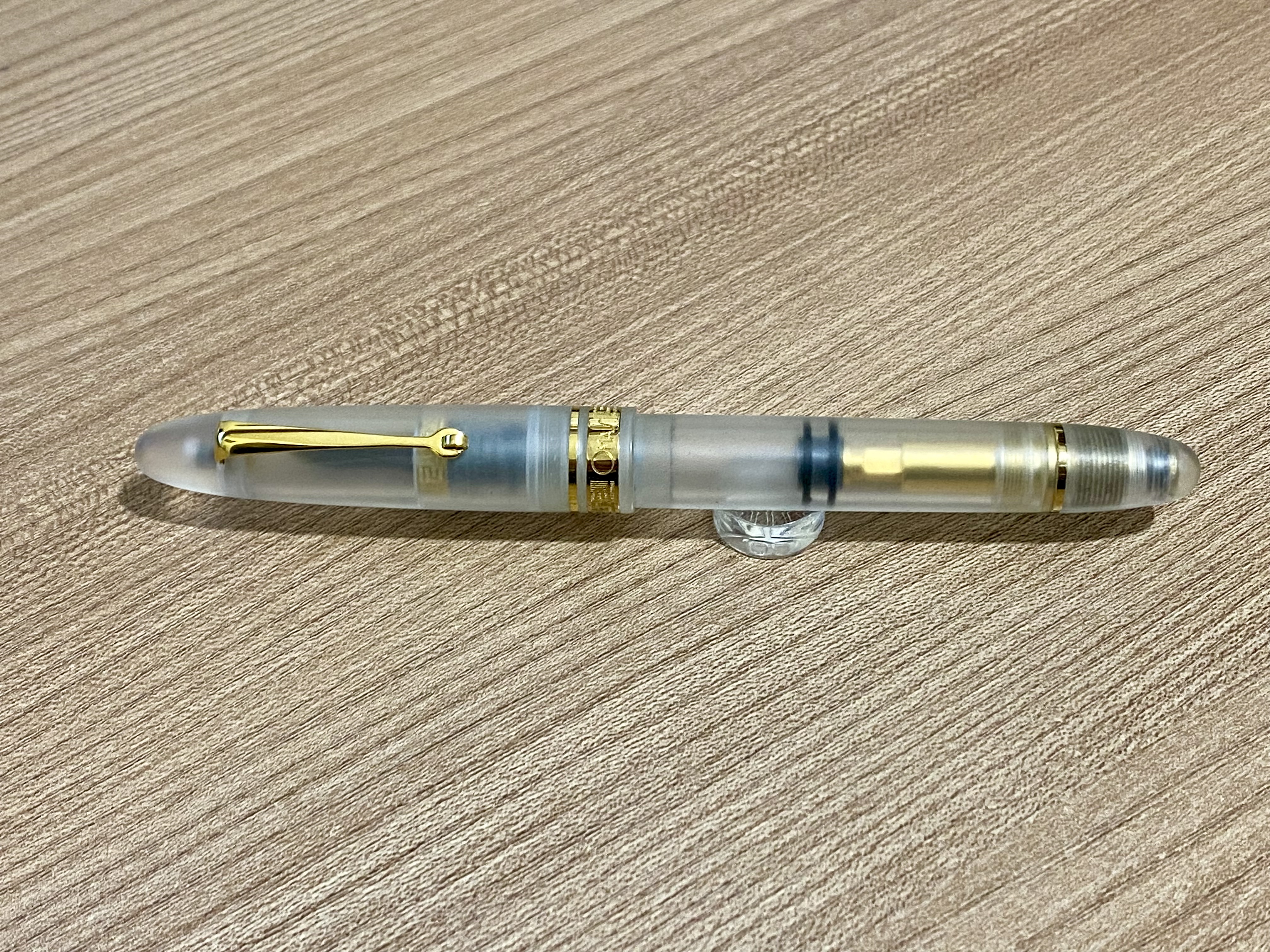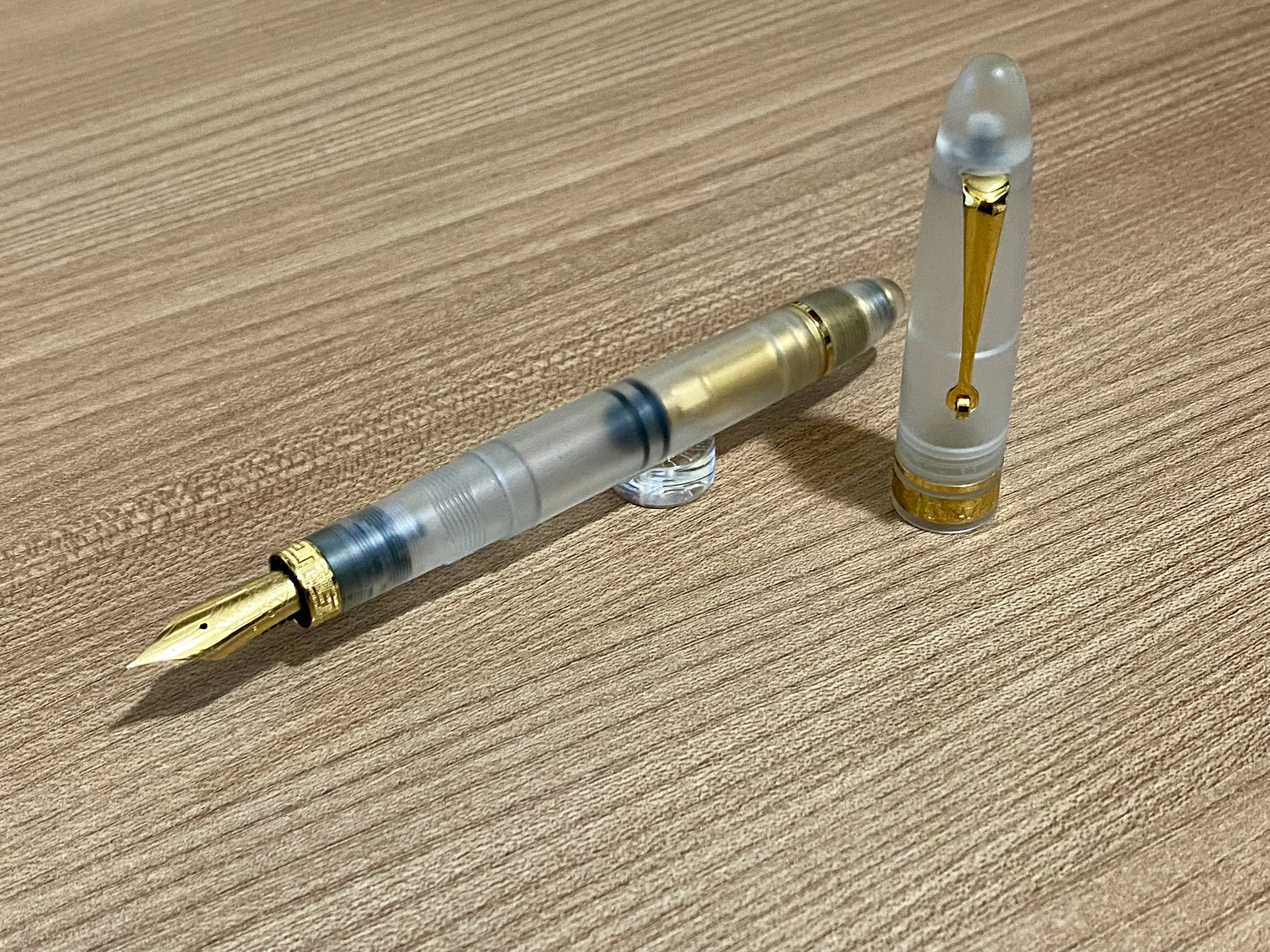La penna in questione è una OMAS ogiva Demonstrator realizzata in resina semitrasparente tipo frosted. L'esemplare che ho scelto ha le finiture metalliche dorate, ma era disponibile anche con finiture silver. Eccola.