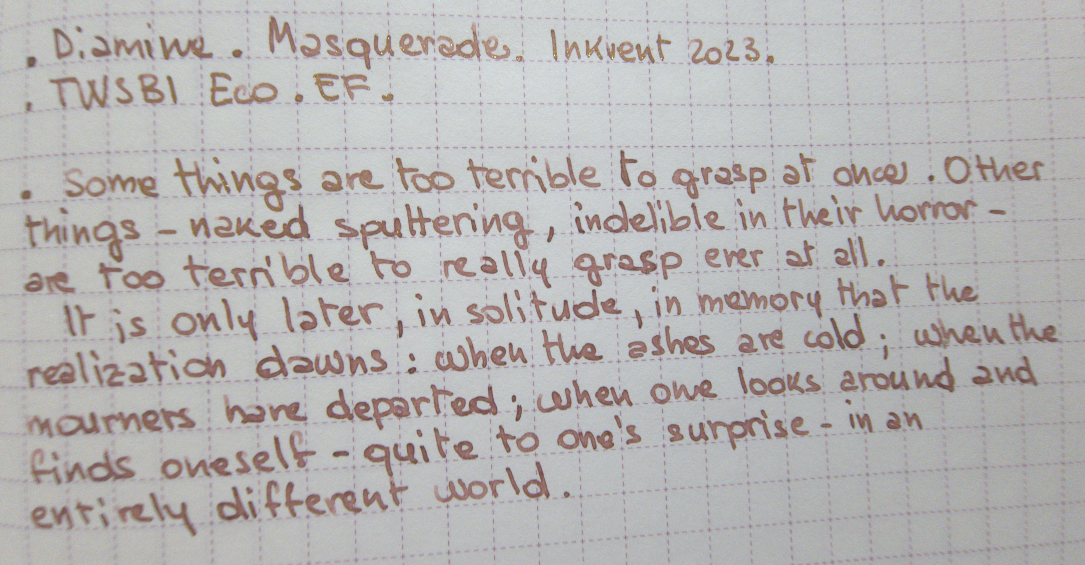 Questo è uno di quegli inchiostri che - regolarmente - mi fa salire la tentazione di comprarne una boccia intera. Finora non l'ho fatto per la sua tendenza a marroneggiare (avere una tonalità un po' troppo marrone, per i miei gusti). Tuttavia, è proprio questa caratteristica che lo rende diverso dal "solito" rosa. Ricorda broccati antichi, velluti settecenteschi, arazzi. Trovo che sia un colore molto evocativo.