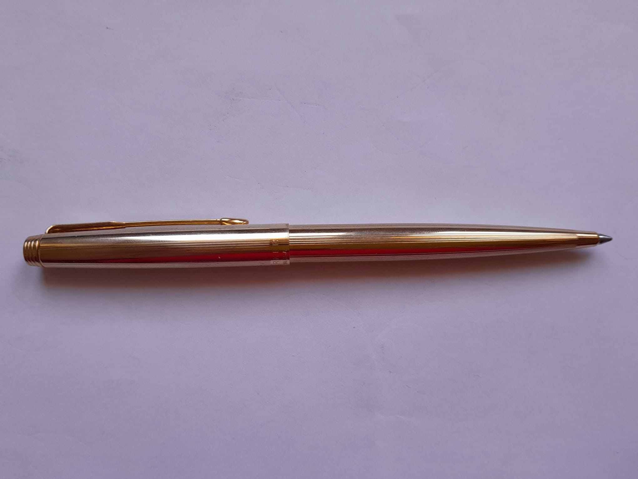 Buongiorno. Chiedo il vostro aiuto per identificare esattamente la penna a sfera di cui allego la foto. Da completo neofita, ho scoperto l'acqua calda: che riconoscere le penne cercando immagini in rete è molto più complicato del previsto, perché penne apparentemente identiche differiscono per dettagli minimi (che però magari influiscono in maniera significativa sul loro valore). Setacciando la rete ho trovato immagini di penne simili, ma nessuna identica. Parker MADE IN USA è tutto quello che è scritto, a metà del fusto. Grazie mille!