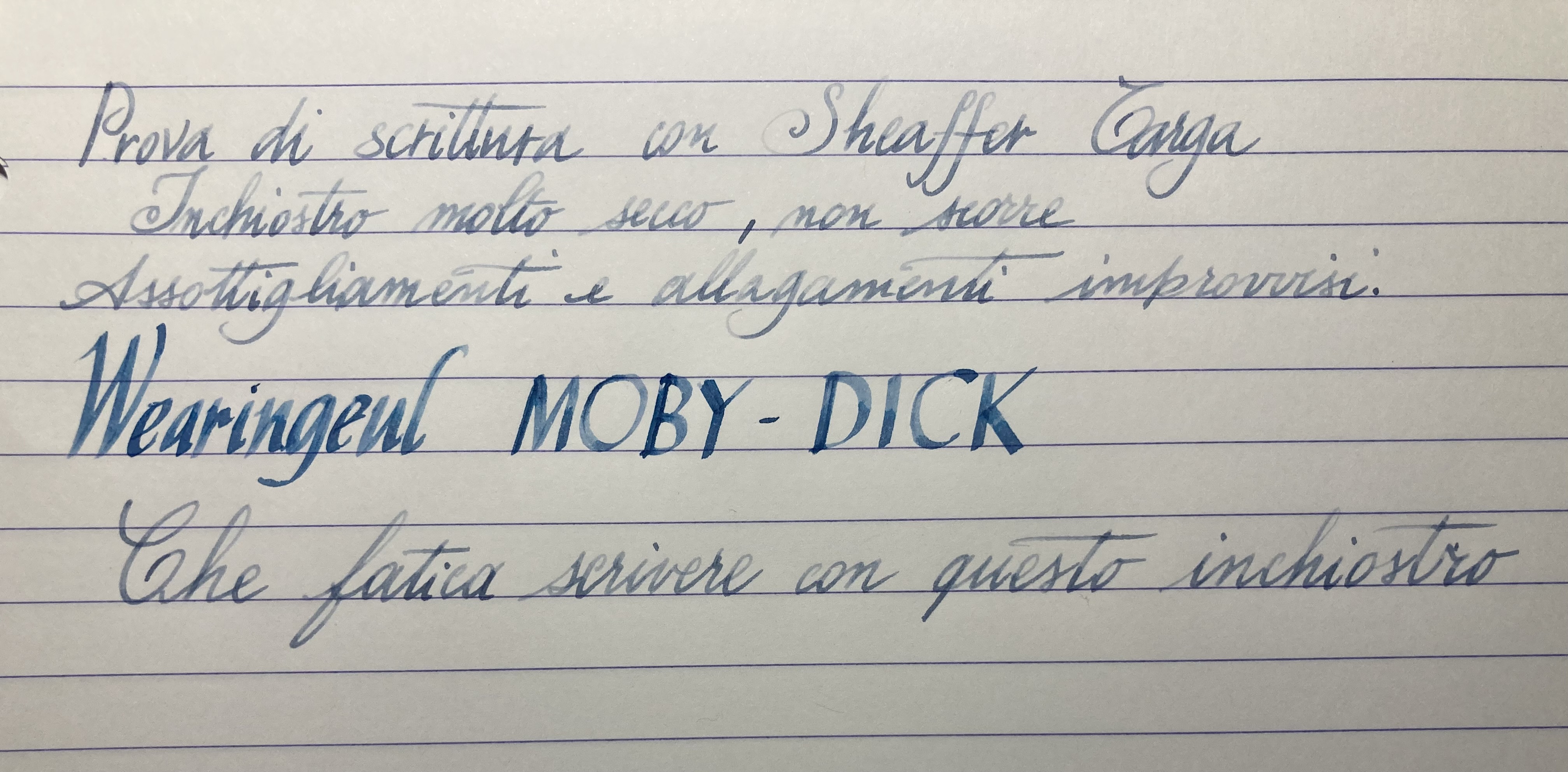 Condivido con voi alcune impressioni di scrittura con l’inchiostro del titolo. Ce l’ho da diversi mesi, è una tinta che mi piace molto ma è tremendamente secco e poco scorrevole, l’ho provato su diverse penne sempre con lo stesso risultato. È molto affaticante. Qualcuno ha impressioni simili? Allego una demo su unquaderno Clairfontaine con Sheaffer Targa e una penna Buffetti con punta 2.0 calligrafica.