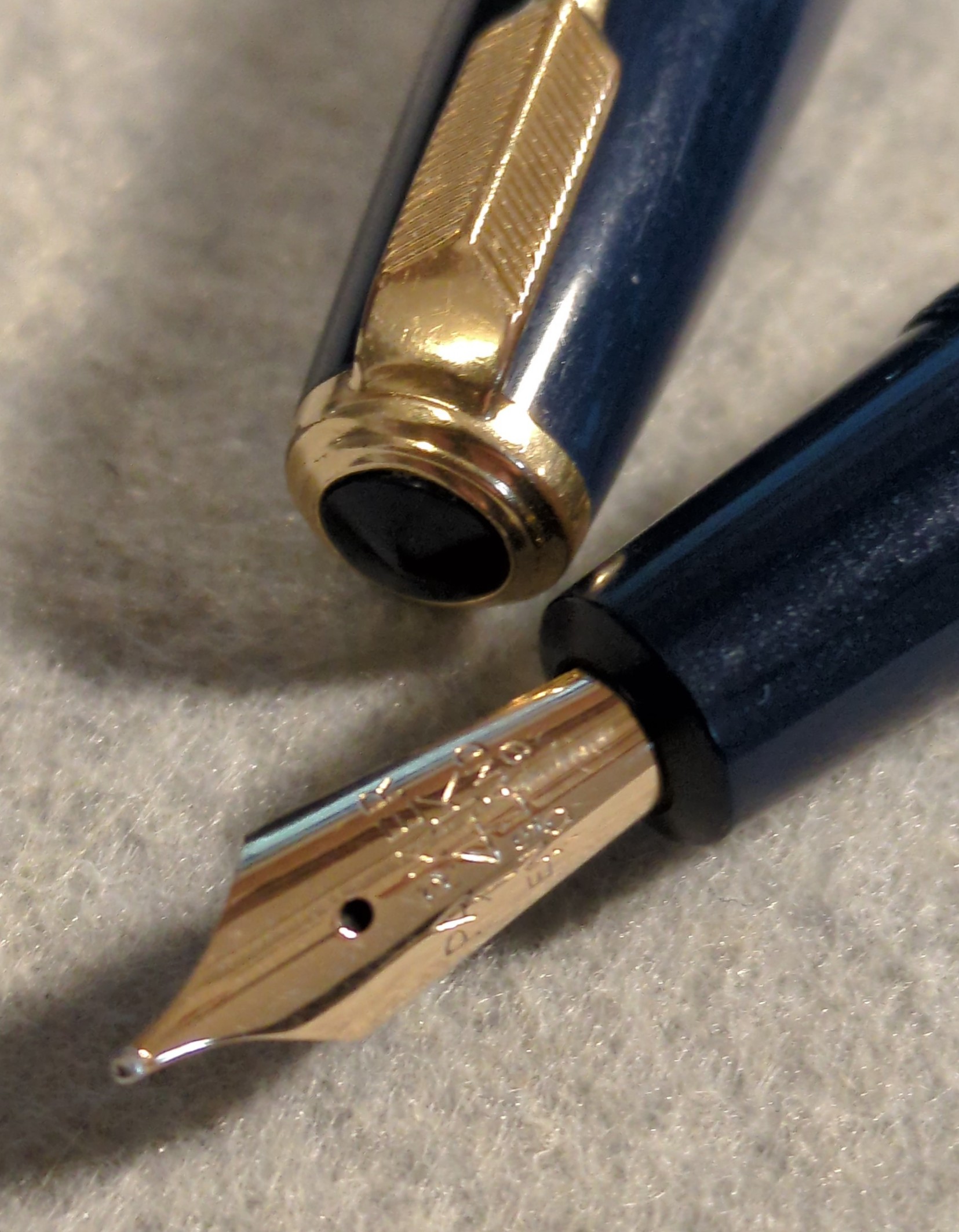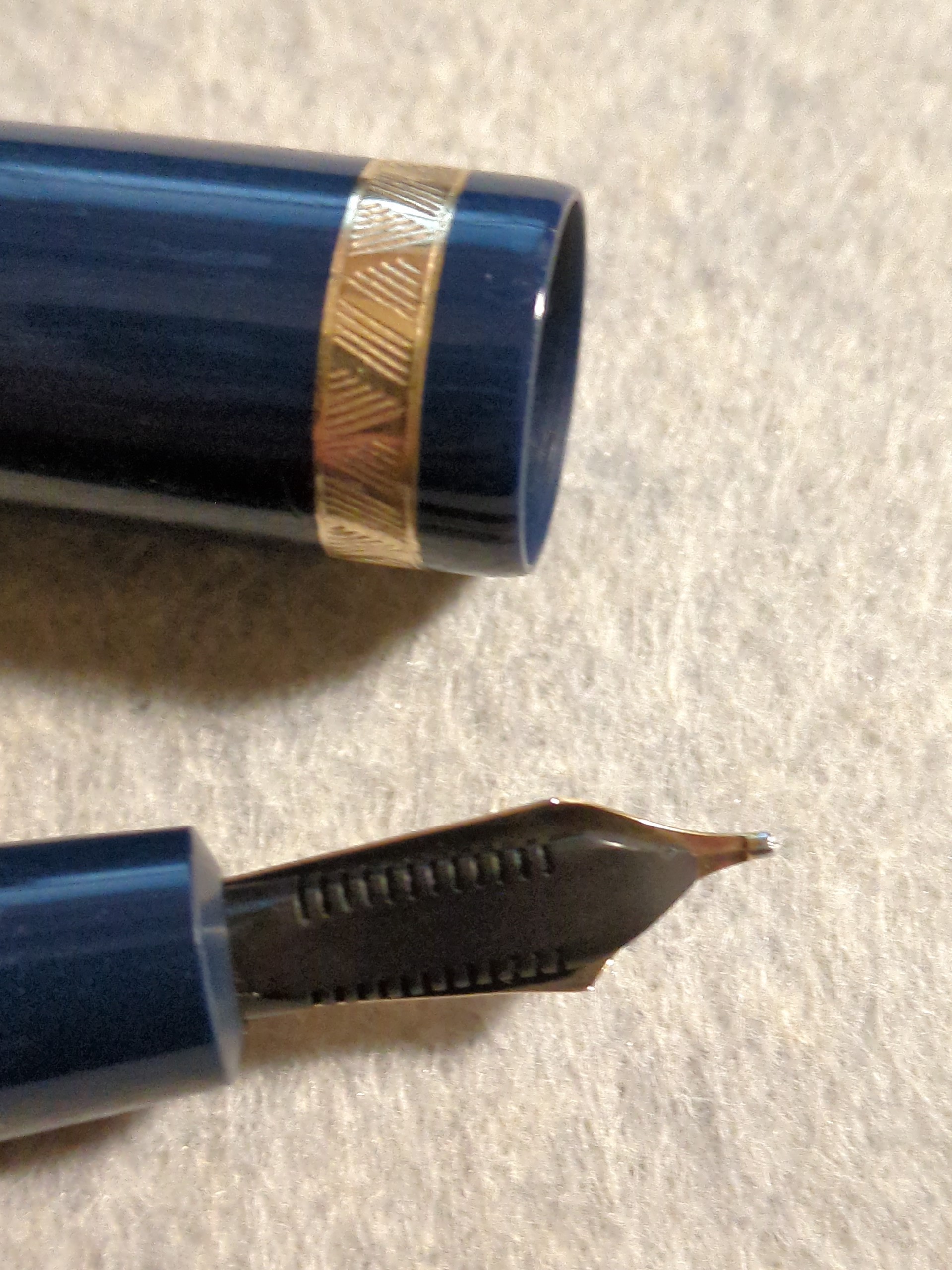 Il pennino in oro 14k (585), stretto e allungato, presenta un foro di aereazione circolare al di sotto del quale sono incisi: