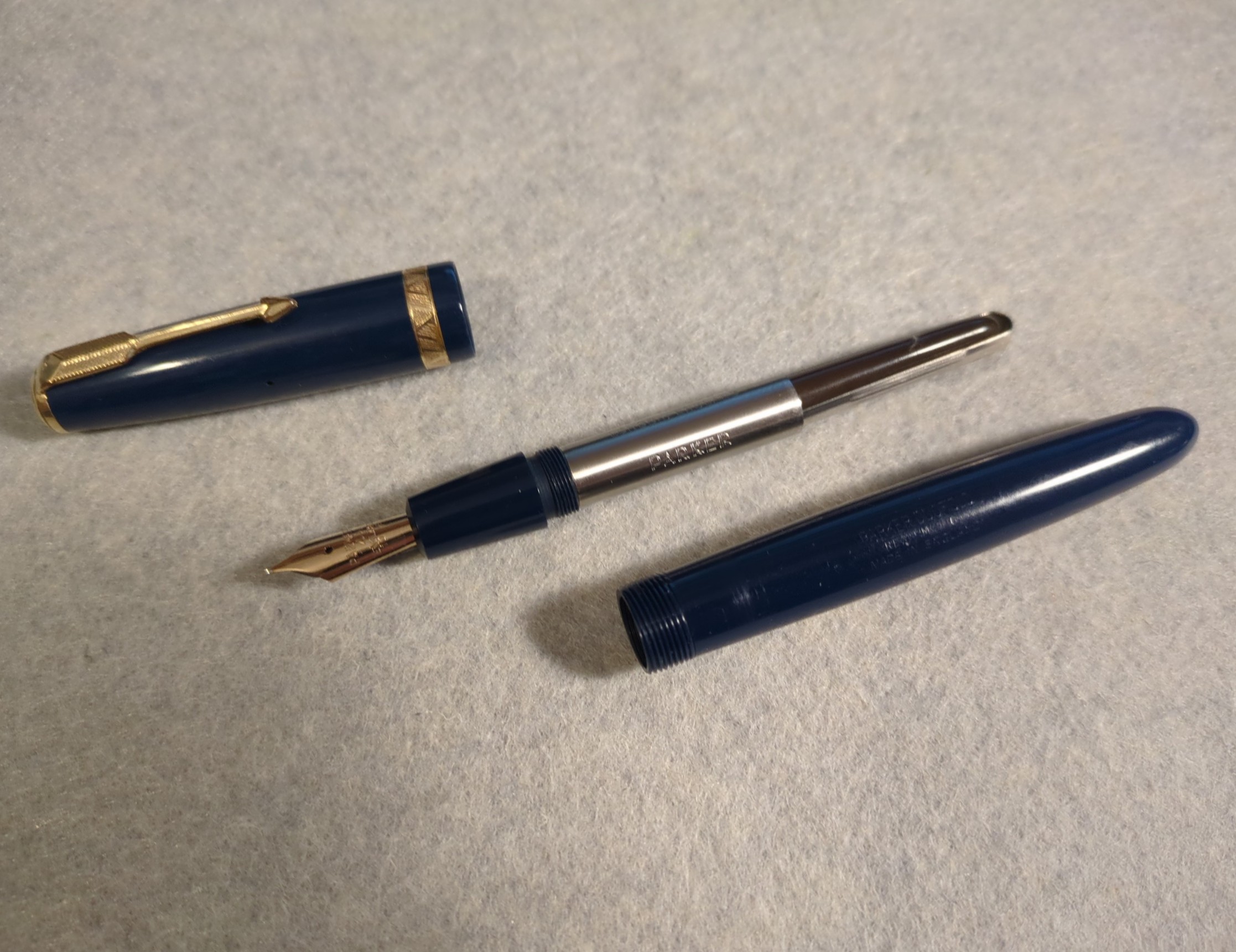 Dalle ricerche effettuate (parkerpens.net, penhero.com, dirck.delint.ca ecc.) la penna è una Parker New Duofold, nella colorazione Blue, di fabbricazione inglese.