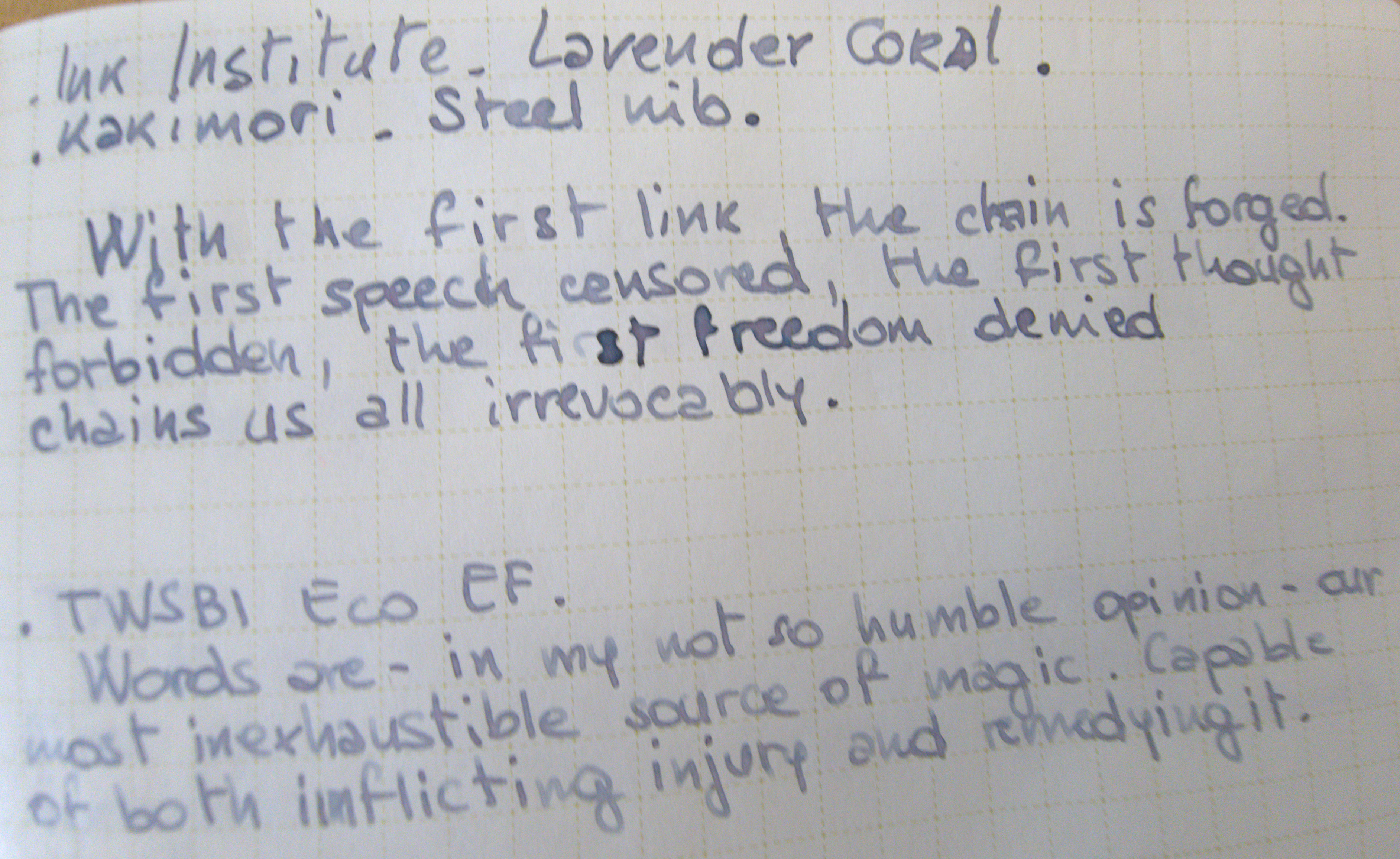 1. quando voglio cambiare inchiostro, mi è facile sfogliare le pagine del mio raccoglitore di gatti o dei quaderni sui cui ho i sample e scegliere cosa mi va di metterci nella penna. Ho troppi inchiostri per ricordare accuratamente ogni singola sfumatura che possono assumere usandoli;