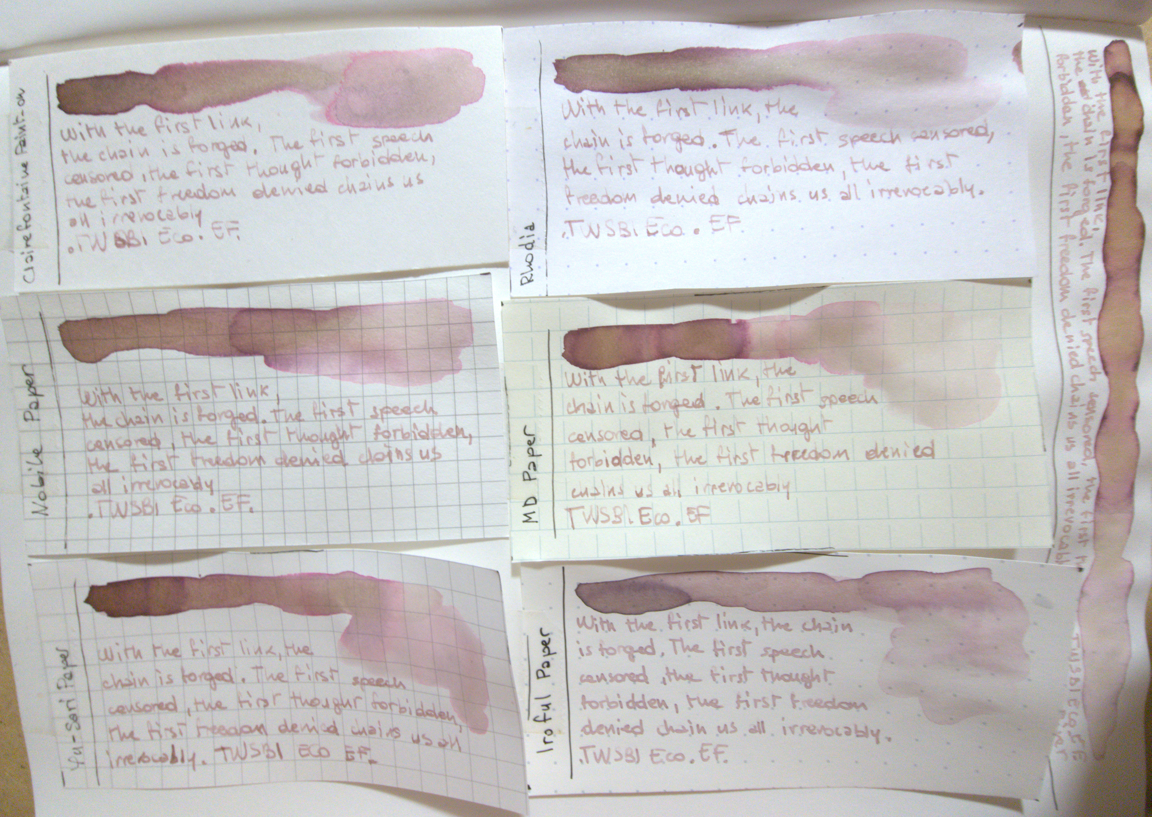 Ho, per esempio, provato da poco la carta Nobile, di Wearingeul, e tende a scurire la resa degli inchiostri. Ho provato la Yu-Sari e ha una resa bellissima. Ho provato la MD (gialla) ed è terribile per i miei gusti. Ogni carta ha il proprio carattere ed è utile provare lo stesso inchiostro su più carte per capire come si comportano... le carte, più che gli inchiostri.