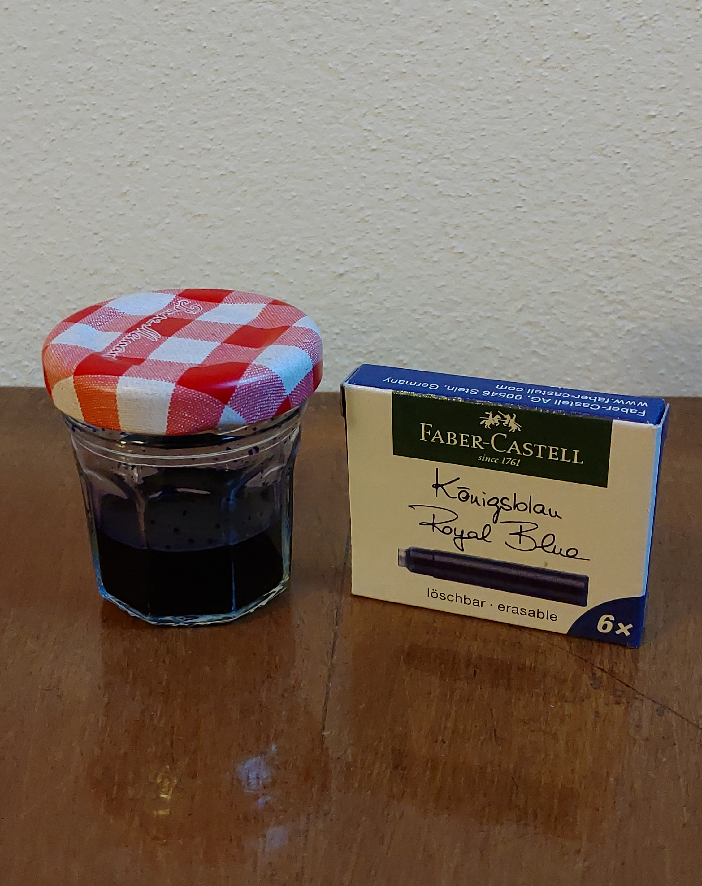 Quando ancora non possedevo i convertitori, non ci è voluto molto a capire che per usare un certo inchiostro in una penna incapace di accettarne la cartuccia avrei potuto fabbricare io stesso la cartuccia necessitata. Perciò, in un robusto contenitore di vetro (stavolta in origine ospitava delle gustosissime caramelle), conservo alcune dozzine di cartucce debitamente ripulite, che alla bisogna provvedo a ricaricare per mezzo di una siringa.