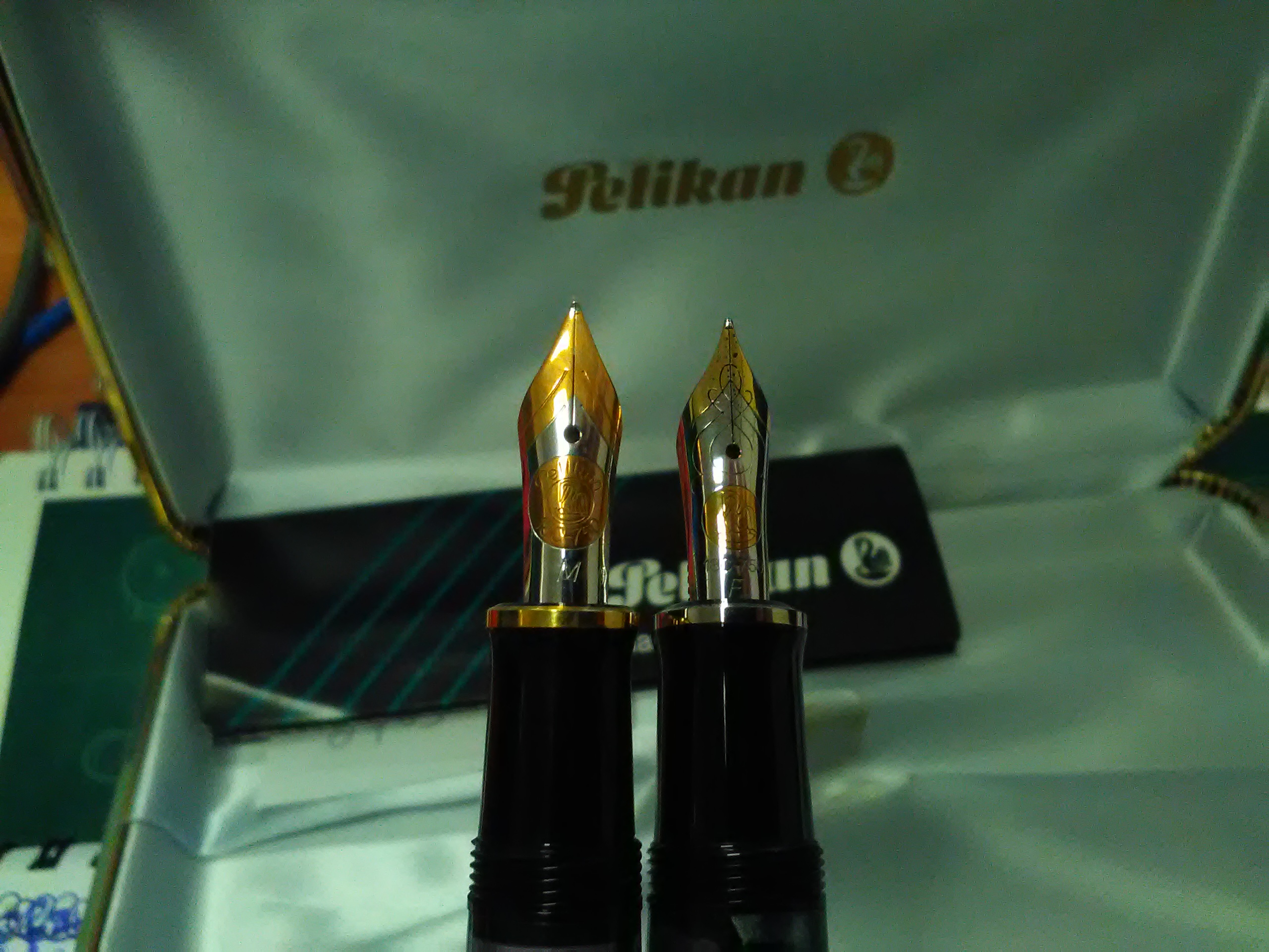M600 nera con pennino M bicolore 18 kt, stasera la carico e la confronto con la M600 Chicago, pennino F 18 kt, a destra