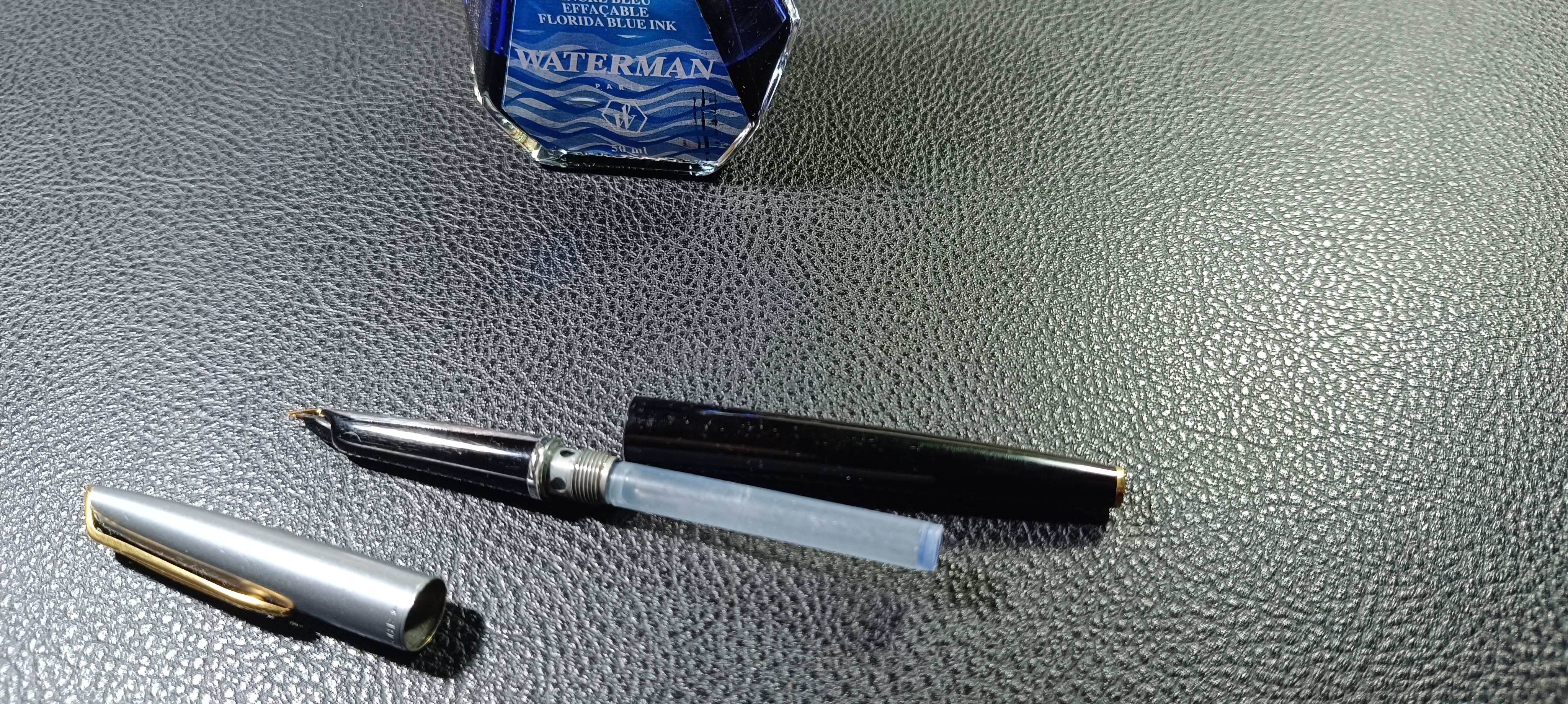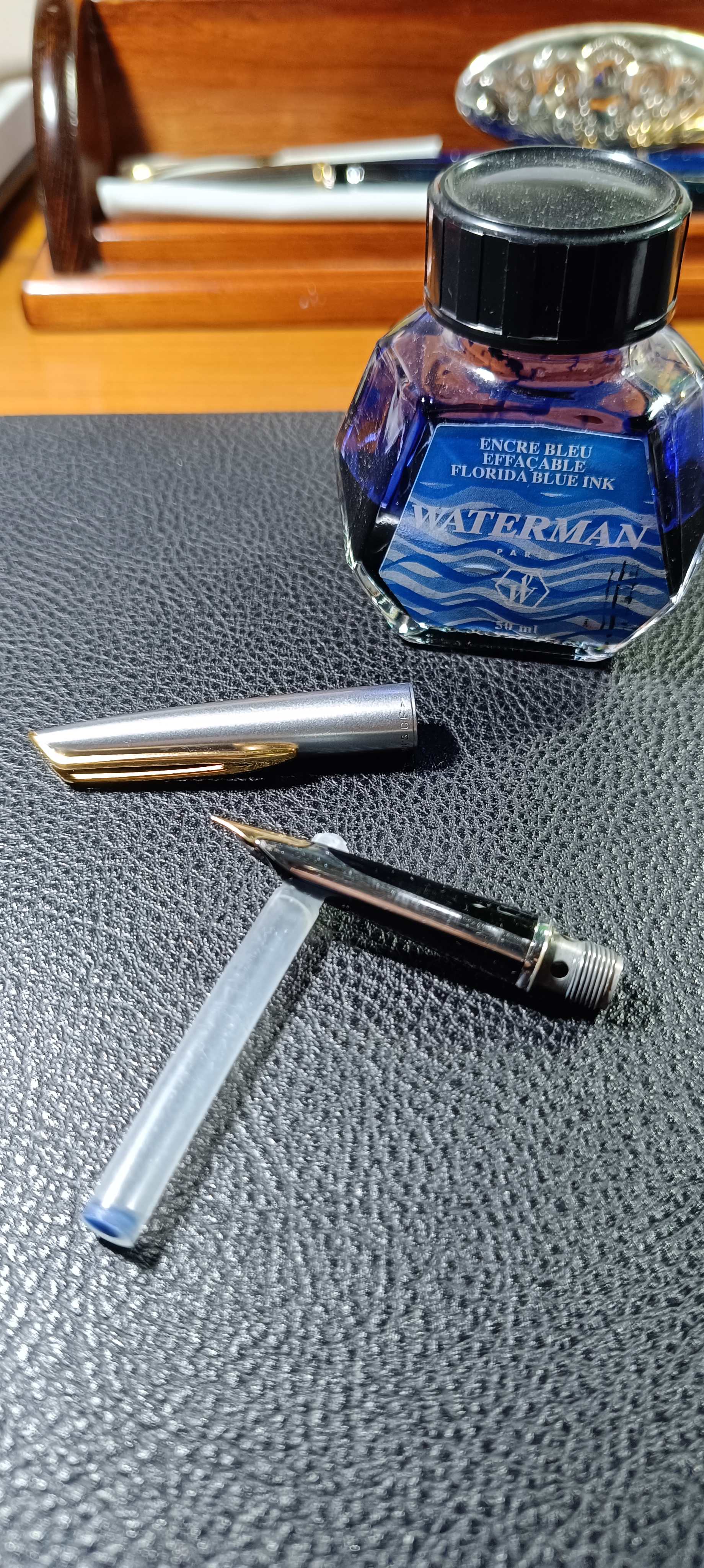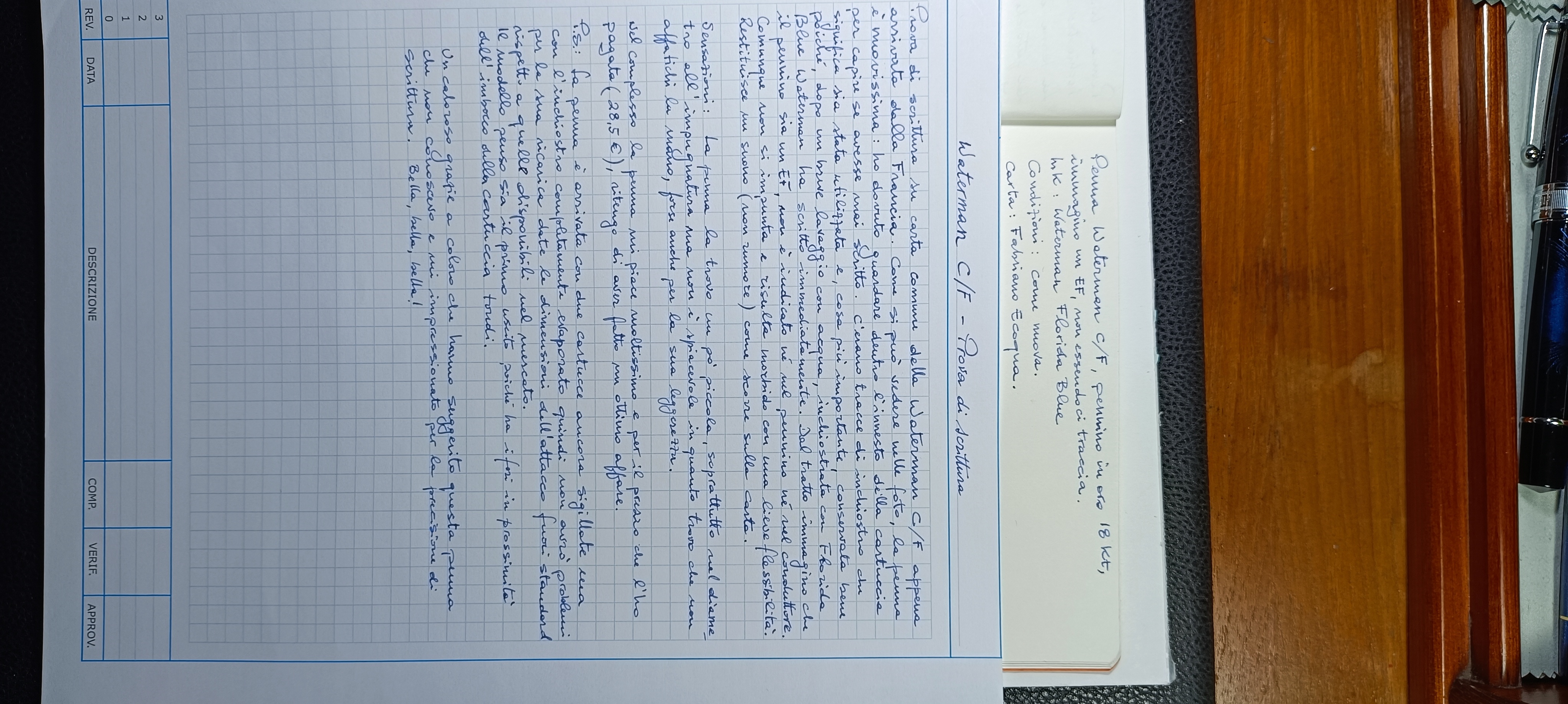 Dopo un breve lavaggio l'ho inchiostrata col Waterman Florida Blue e scrive benissimo. Il flusso è abbondante e costante nonostante il pennino sia un extra fine, almeno così mi pare (non ho trovato alcuna incisione circa la sua dimensione). Nonostante sia così fine, il pennino non gratta e rilascia un bellissimo fruscio.