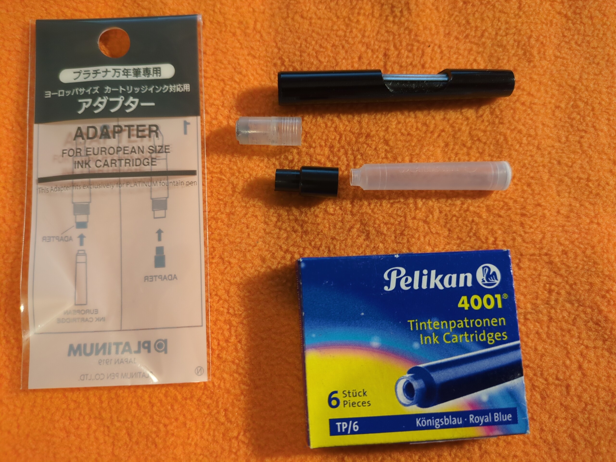 A questo punto - dopo varie inutili ricerche per trovare qualcosa, tra i converter e le cartucce che mi ritrovo avere nei cassetti, che si potesse utilizzare abbinandolo al terminale di attacco - mi sono ricordato dell'esistenza dell'adattatore Platinum: un piccolo accessorio (facilmente reperibile e dal costo molto basso) utilizzabile per adattare l'attacco delle stilografiche Platinum al formato "standard" (Pelikan) di cartucce e converter.