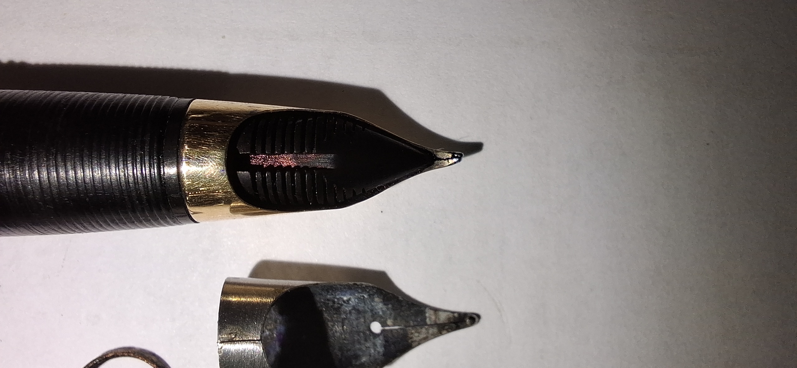 Ho notato che c'è una veretta che si avvita sulla sezione e sulla quale si incastra il pennino, il quale sulla parte di sotto presenta un apertura nelle parte più stretta non presente nel pennino di un altra Penco 53 che sembra non avere interruzioni.