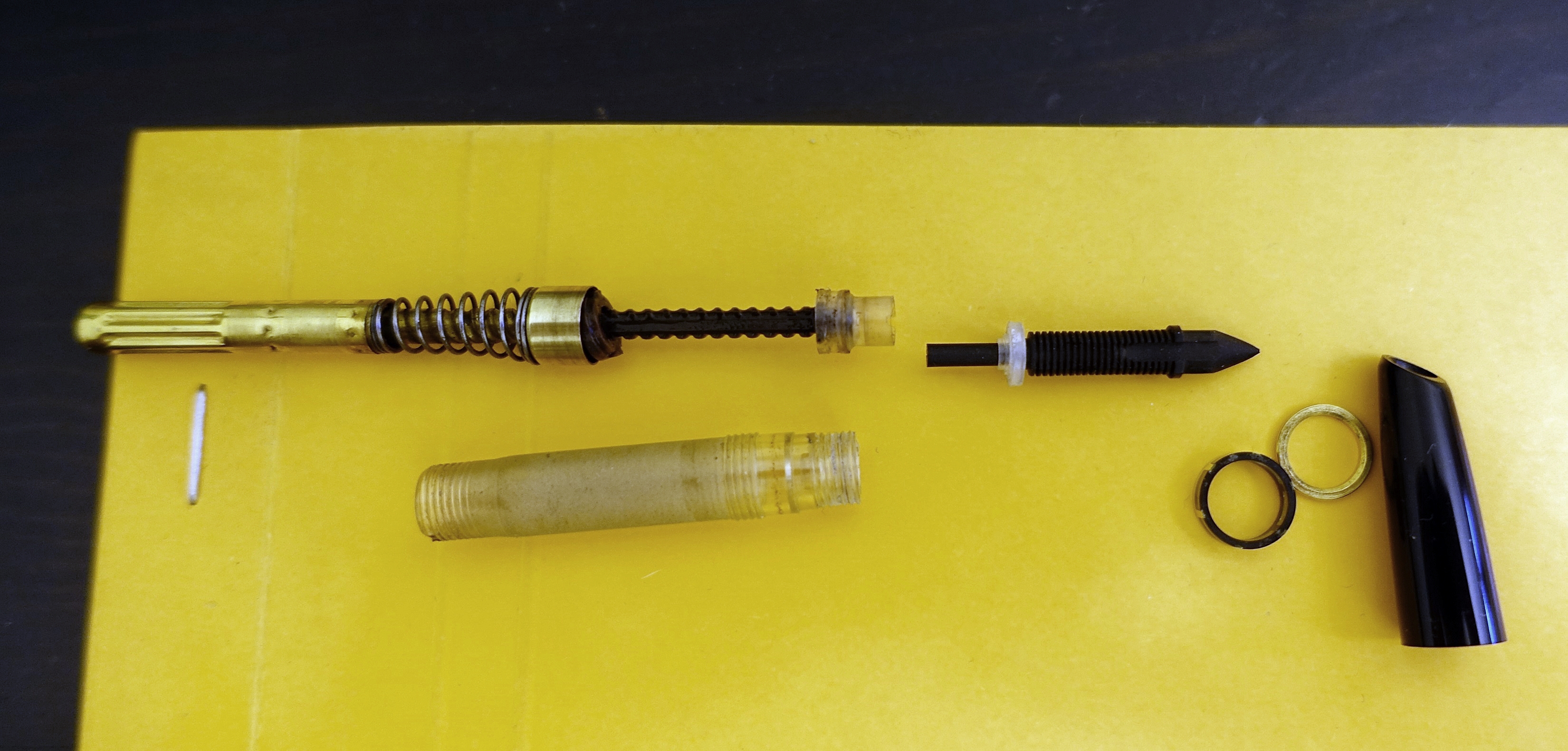 non capisco dove e come sia visibile. RM, mi è stato spiegato, è la concavita' sulla testa del pistone che trattiena una goccia d'inchiostro. Nel video il pistone si cala sul pirolo nero che s'intravede anche in questa penna. Il pistone mi pare essere fatto in due cilindri sovrapposti uno grande ed uno piccolo.