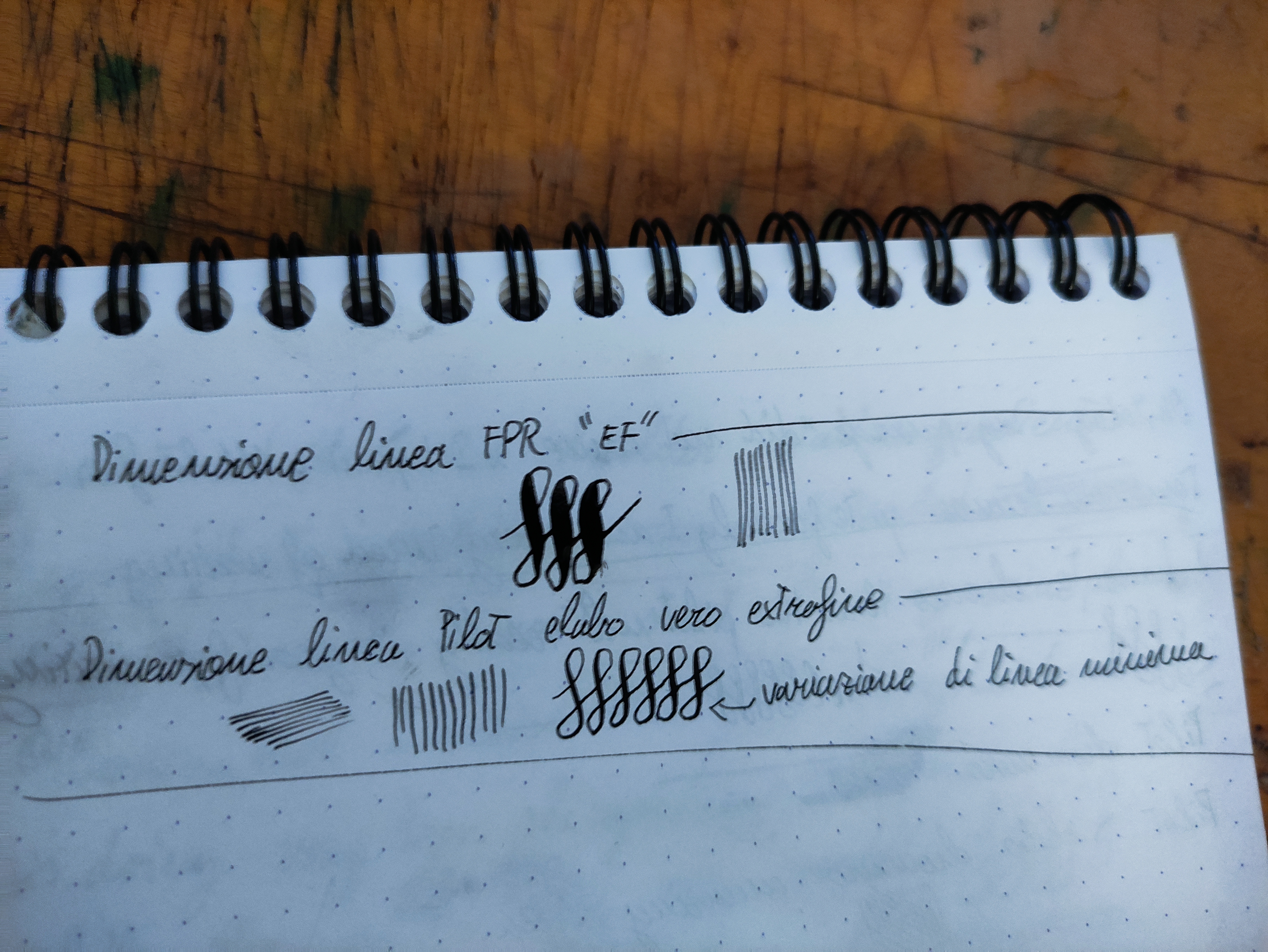 Volevo testare la dimensione del tratto con linea extrafine di un "vero extrafine giapponese" di cui ho sentito parlare tanto su internet, e quindi l'ho comparato con il pennino che ho limato personalmente. Il tratto pilot è visibilmente più fine e mi piace molto.