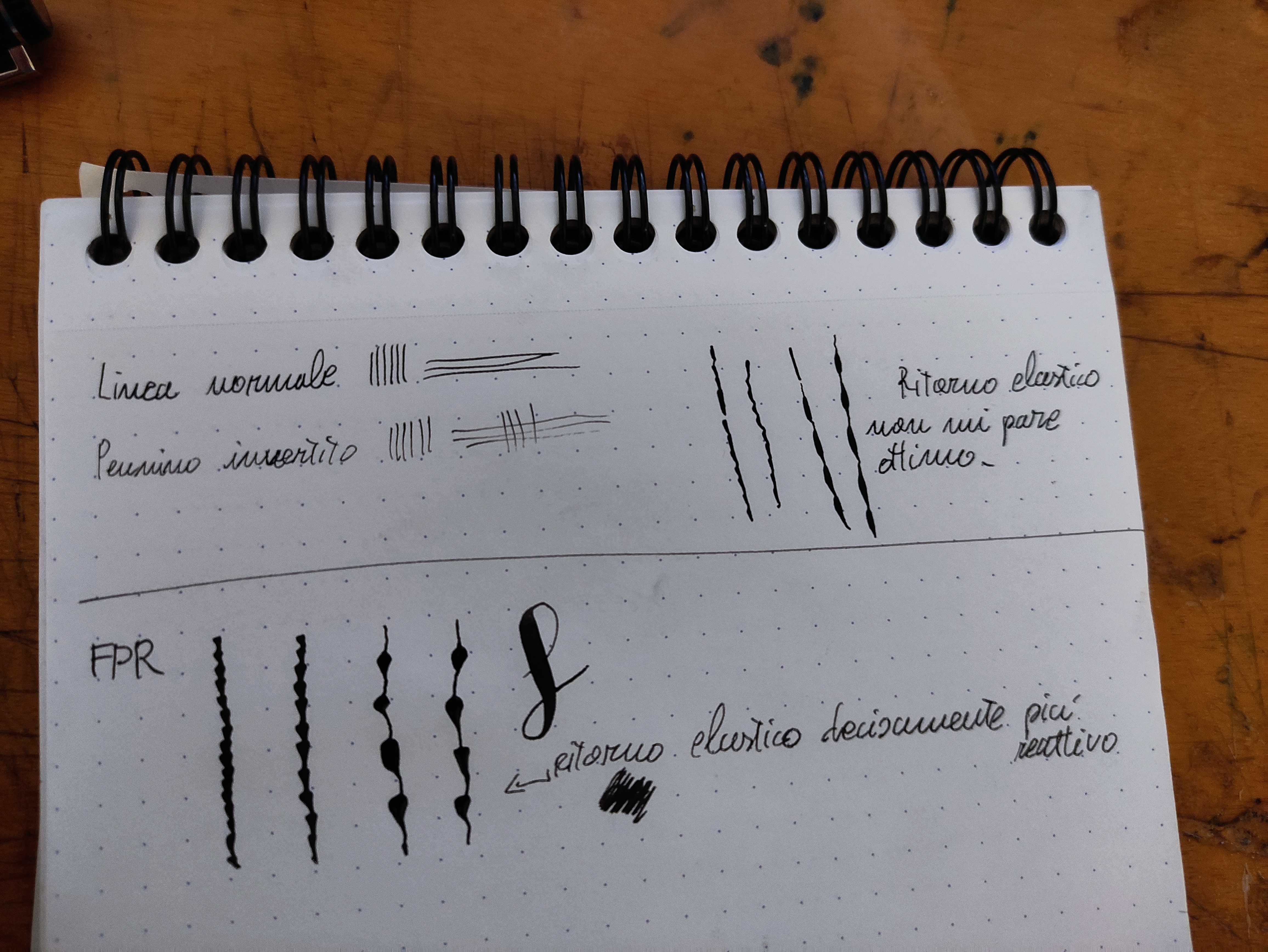 Qua ho primariamente comparato il ritorno elastico e la divaricazione dei rebbi dei pennini. Devo dire che pilot elabo non è molto reattivo. Mi aspettavo di più o qualcosa di diverso. Scrittura al contrario è possibile e il tratto diventa molto molto fine sulla elabo.