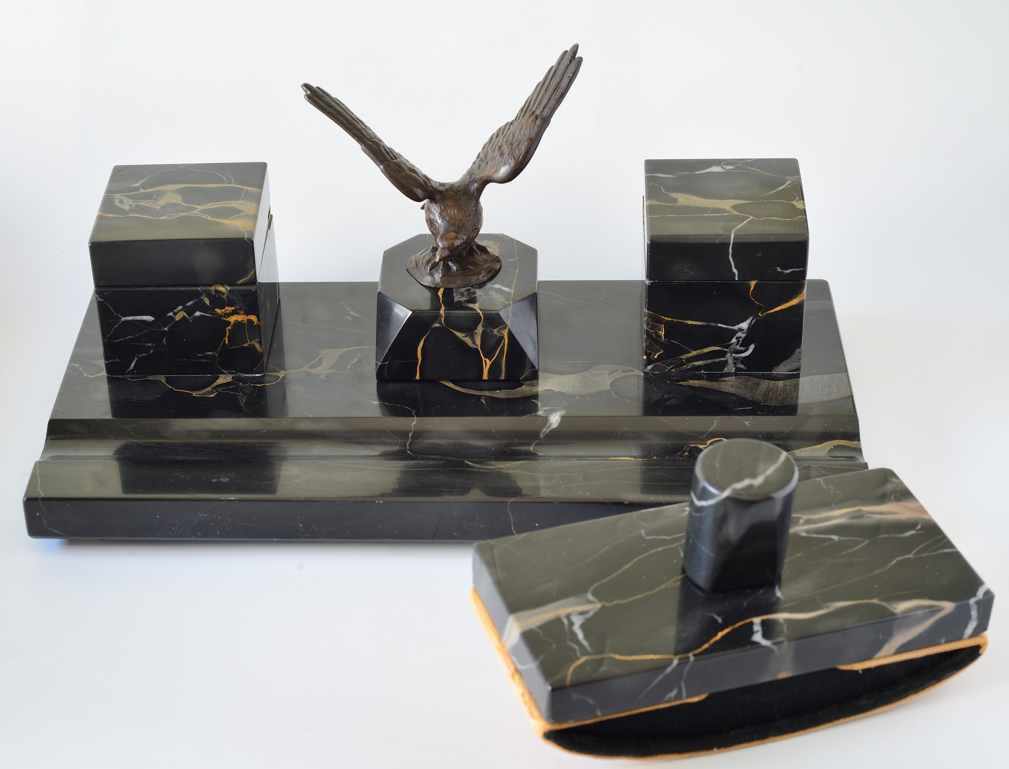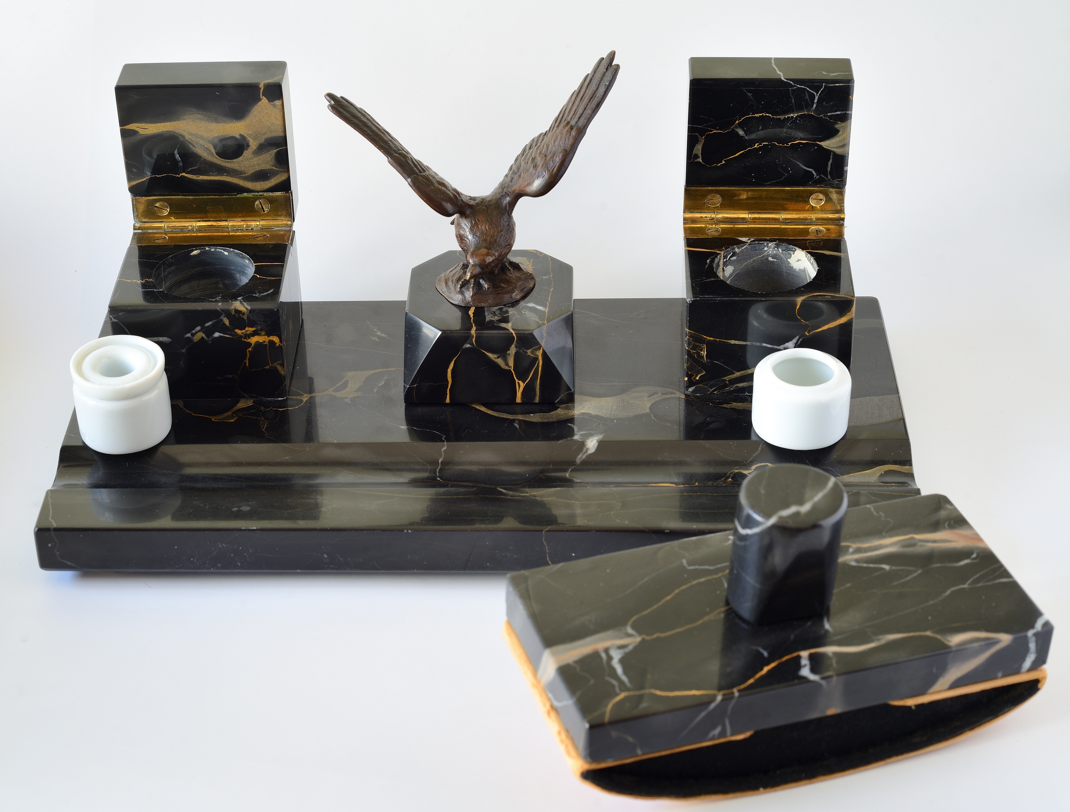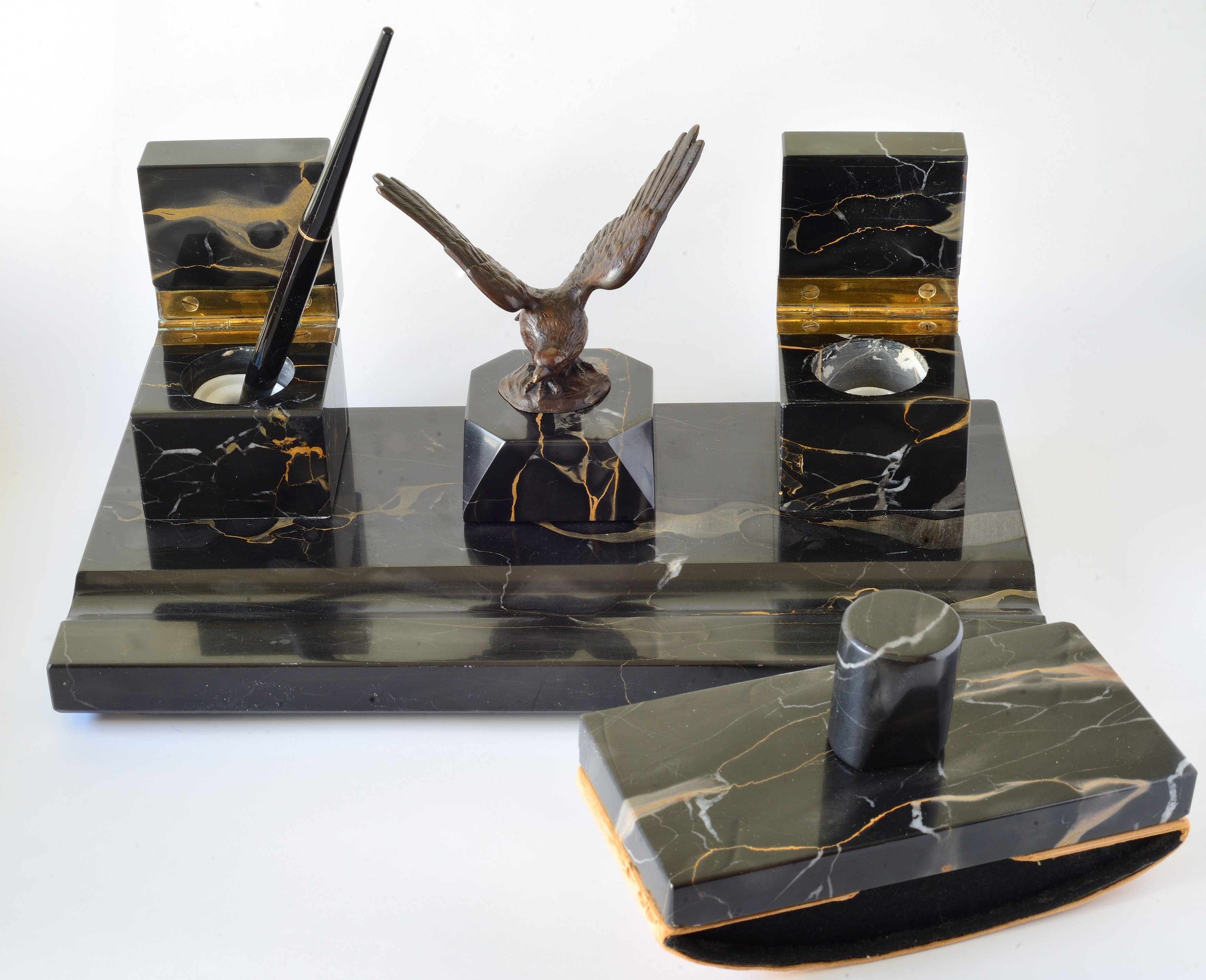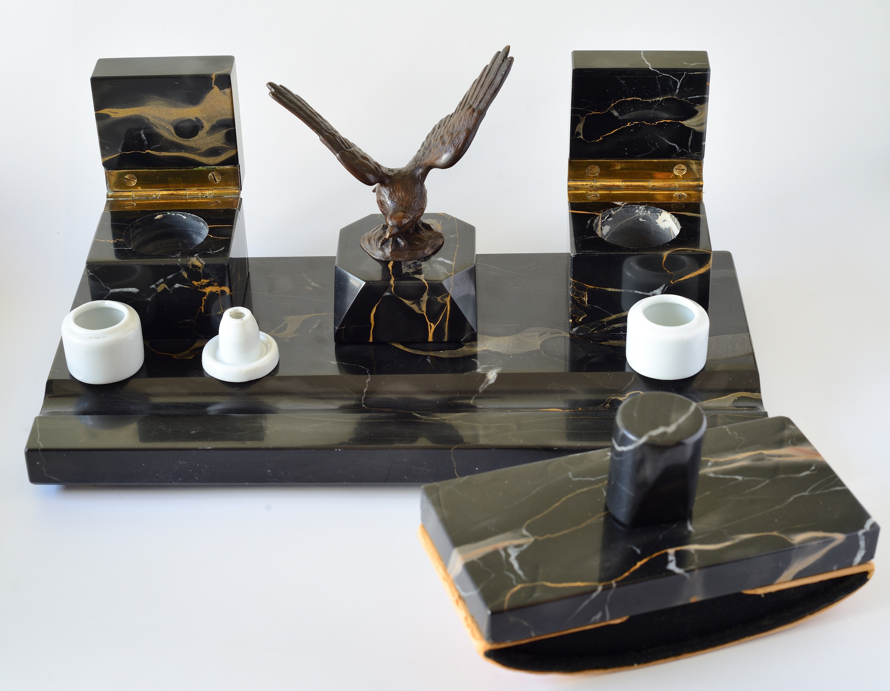 Non solo penne nei miei soliti giri per bancarelle, ecco qui recuperato un imponente calamaio da tavolo in marmo portoro (Marmo di Portovenere), con bicchierini in porcellana bianca ed aquila centrale in bronzo. Art Deco' databile agli anni '30 del secolo scorso. La base misura cm 30 x15, l'altezza, alle ali dell'aquila, è 13 cm.